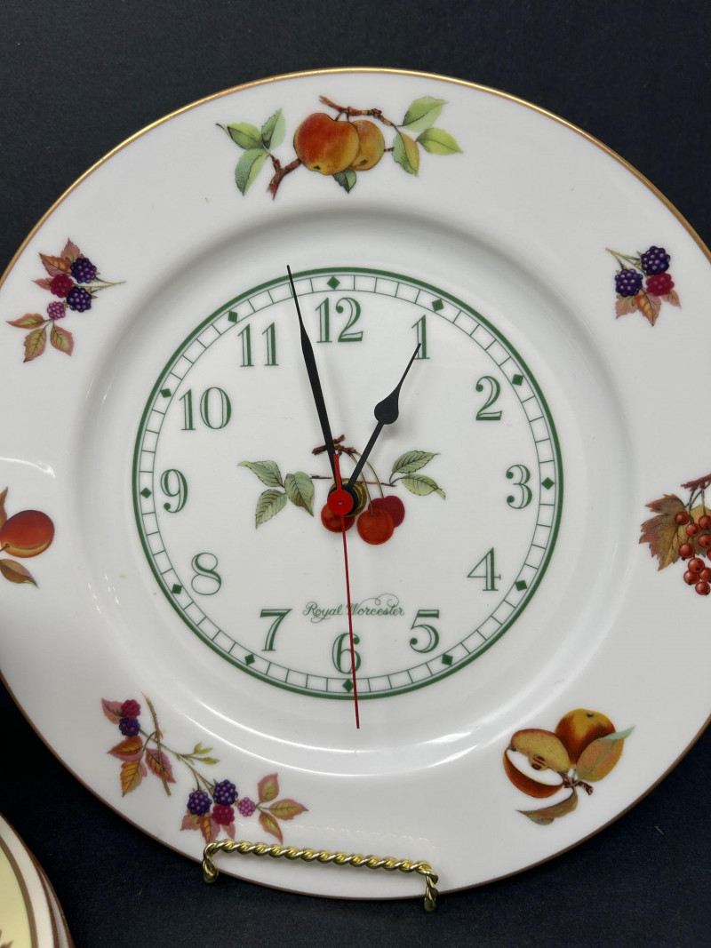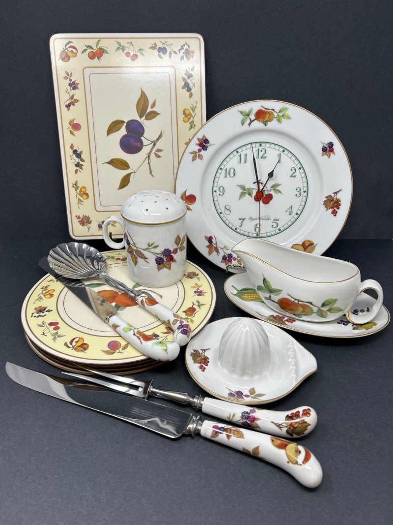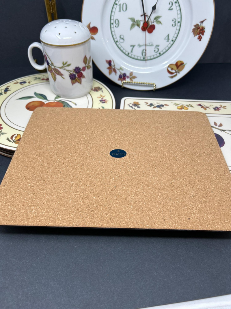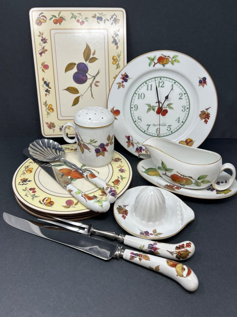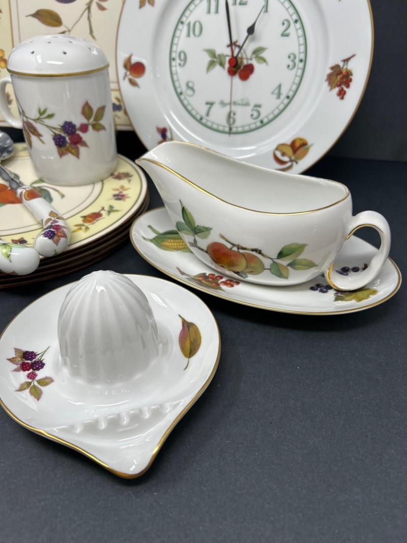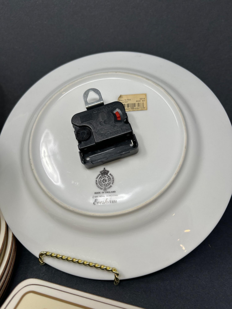Royal Worcester Evesham Gold Clock & Placemat Set A coordinated porcelain and tableware set from the Evesham Gold collection by Royal Worcester, featuring fine porcelain with gold trim and hand-painted style fruit and vegetable motifs. The set includes both functional kitchen accessories and decorative dining pieces: Includes: One citrus juicer: White porcelain with spout and handle, designed for juicing lemons, limes, and other citrus. One shaker: Porcelain shaker with matching Evesham fruit pattern, likely for salt or pepper. One carving set: Includes a stainless steel carving knife and fork with curved porcelain handles, decorated in various fruit designs. Marked "Sheffield England" on the metal. One serving set: Matching stainless steel serving spoon and knife with scallop detail and fruit-themed porcelain handles. One gravy boat and underplate: Fine porcelain boat with attached matching oval dish, all trimmed in gold. One wall clock: Functional quartz movement clock set in a round porcelain plate, decorated with fruit pattern and green numerals. Battery-powered with wall hanging hardware. Six round cork-backed placemats: Feature central fruit designs and gold-toned border, 10" diameter. Six rectangular cork-backed placemats: Match the round design with assorted fruit illustrations, 9" x 12".