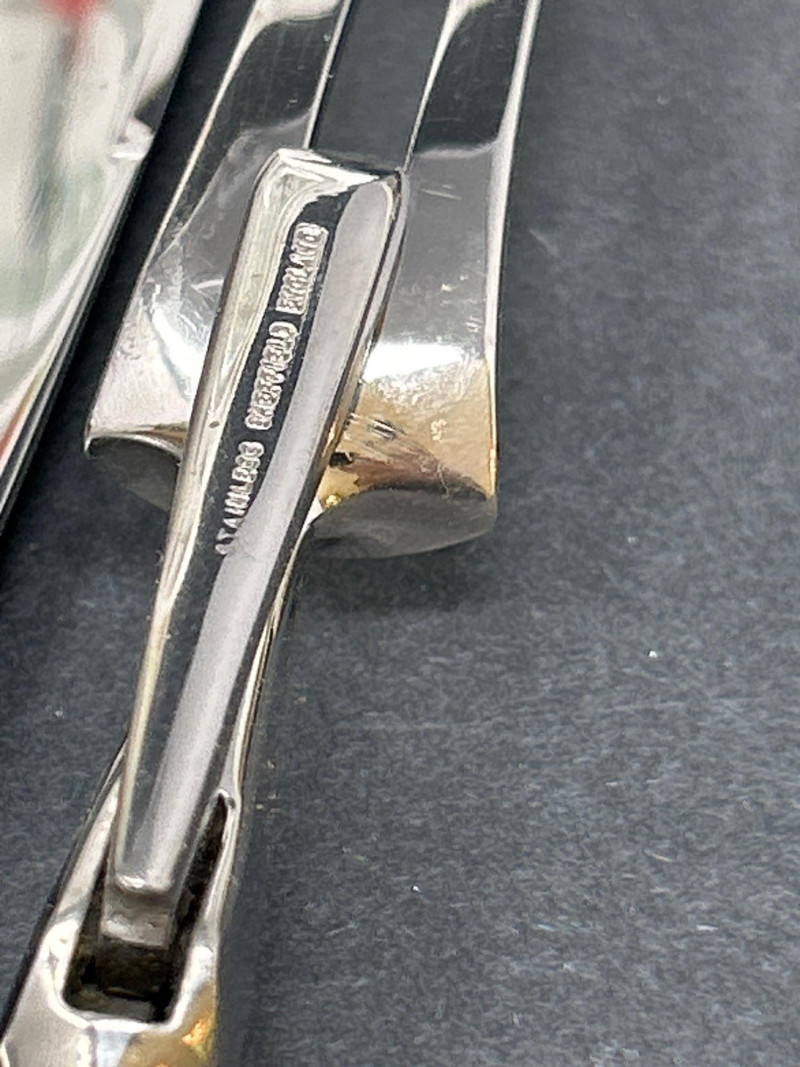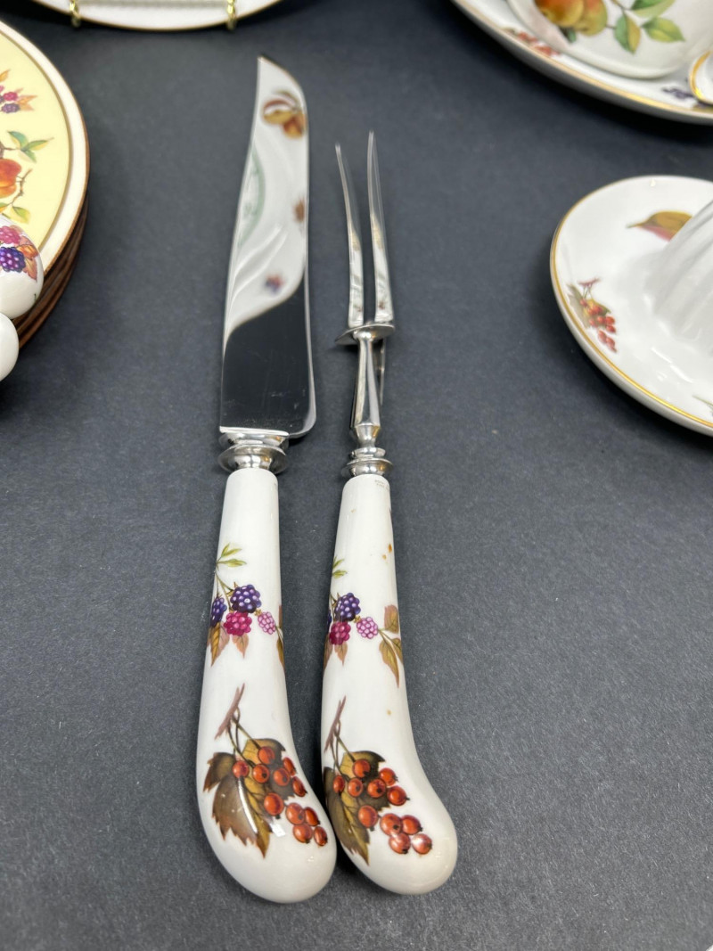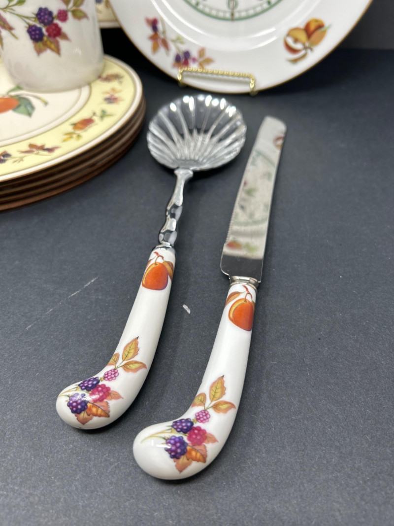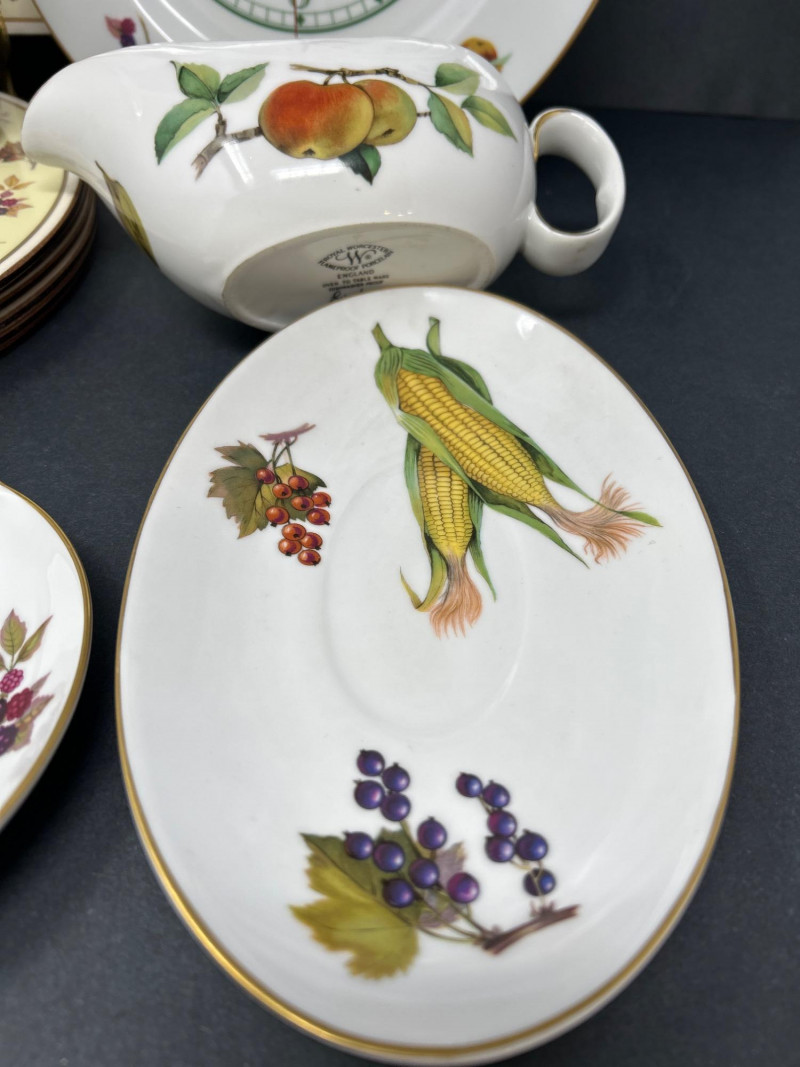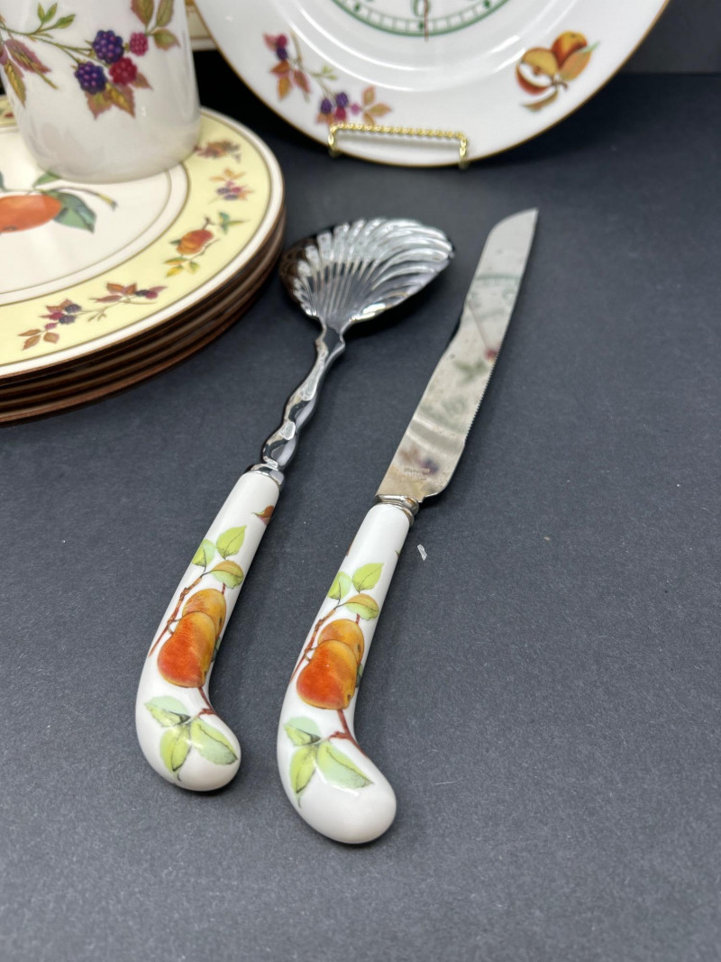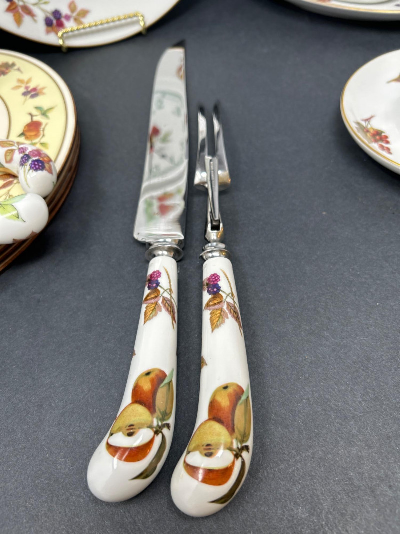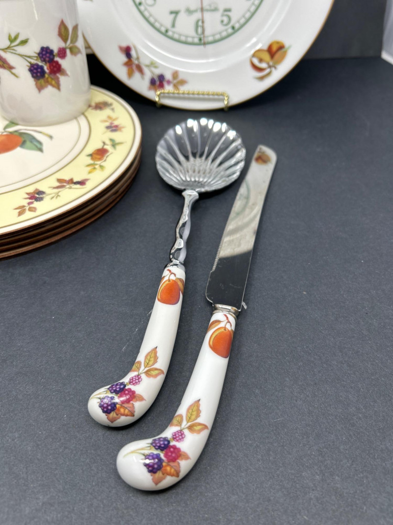 Royal Worcester Evesham Gold Clock & Placemat Set A coordinated porcelain and tableware set from the Evesham Gold collection by Royal Worcester, featuring fine porcelain with gold trim and hand-painted style fruit and vegetable motifs. The set includes both functional kitchen accessories and decorative dining pieces: Includes: One citrus juicer: White porcelain with spout and handle, designed for juicing lemons, limes, and other citrus. One shaker: Porcelain shaker with matching Evesham fruit pattern, likely for salt or pepper. One carving set: Includes a stainless steel carving knife and fork with curved porcelain handles, decorated in various fruit designs. Marked "Sheffield England" on the metal. One serving set: Matching stainless steel serving spoon and knife with scallop detail and fruit-themed porcelain handles. One gravy boat and underplate: Fine porcelain boat with attached matching oval dish, all trimmed in gold. One wall clock: Functional quartz movement clock set in a round porcelain plate, decorated with fruit pattern and green numerals. Battery-powered with wall hanging hardware. Six round cork-backed placemats: Feature central fruit designs and gold-toned border, 10" diameter. Six rectangular cork-backed placemats: Match the round design with assorted fruit illustrations, 9" x 12".