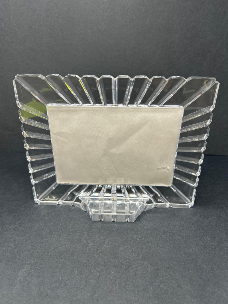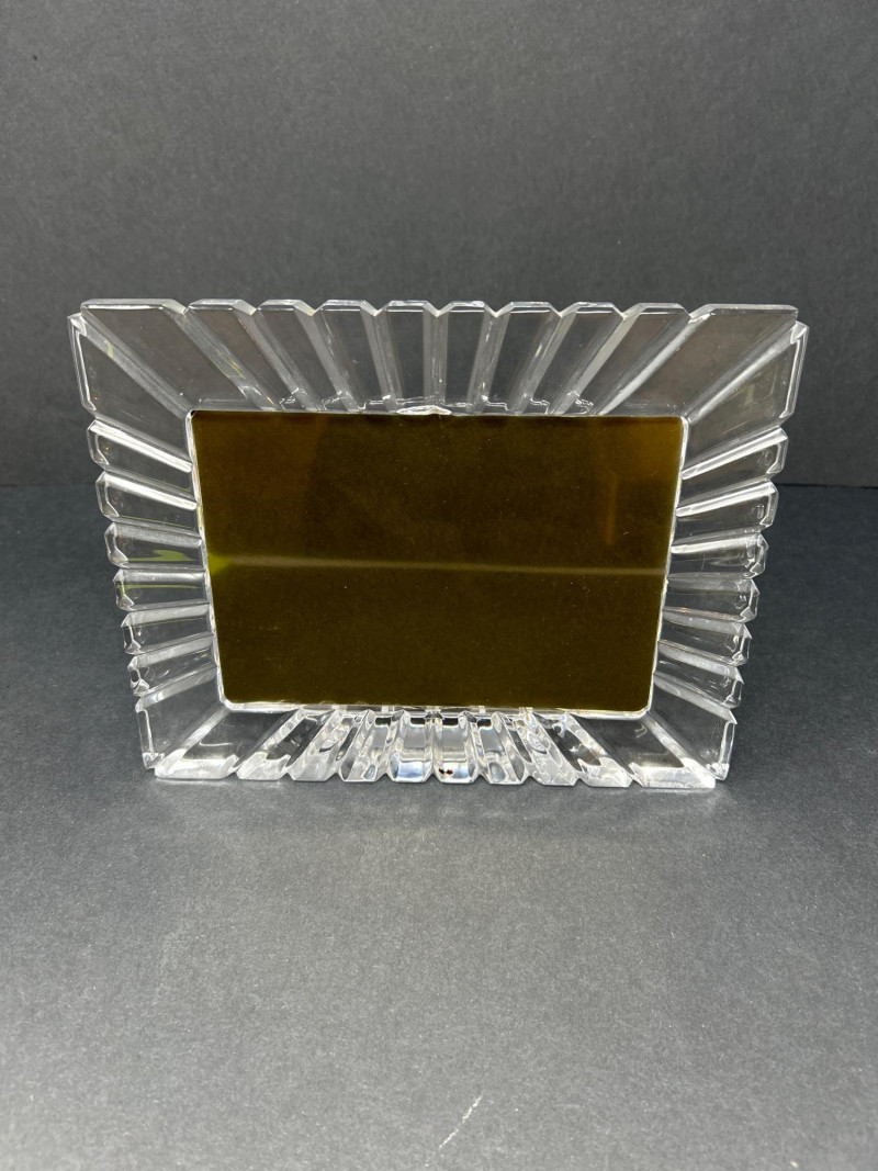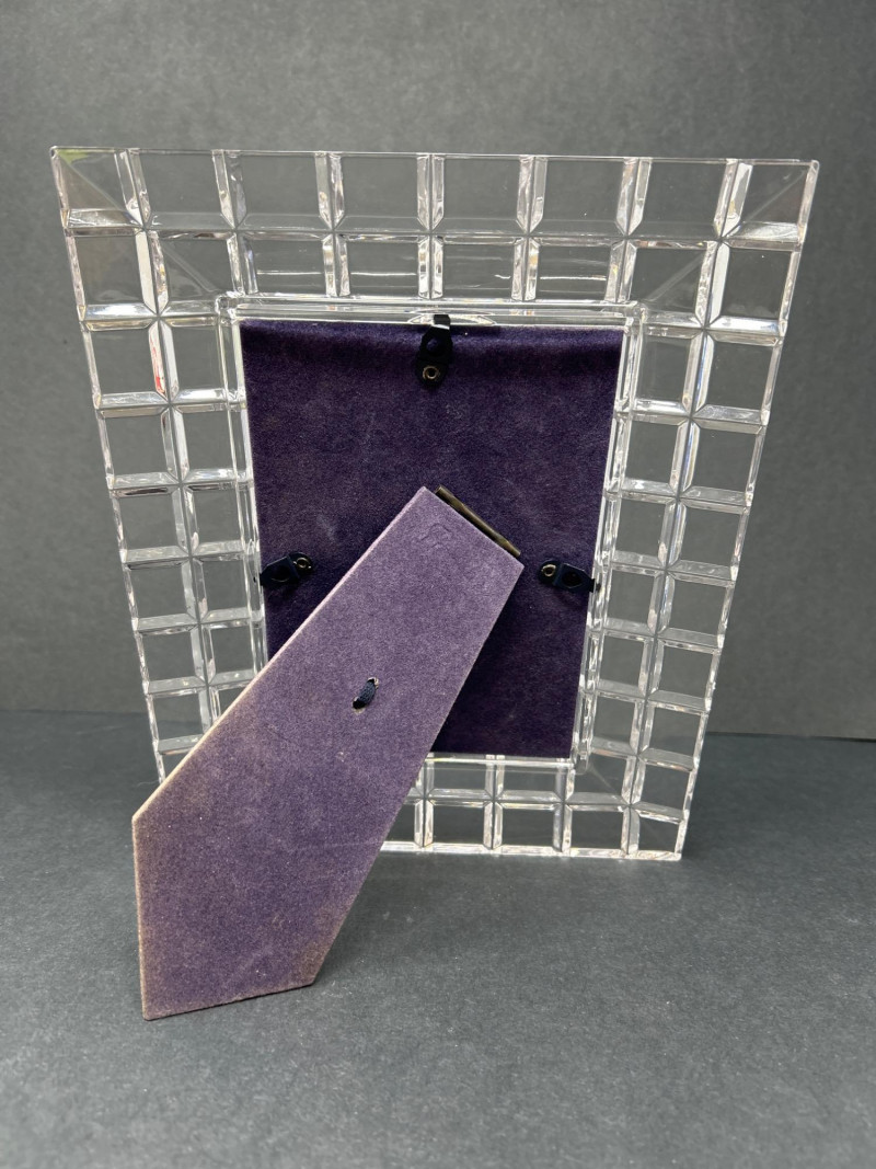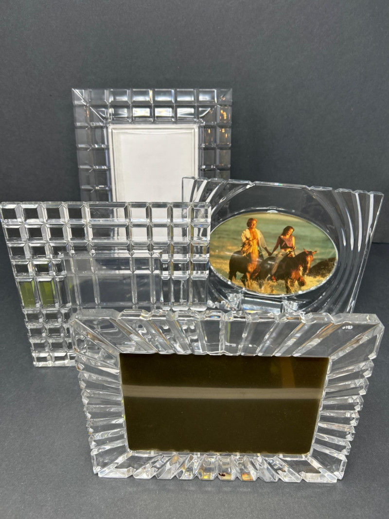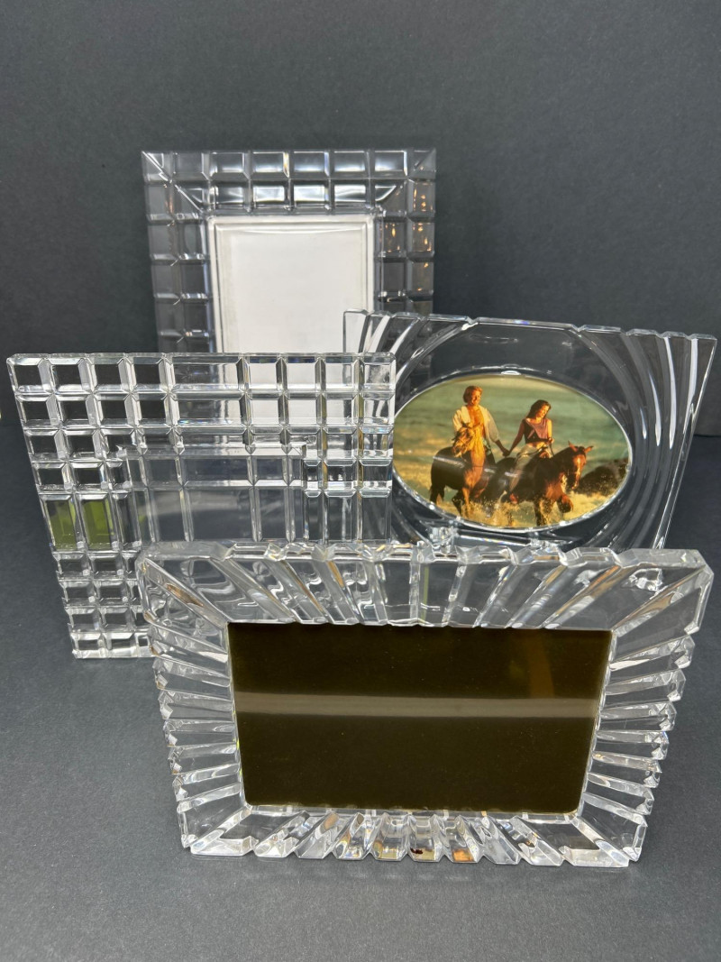 Waterford Frame Set Set of four Waterford crystal photo frames in various shapes and styles, each with a signature cut-glass design. Includes: One square frame, 8" x 8" One vertical rectangular frame with stand One horizontal rectangular frame with flared edges One round frame with curved panel accents All pieces feature clear crystal bodies with geometric or fan-cut patterns. Some frames include velvet backings with stands for tabletop display. Measurements: Square frame: 8" x 8"