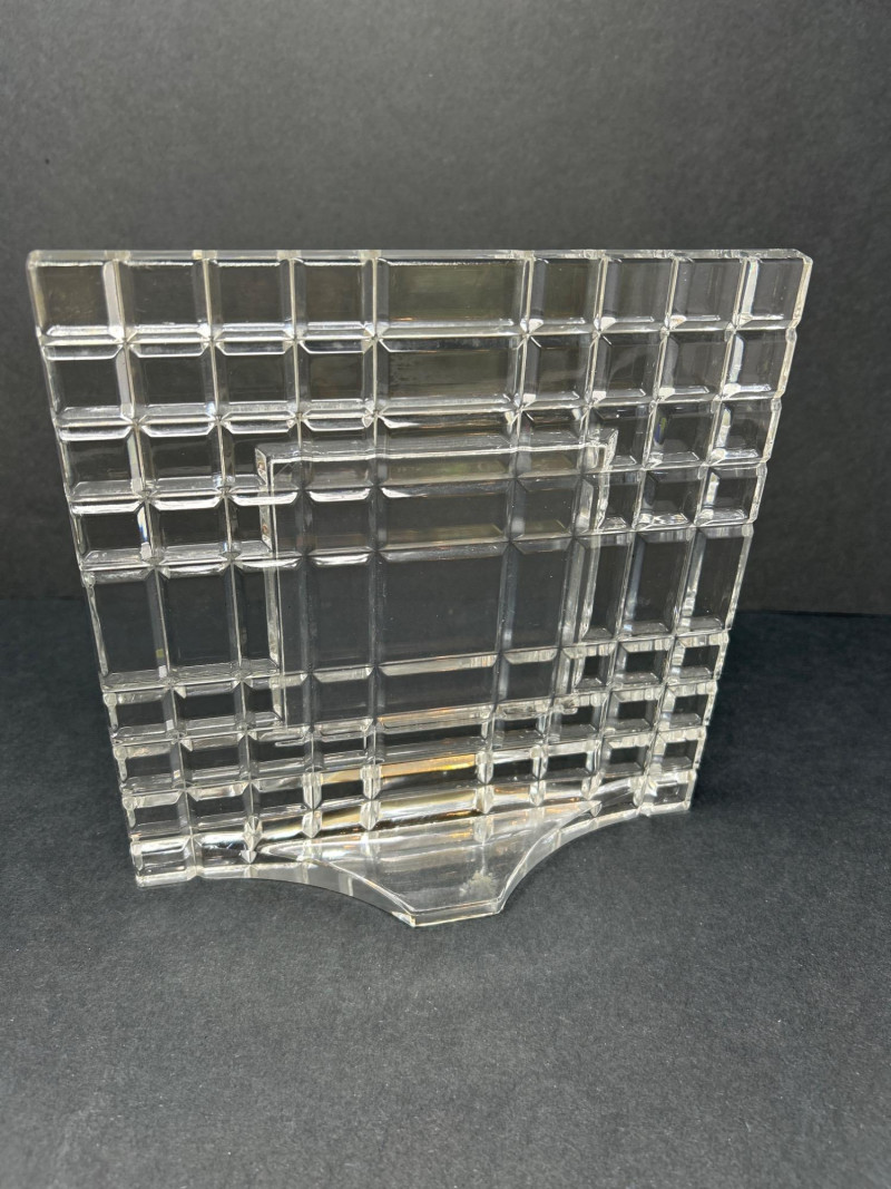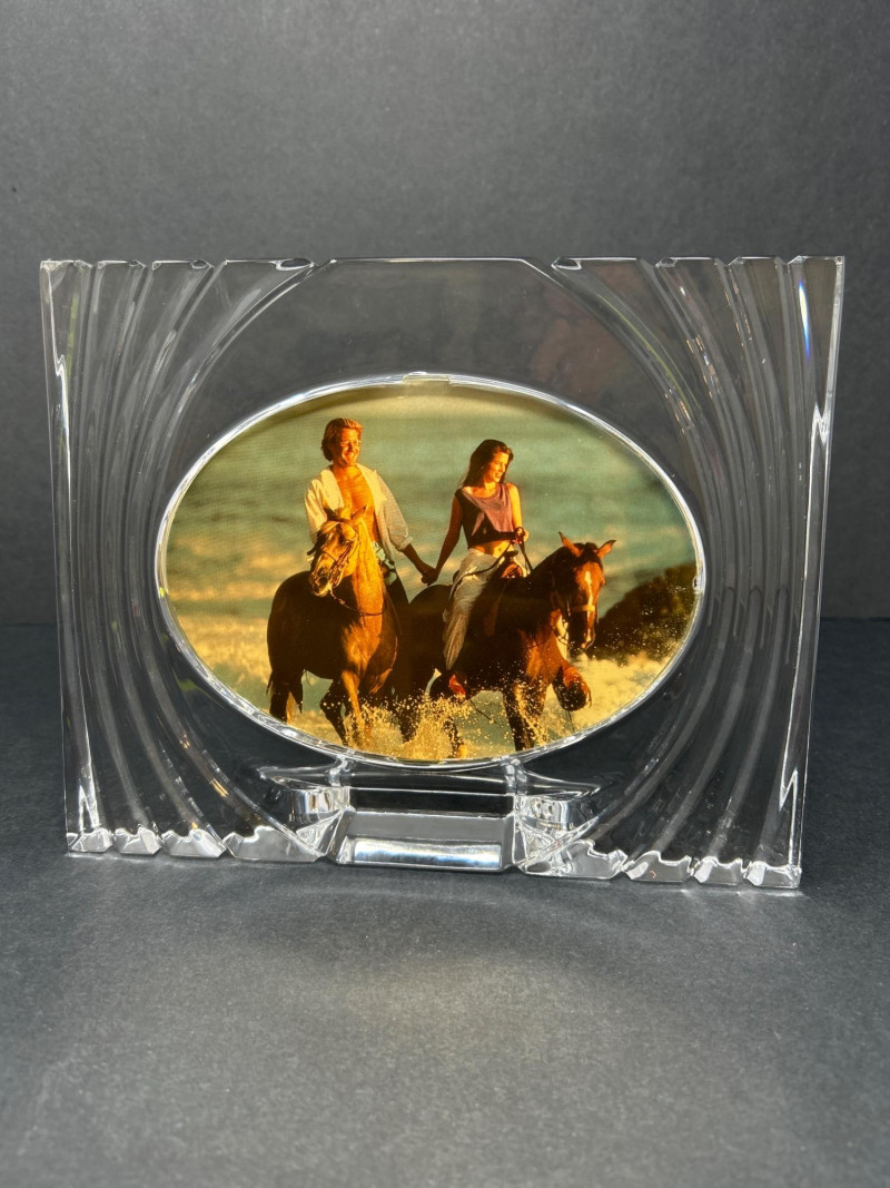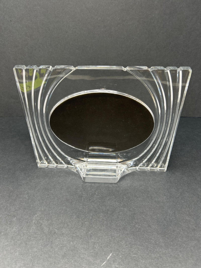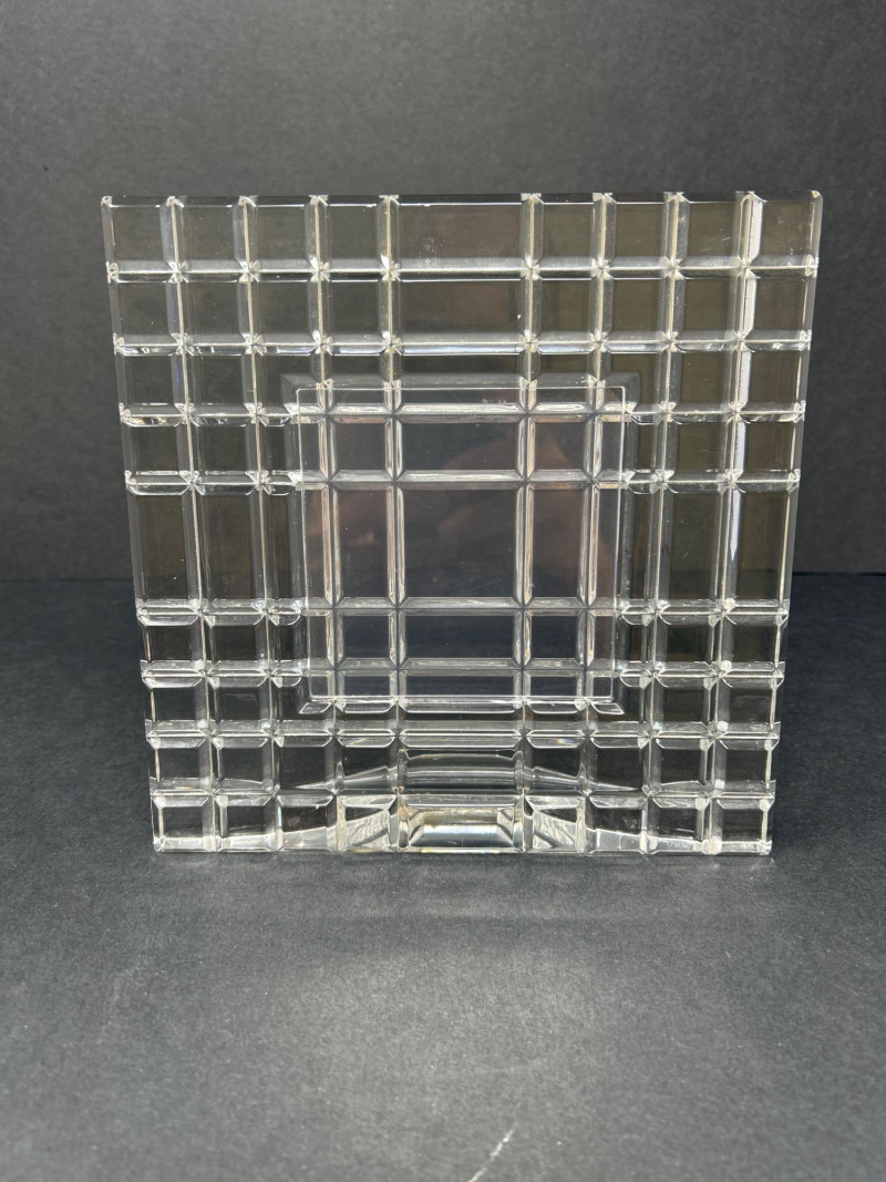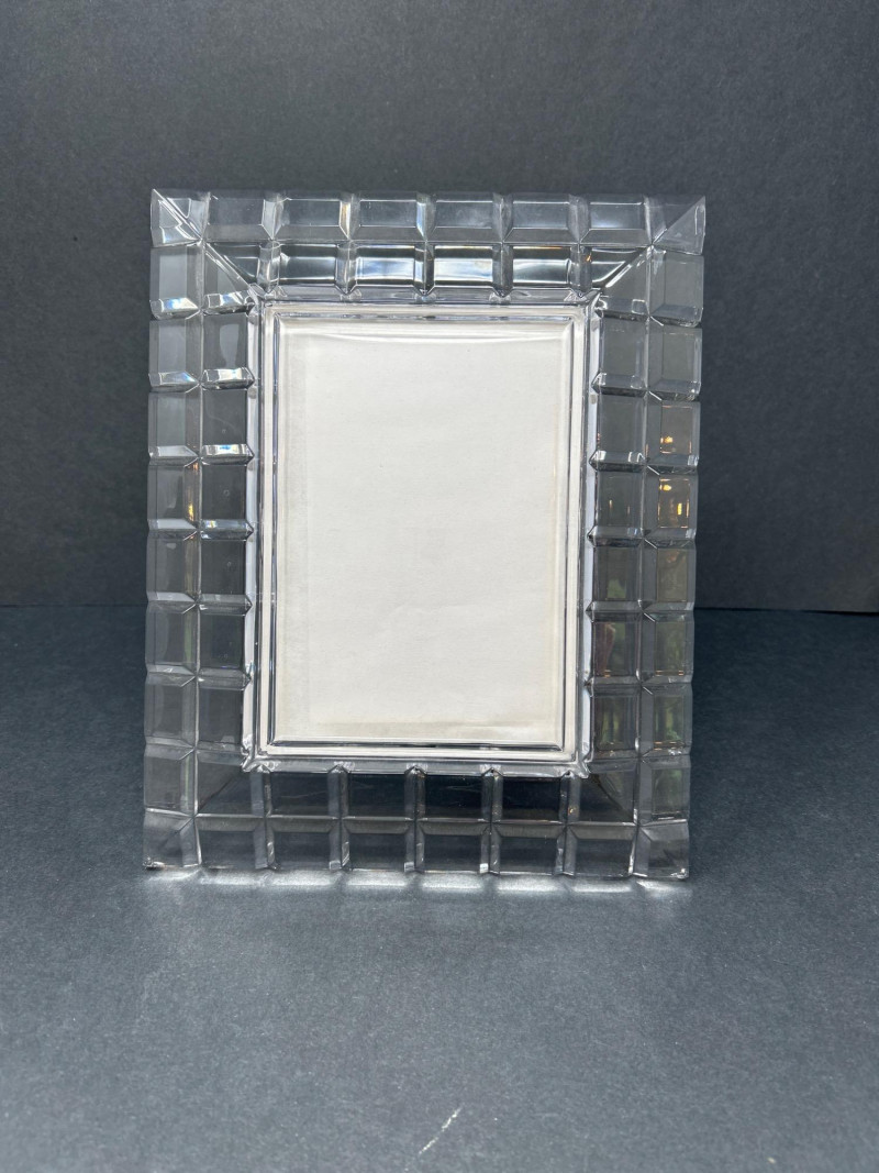 Waterford Frame Set Set of four Waterford crystal photo frames in various shapes and styles, each with a signature cut-glass design. Includes: One square frame, 8" x 8" One vertical rectangular frame with stand One horizontal rectangular frame with flared edges One round frame with curved panel accents All pieces feature clear crystal bodies with geometric or fan-cut patterns. Some frames include velvet backings with stands for tabletop display. Measurements: Square frame: 8" x 8"