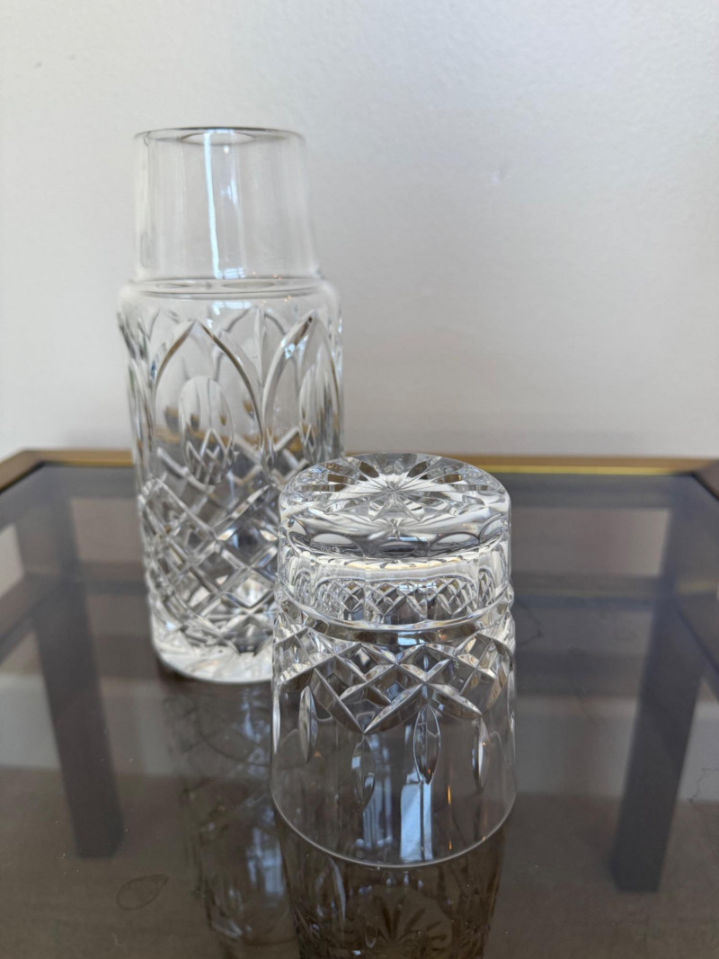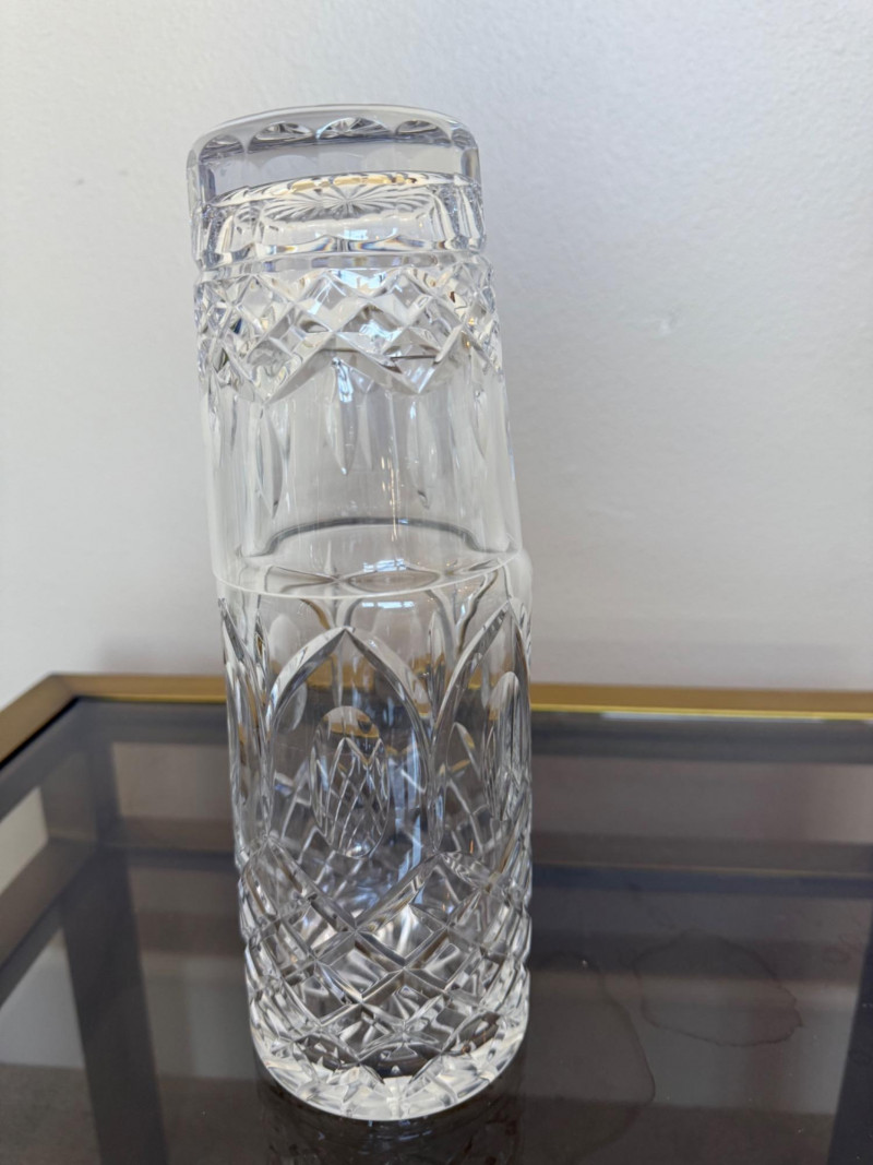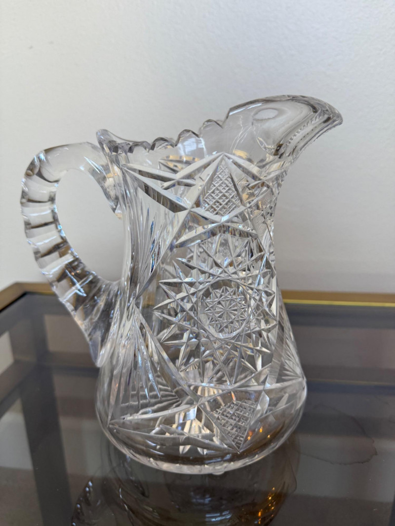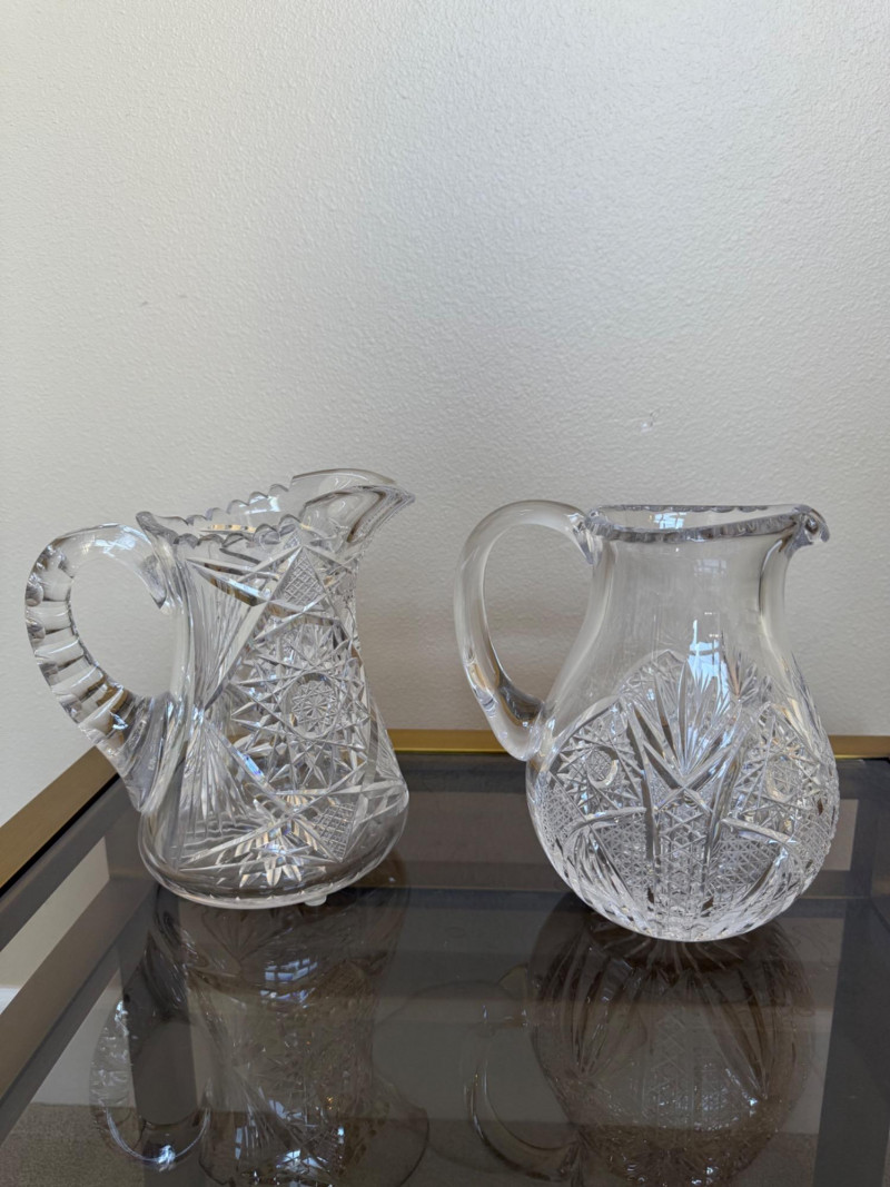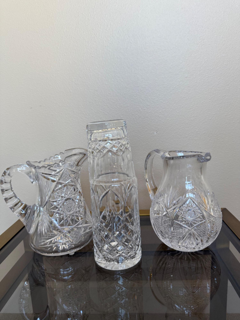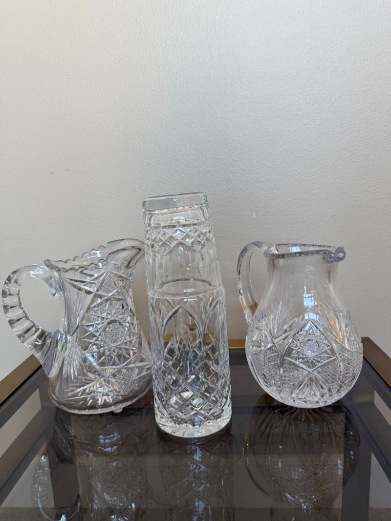Two Cut Glass Pitchers and One Table Top Water Pitcher Set includes three clear cut glass vessels with deep cut patterns: Two handled pitchers with matching geometric and starburst designs One tall tabletop water pitcher with flared spout and ornate handle Each piece features scalloped rims and intricate cut detailing throughout. Measurements: