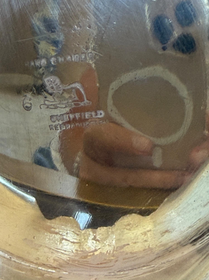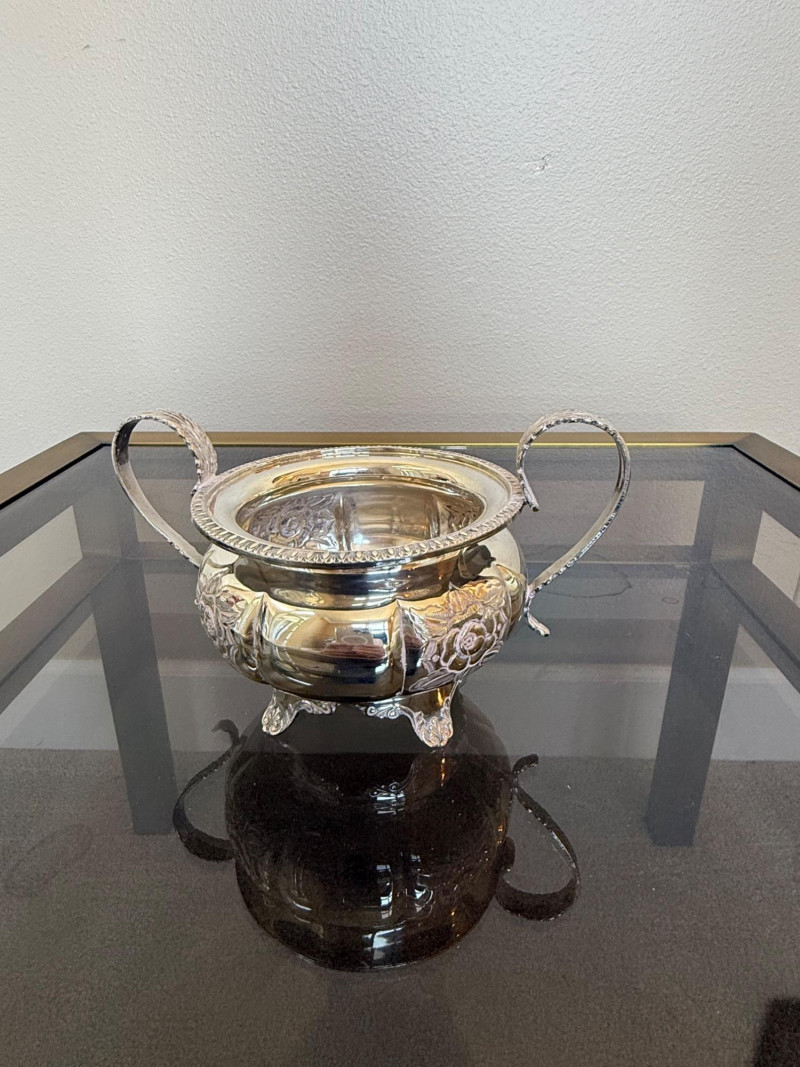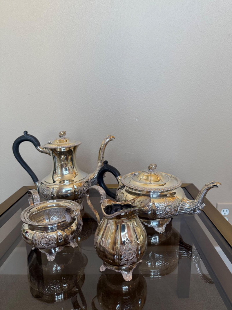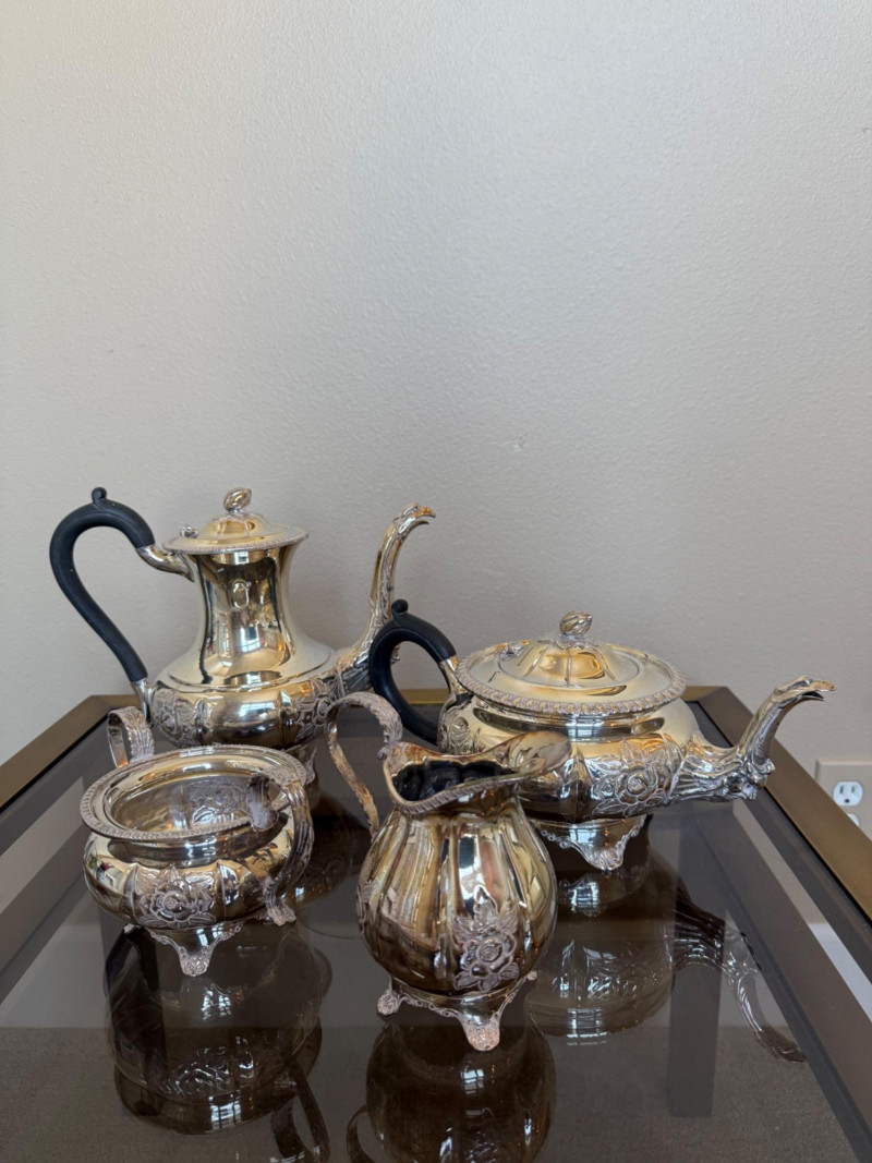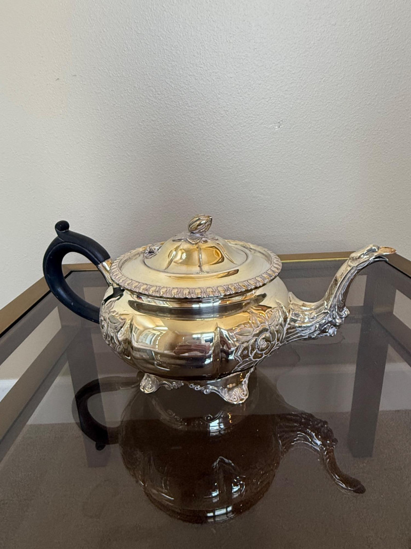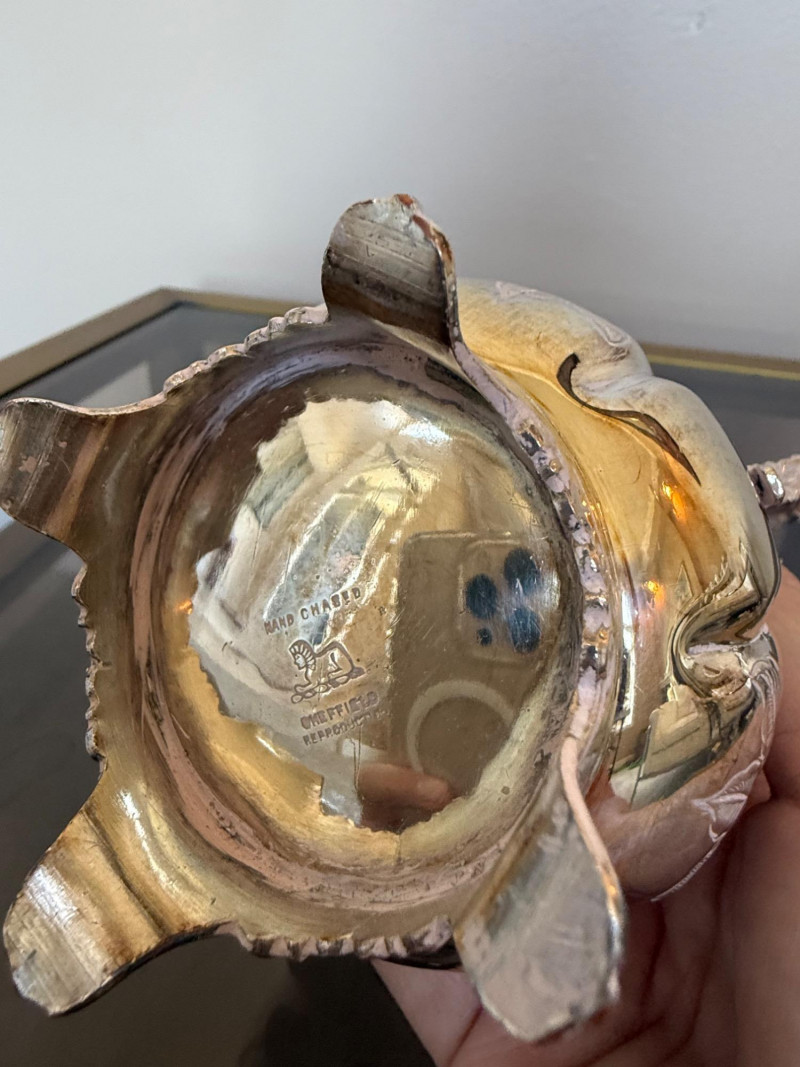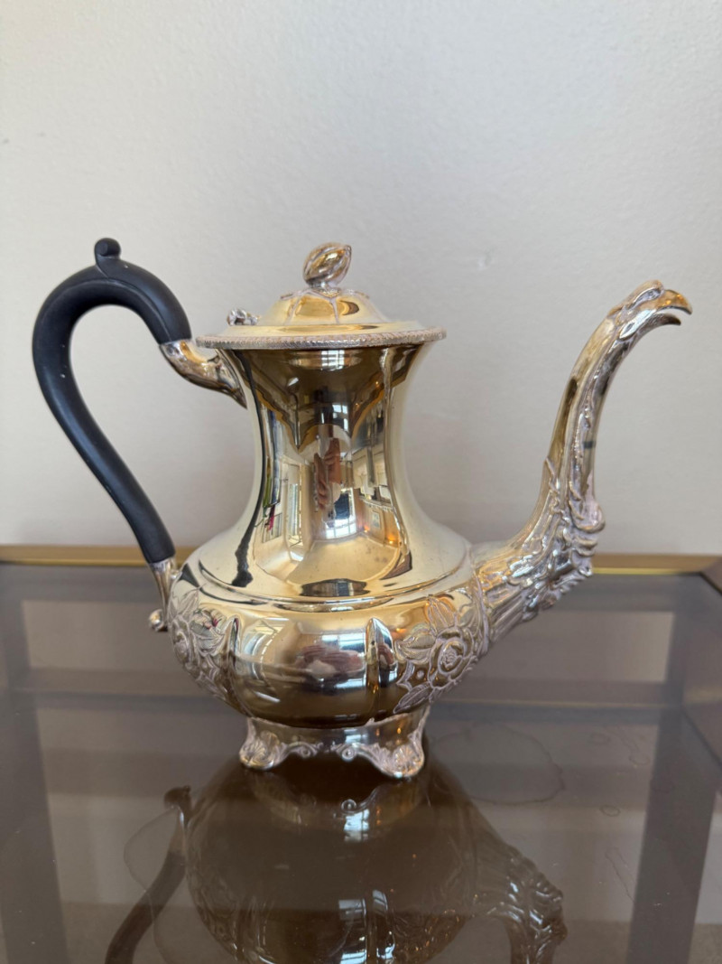 Cheffield Silverplate Tea Set – Sugar Bowl, Creamer, and Two Teapots Five-piece Cheffield silverplate tea service set includes: One teapot with black handle One taller coffee or hot water pot with black handle Lidded sugar bowl with dual handles Creamer with ornate handle and spout Open waste bowl or slop bowl Each piece features decorative feet, ornate floral detailing, and matching motifs. Marked "Cheffield Silverplate" on underside. Measurements: