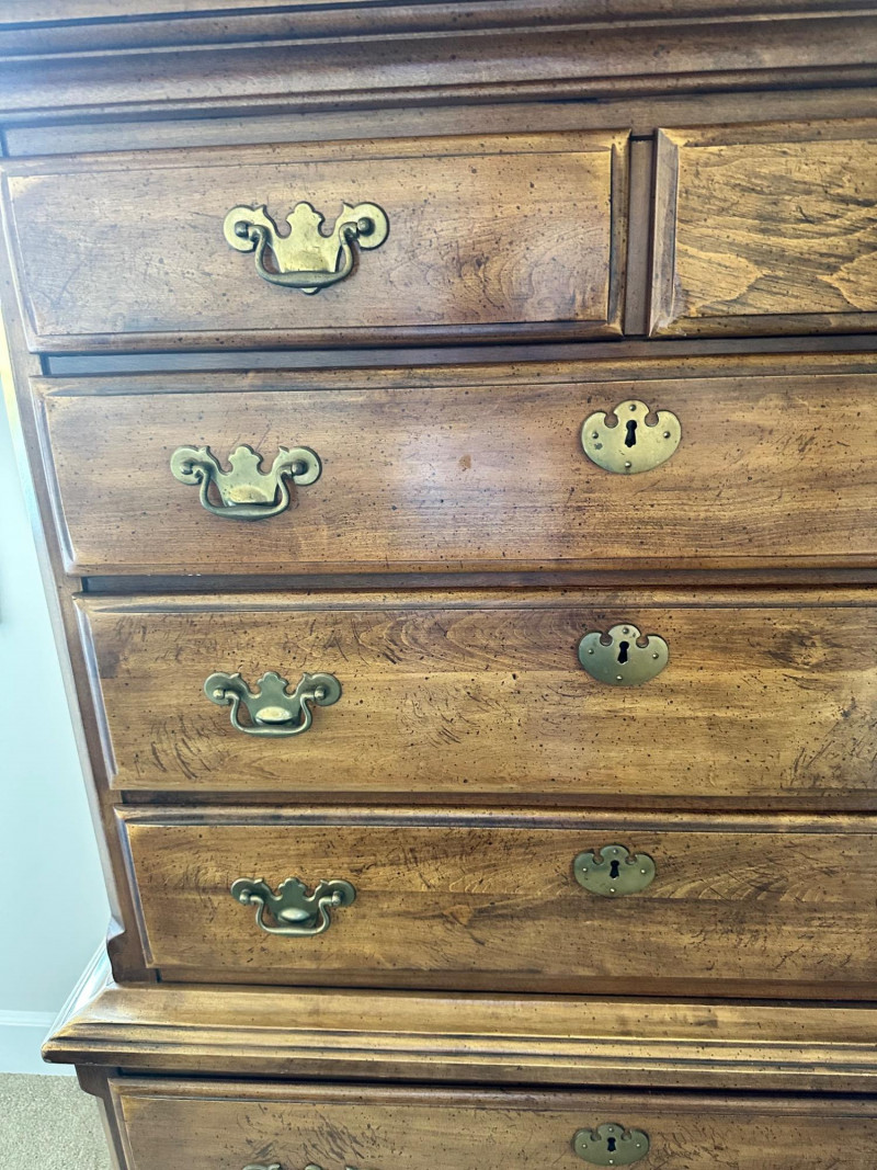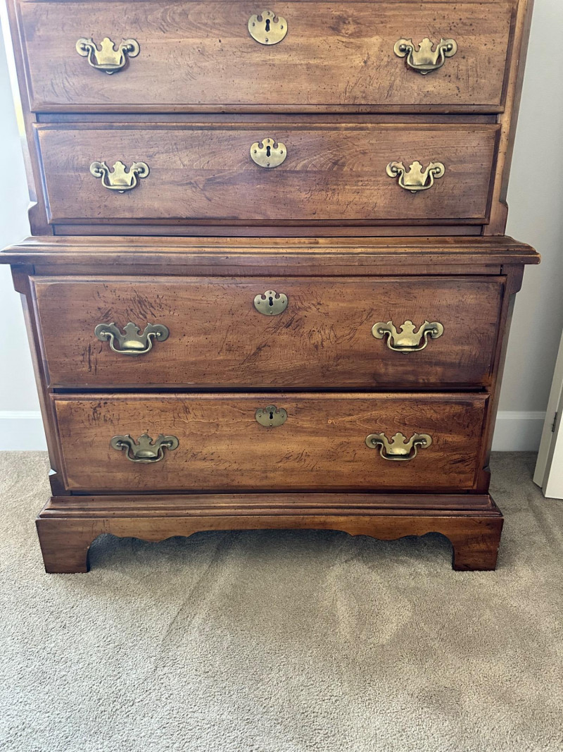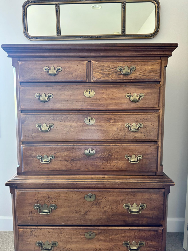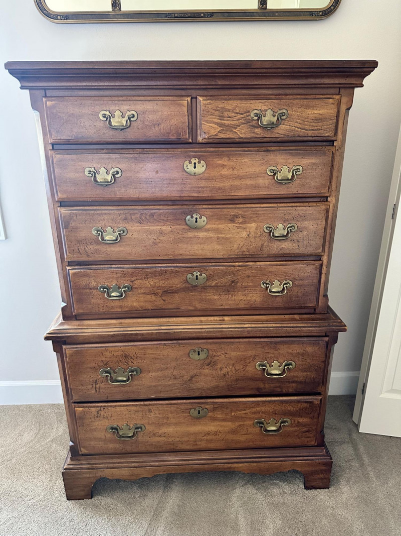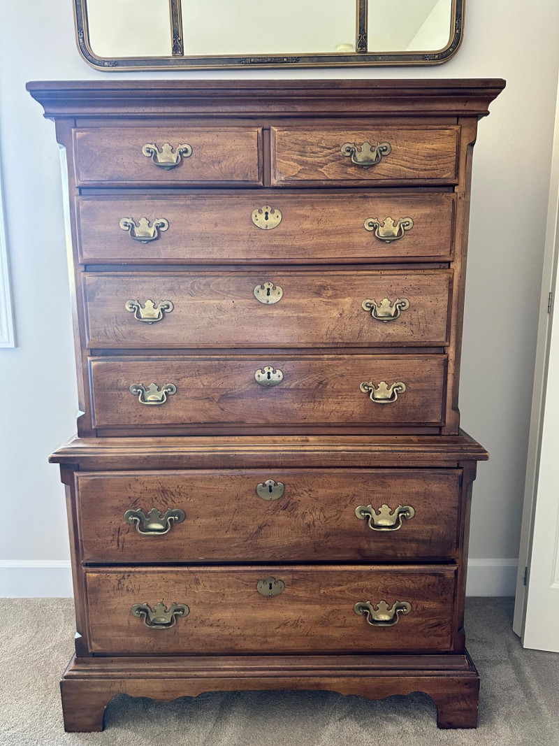 English Colonial Chest-On-Chest Dresser – 58” Tall English Colonial style chest-on-chest dresser with molded top, brass hardware, and traditional bracket feet. Features seven drawers in total—two small upper drawers and five full-size drawers—offering ample storage. Drawer interiors are unfinished wood. Please note: the top surface has significant scratching and wear; refinishing is recommended. Measurements: