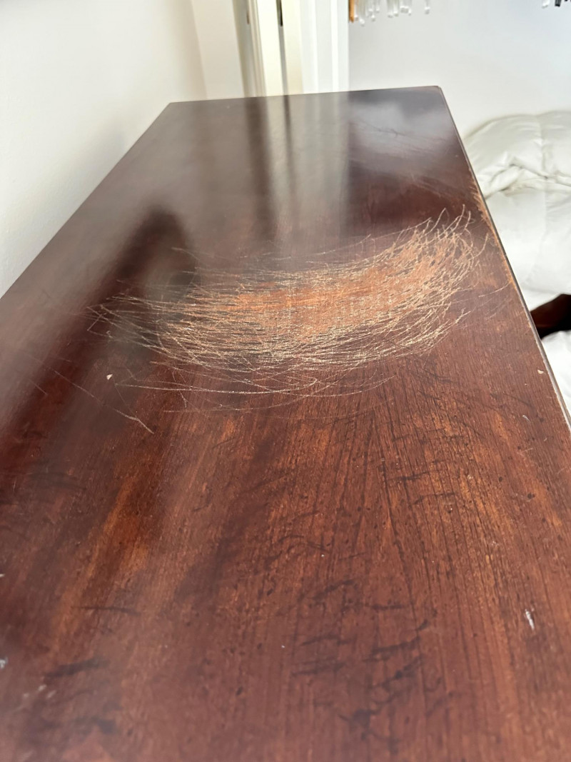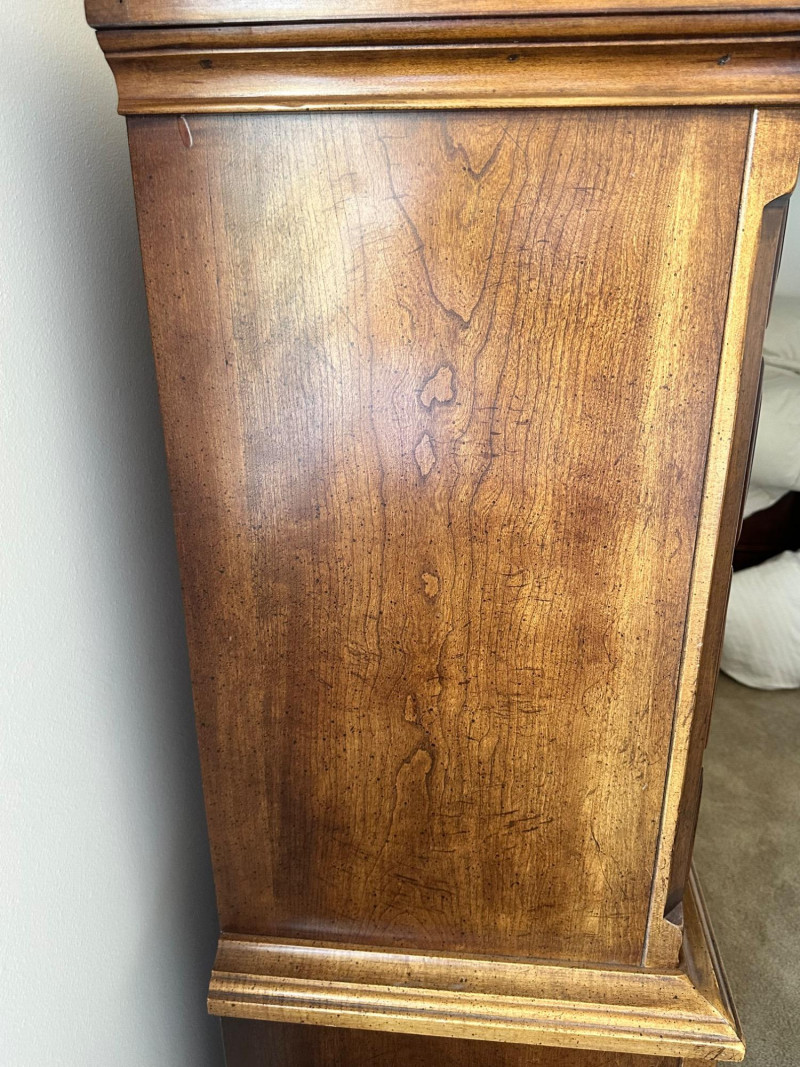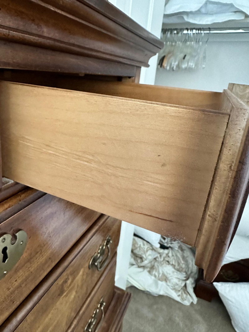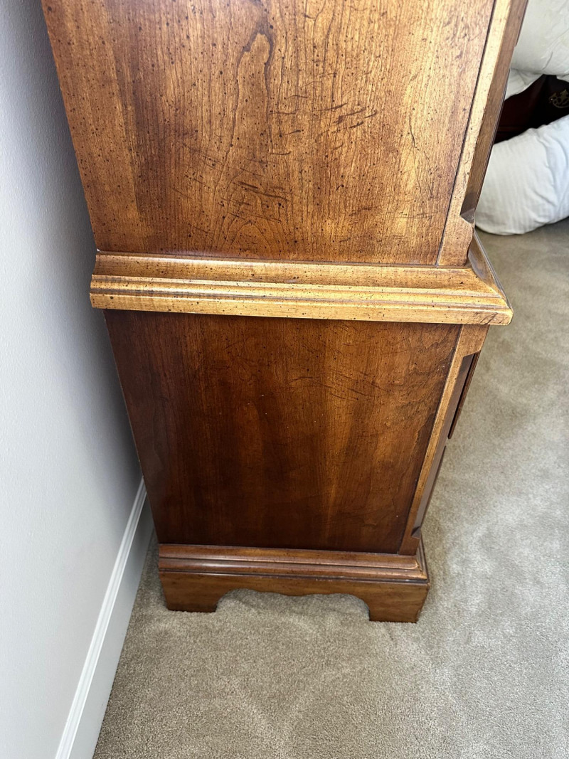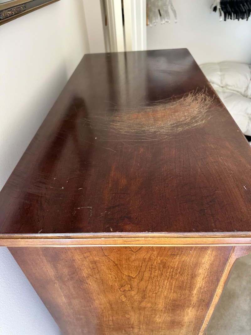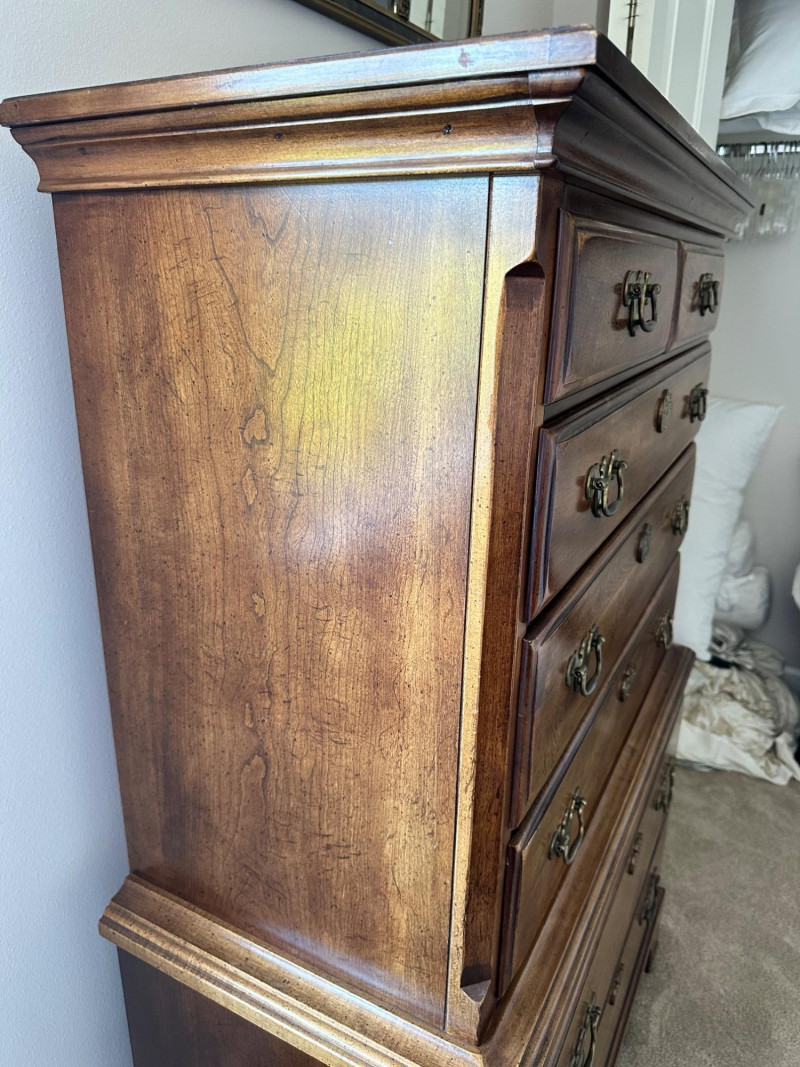 English Colonial Chest-On-Chest Dresser – 58” Tall English Colonial style chest-on-chest dresser with molded top, brass hardware, and traditional bracket feet. Features seven drawers in total—two small upper drawers and five full-size drawers—offering ample storage. Drawer interiors are unfinished wood. Please note: the top surface has significant scratching and wear; refinishing is recommended. Measurements: