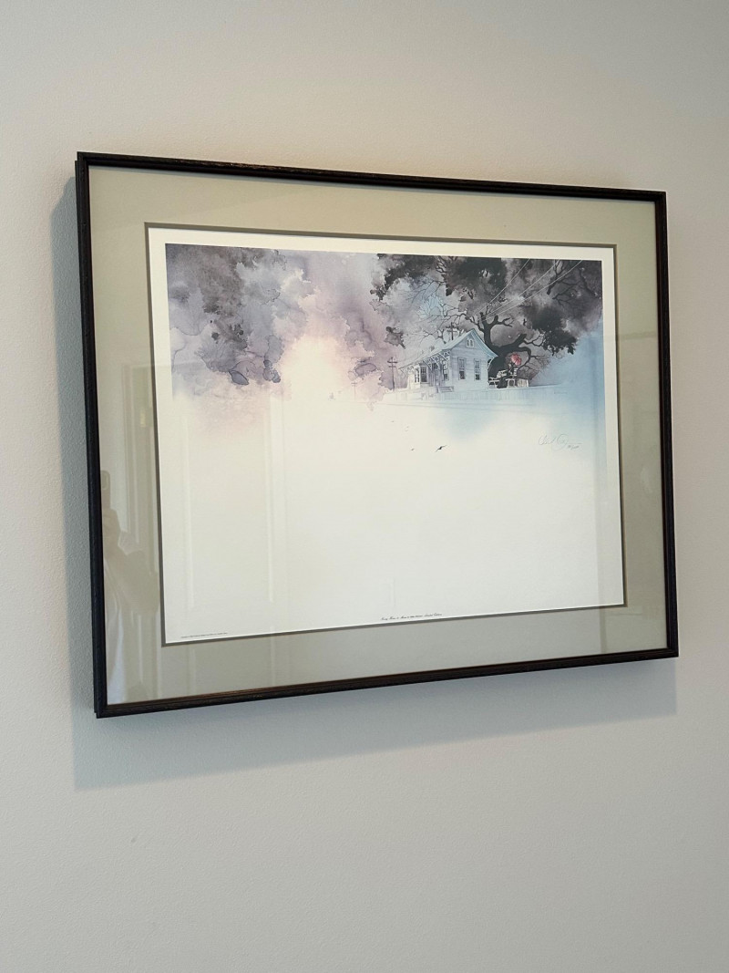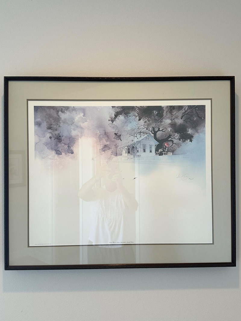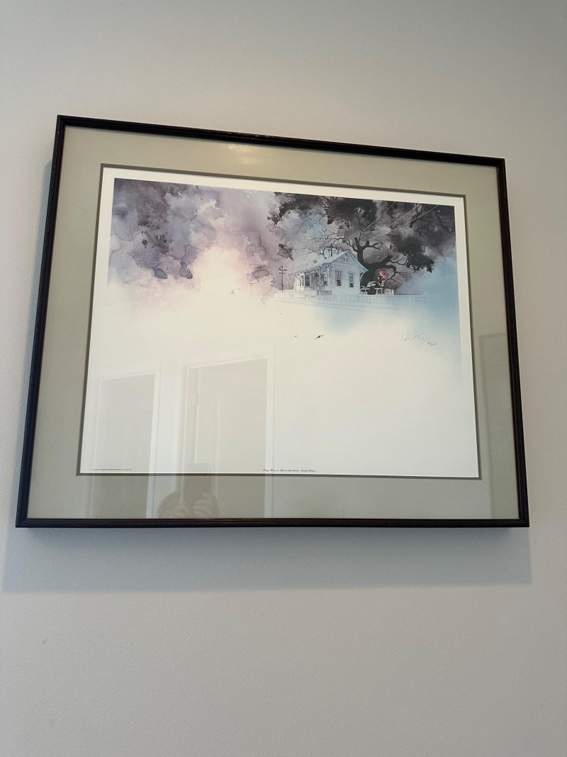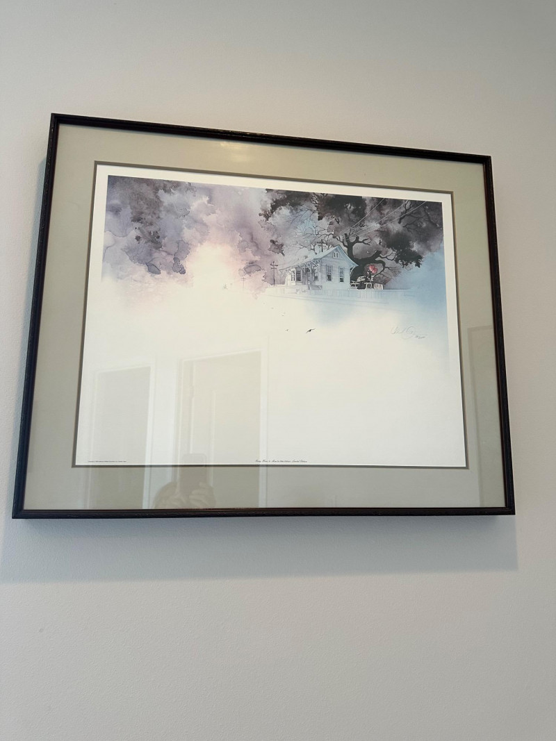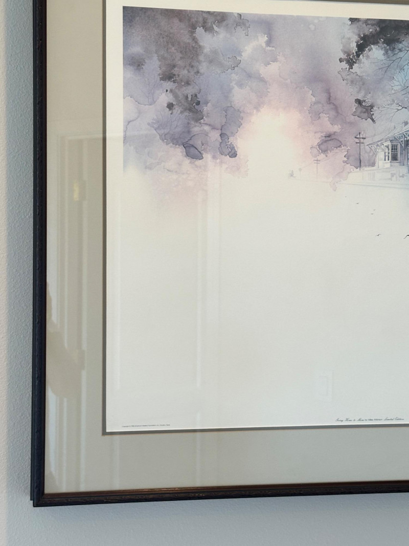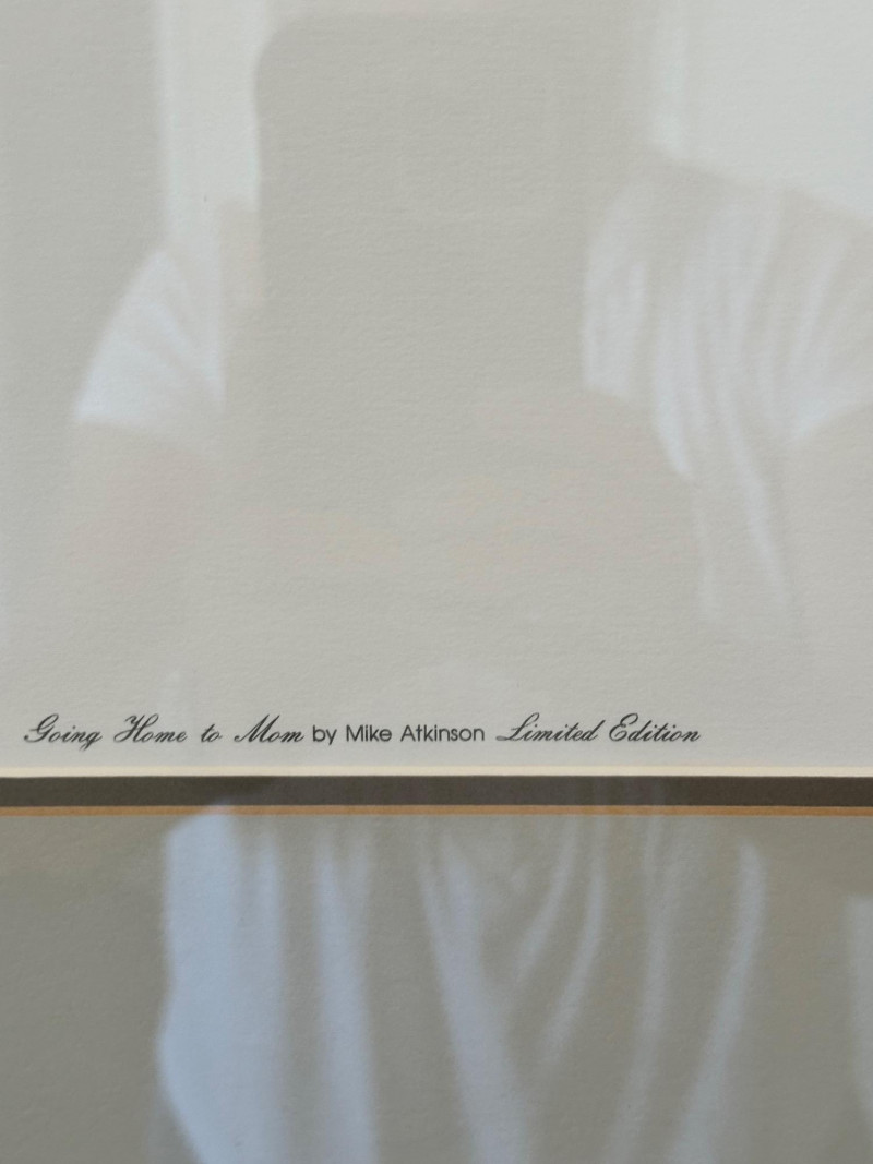 "Going Home to Mom" Limited Edition Print by Mike Adkinson – 381/1250 Limited edition print titled "Going Home to Mom" by artist Mike Adkinson. Numbered 381 out of an edition of 1250 and hand-signed by the artist. The print depicts a nostalgic watercolor-style image of a house with a soft pastel palette. Published in 1988 by the American Mothers Foundation, Inc., Houston, Texas. Professionally framed and matted under glass. Measurements: