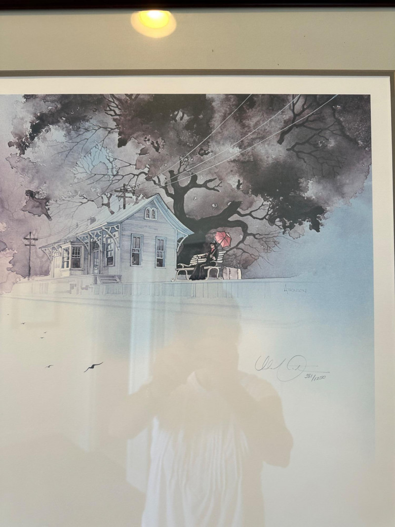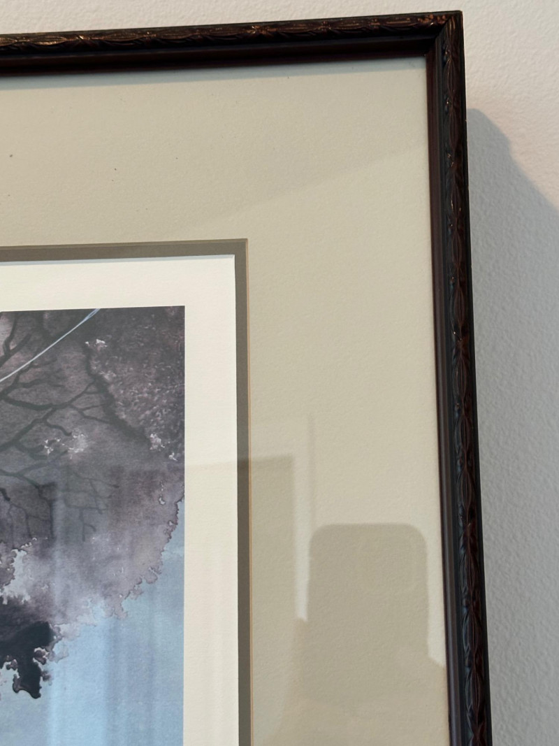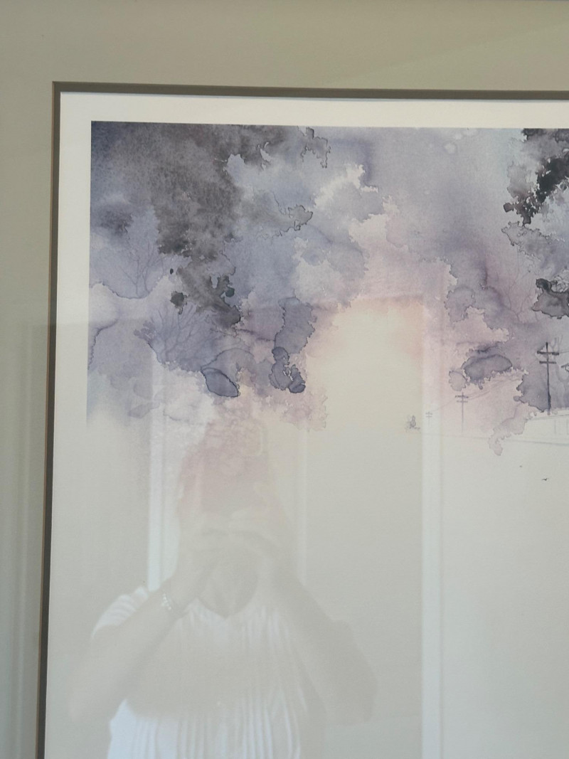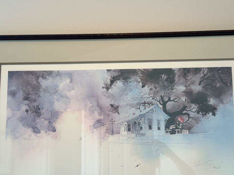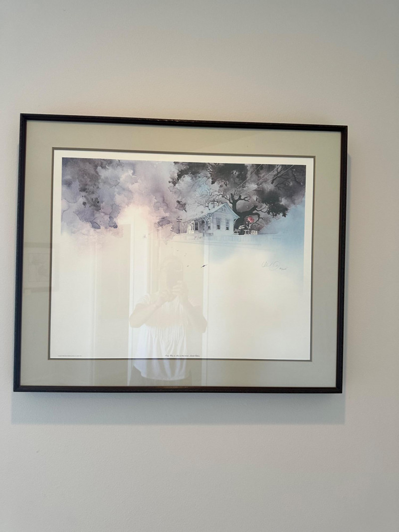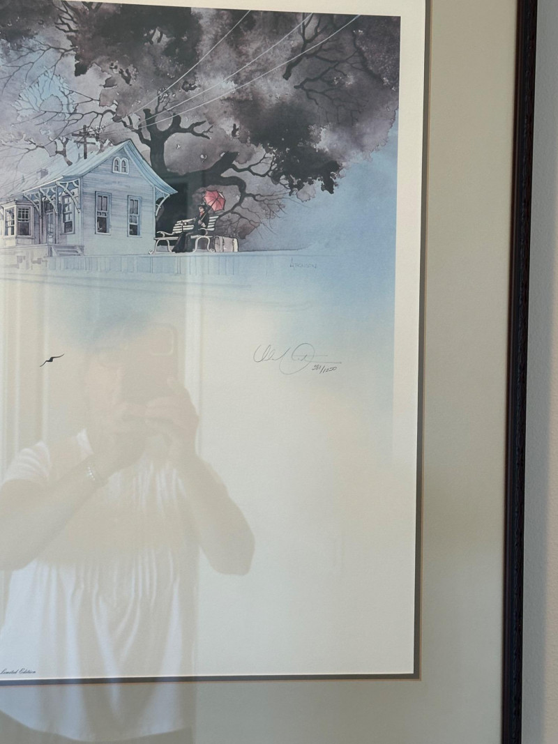 "Going Home to Mom" Limited Edition Print by Mike Adkinson – 381/1250 Limited edition print titled "Going Home to Mom" by artist Mike Adkinson. Numbered 381 out of an edition of 1250 and hand-signed by the artist. The print depicts a nostalgic watercolor-style image of a house with a soft pastel palette. Published in 1988 by the American Mothers Foundation, Inc., Houston, Texas. Professionally framed and matted under glass. Measurements: