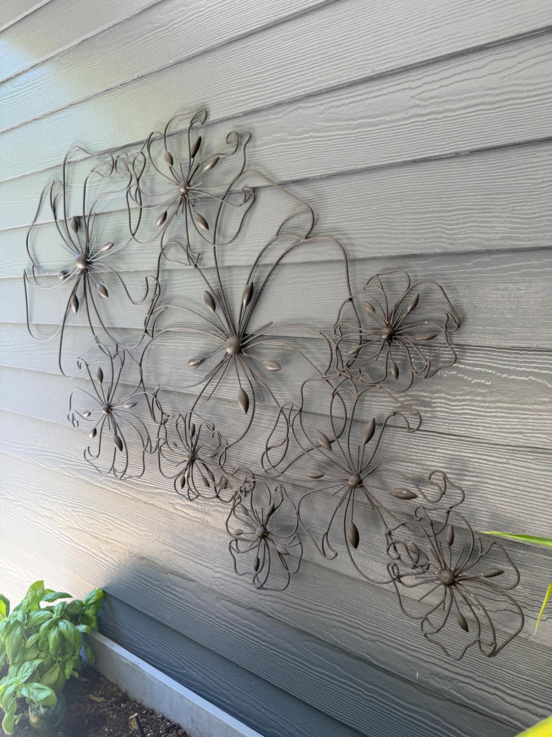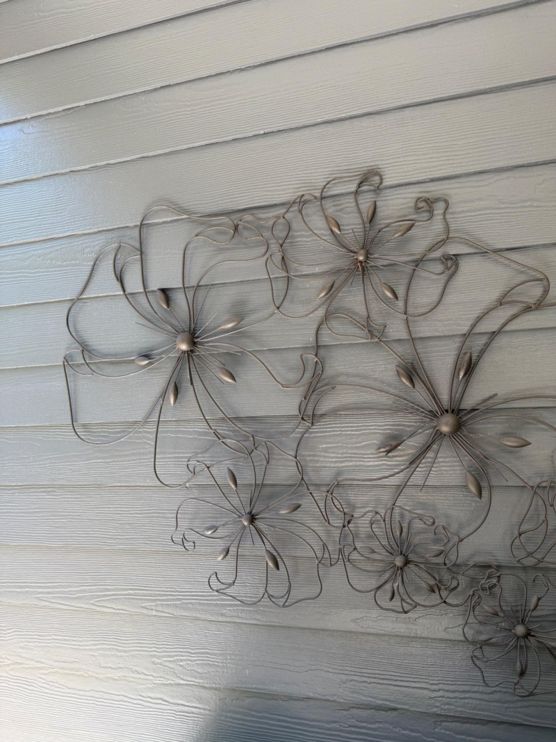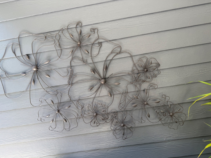 Floral Metal Wall Art – 52" W x 29" T Wall-mounted metal sculpture featuring an arrangement of abstract floral designs crafted from thin wire and metal accents. The piece incorporates layered flower shapes with petal and leaf details and is mounted on a horizontal plank wall. Measurements: