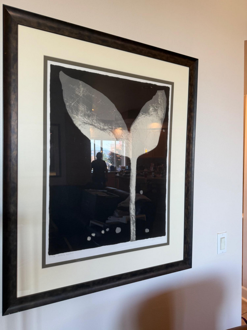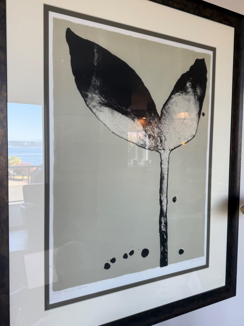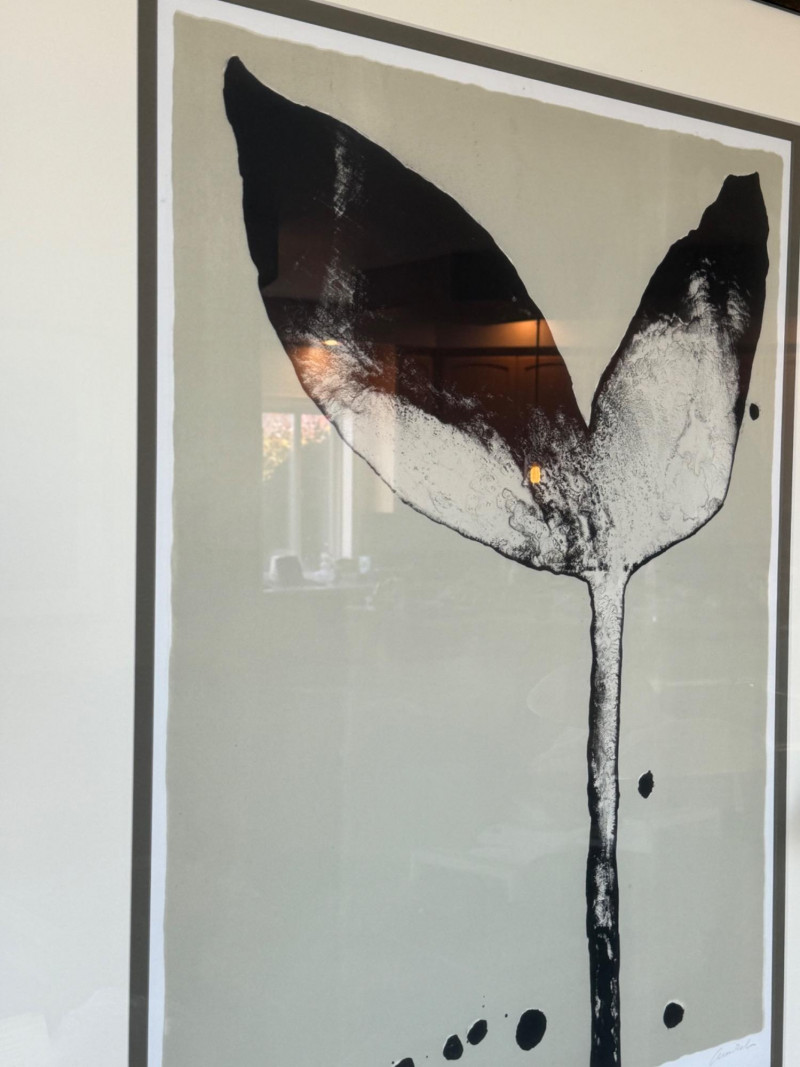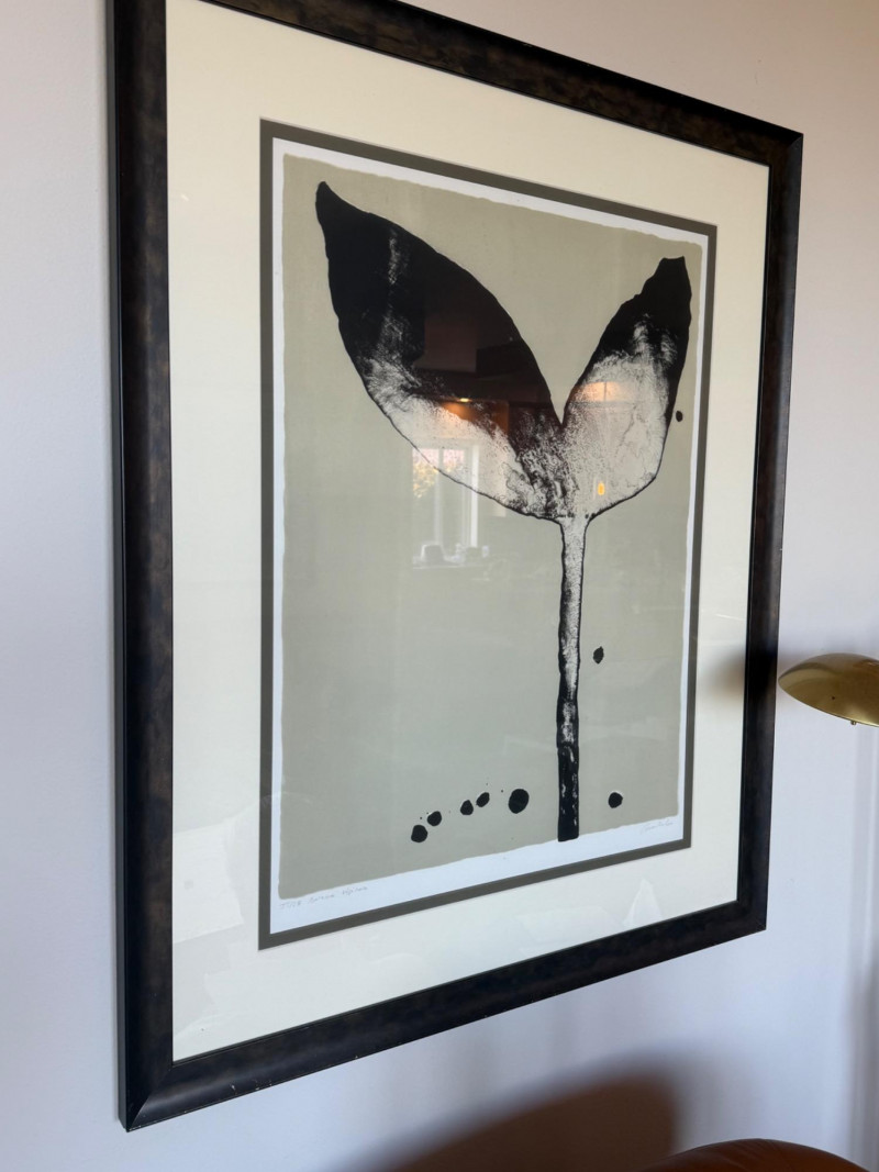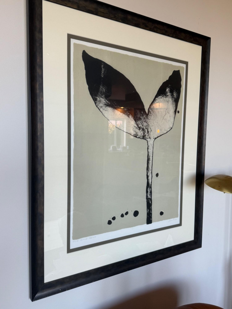 Tulip Prints – Signed, Dated, and Numbered Pair of tulip-themed prints featuring a bold monochrome composition. Each print is signed by the artist and numbered as part of a limited edition. Visible inscriptions include: Signature: "Anders" Numbering and title: “12/18 Tulipa Negra” and “12/18 Tulipa Nova” Both prints are professionally framed in matching black wood frames with white mats. Measurements (each print):