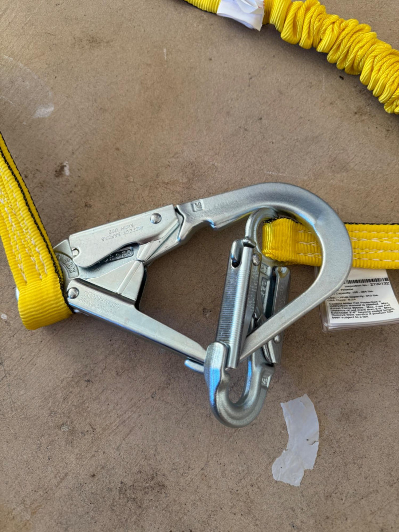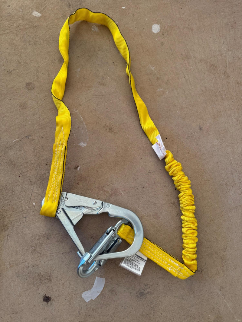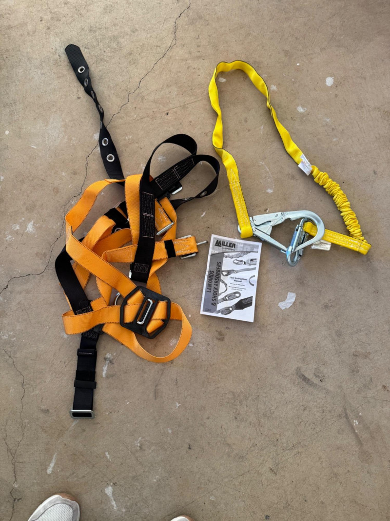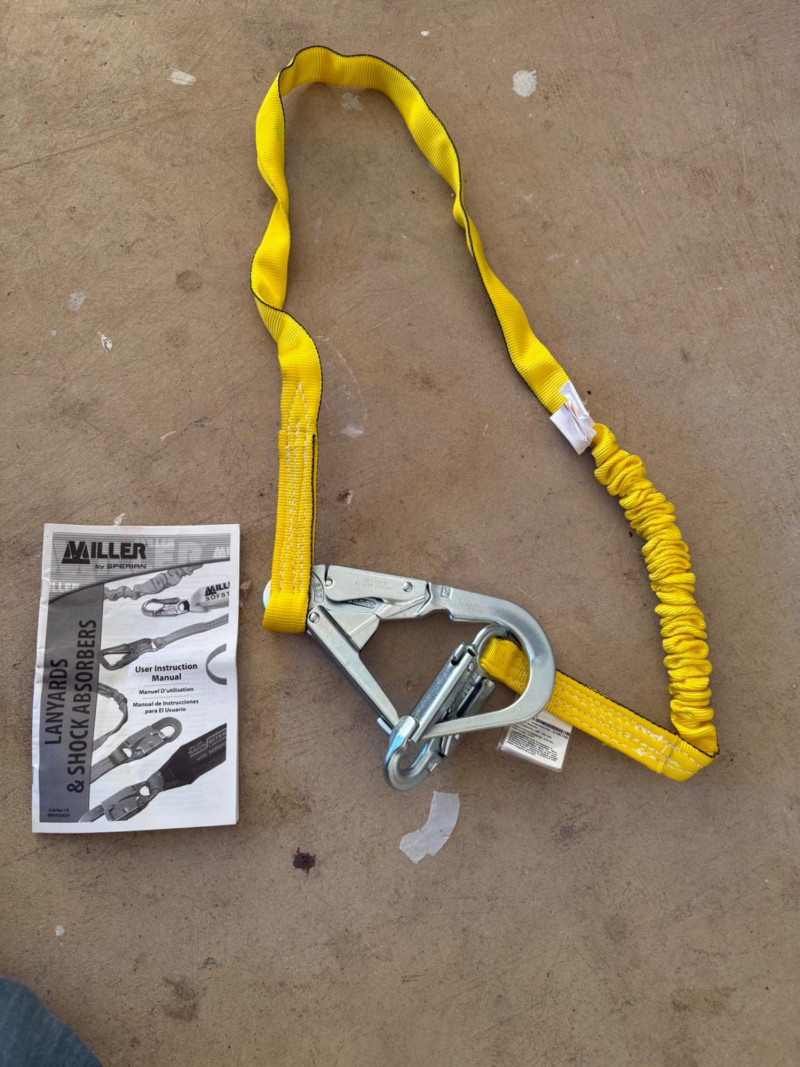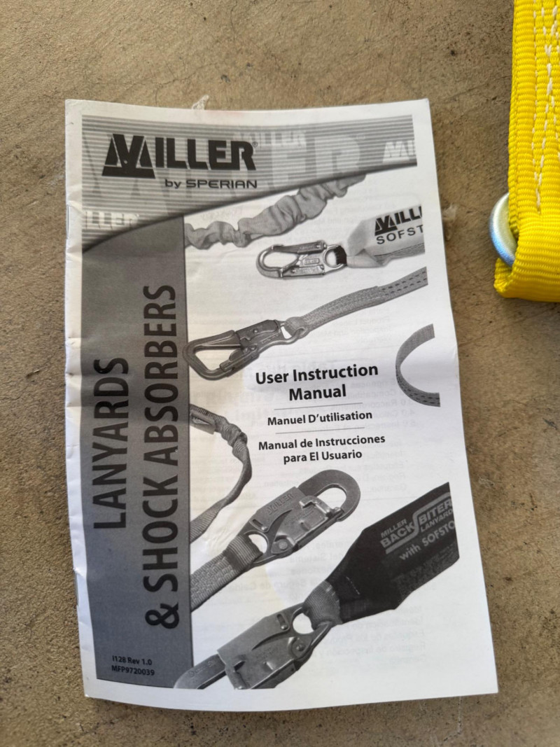 Heavy Duty Lanyards and Safety Harness Set Includes: One full-body safety harness (black and yellow straps with adjustable buckles) One yellow shock-absorbing lanyard with heavy-duty snap hook User instruction manual (Miller by Sperian – Lanyards & Shock Absorbers)