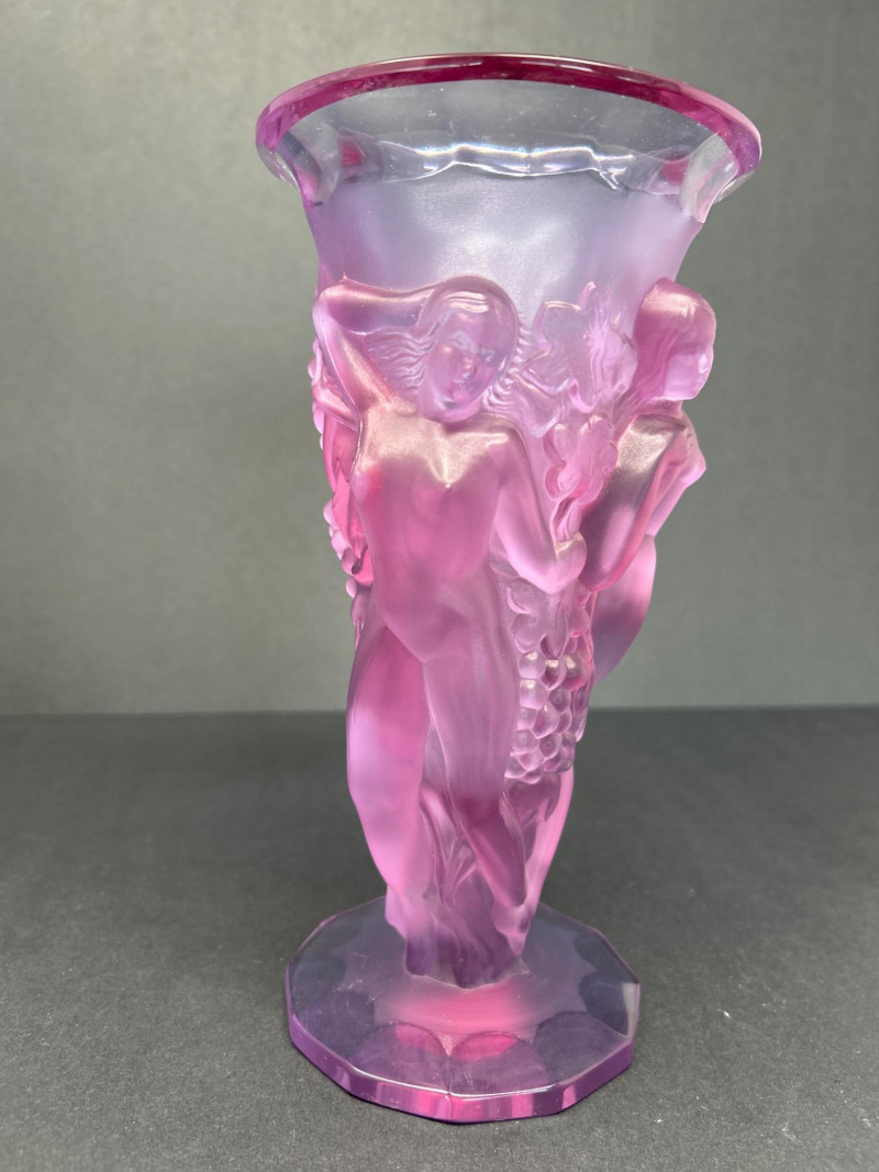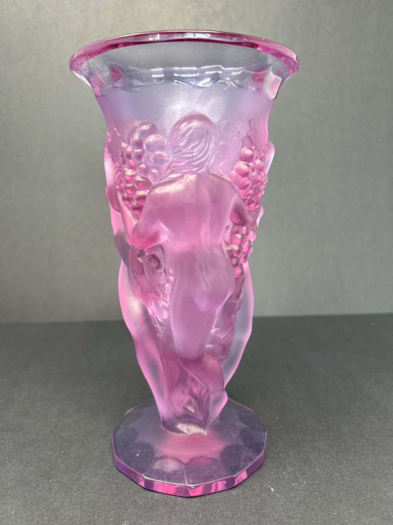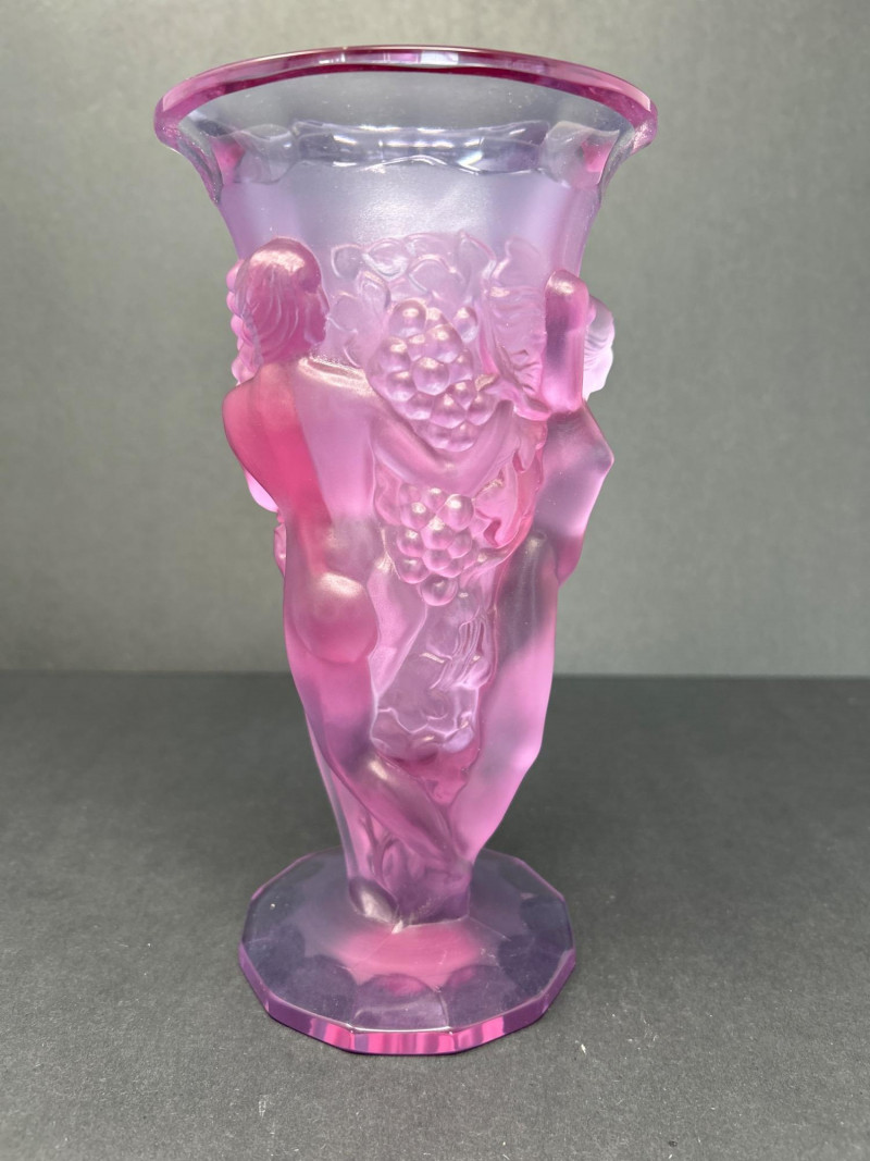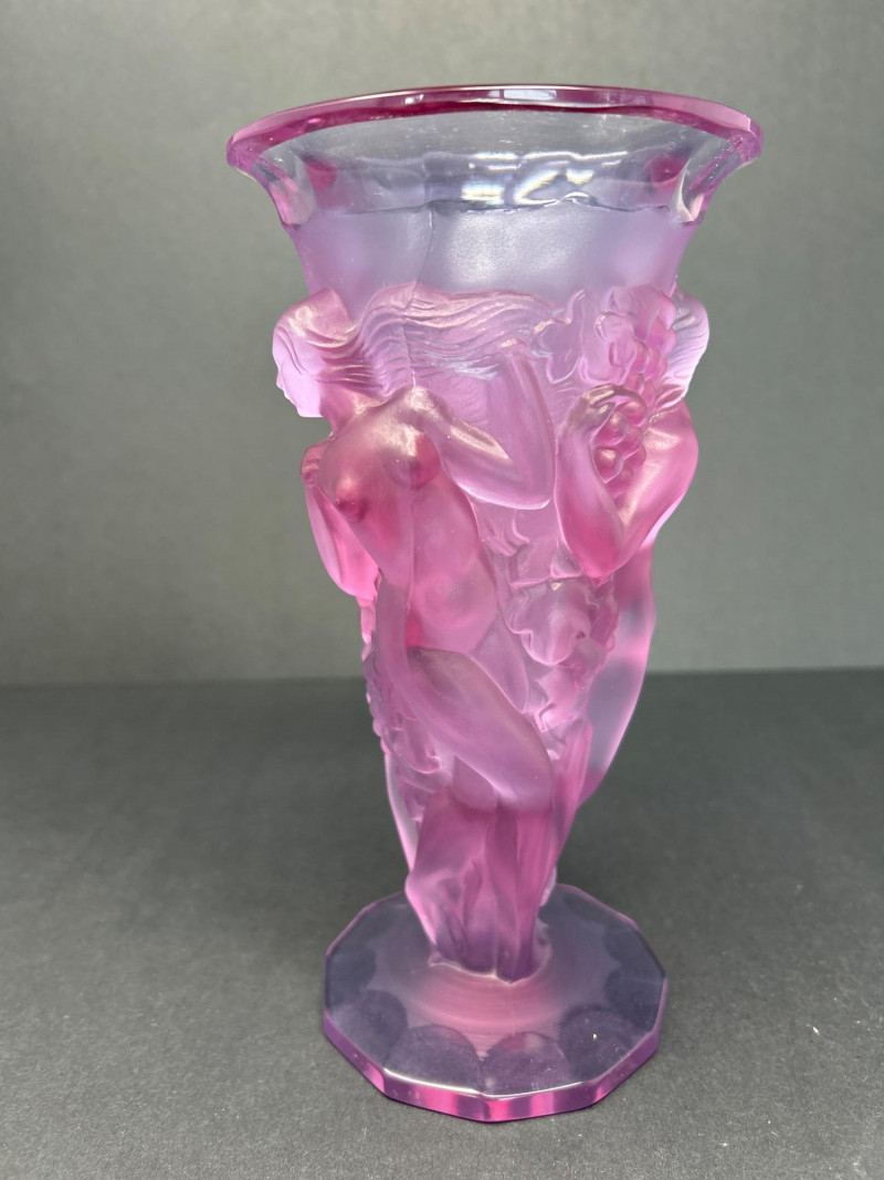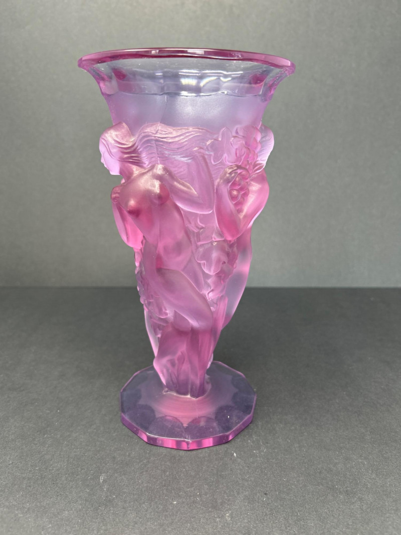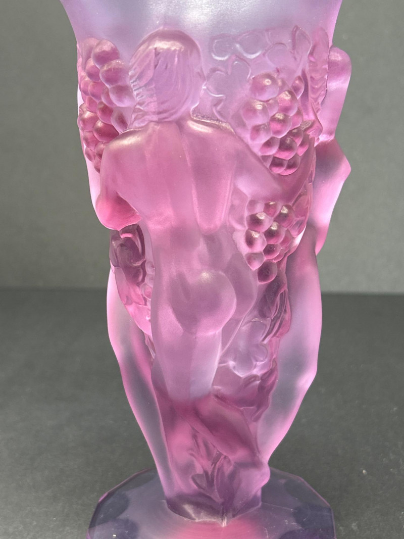 A graceful Lalique vase in frosted pink crystal, featuring two sculpted female figures in high relief, holding clusters of grapes. The vase has a flared rim and a hexagonal base, with Lalique’s signature etched on the underside. The craftsmanship reflects Lalique’s signature blend of sensuality and elegance. Maker: Lalique (France) Material: Frosted pink lead crystal Design: Two nude female figures with grapes in high relief Dimensions: 8.5" H × 4.5" D Base: Hexagonal foot with flared rim Condition: Excellent; signed Category: China/Crystal/Silver Collector’s Note: