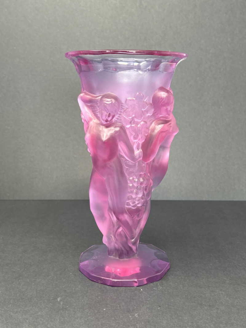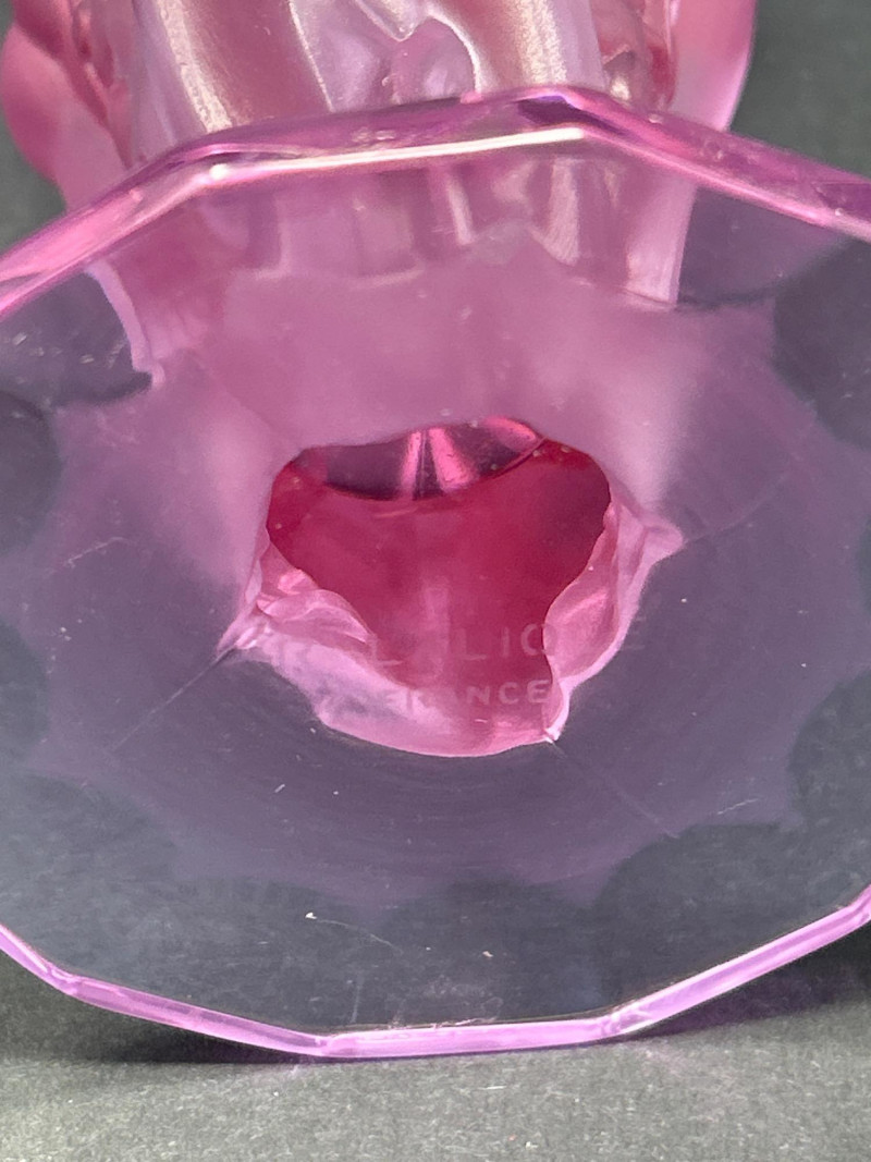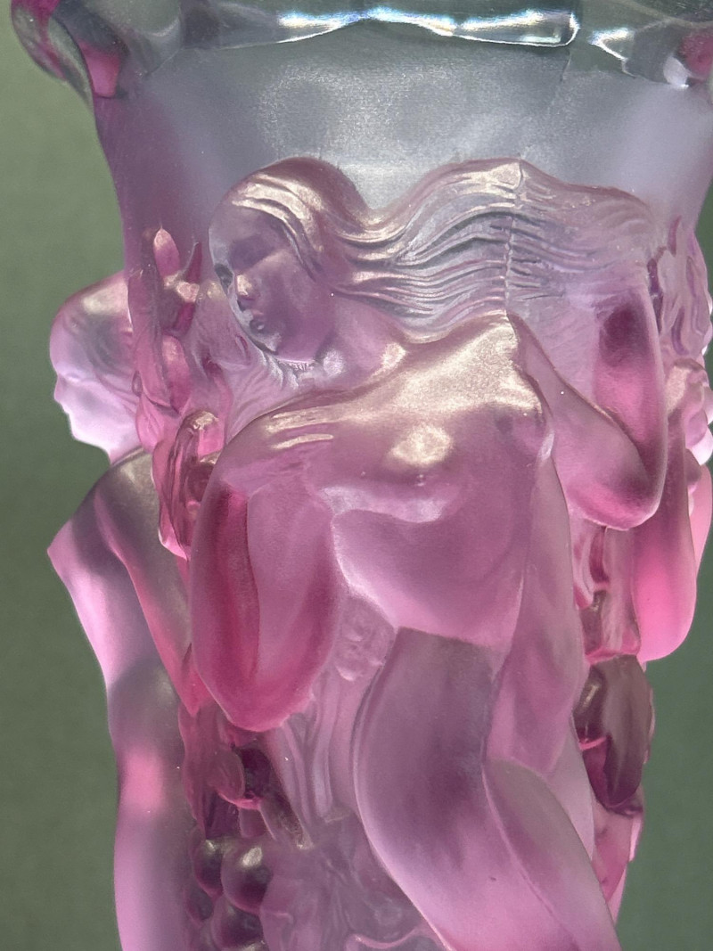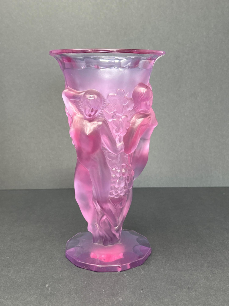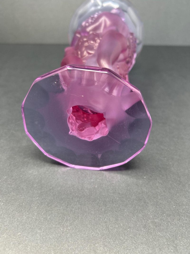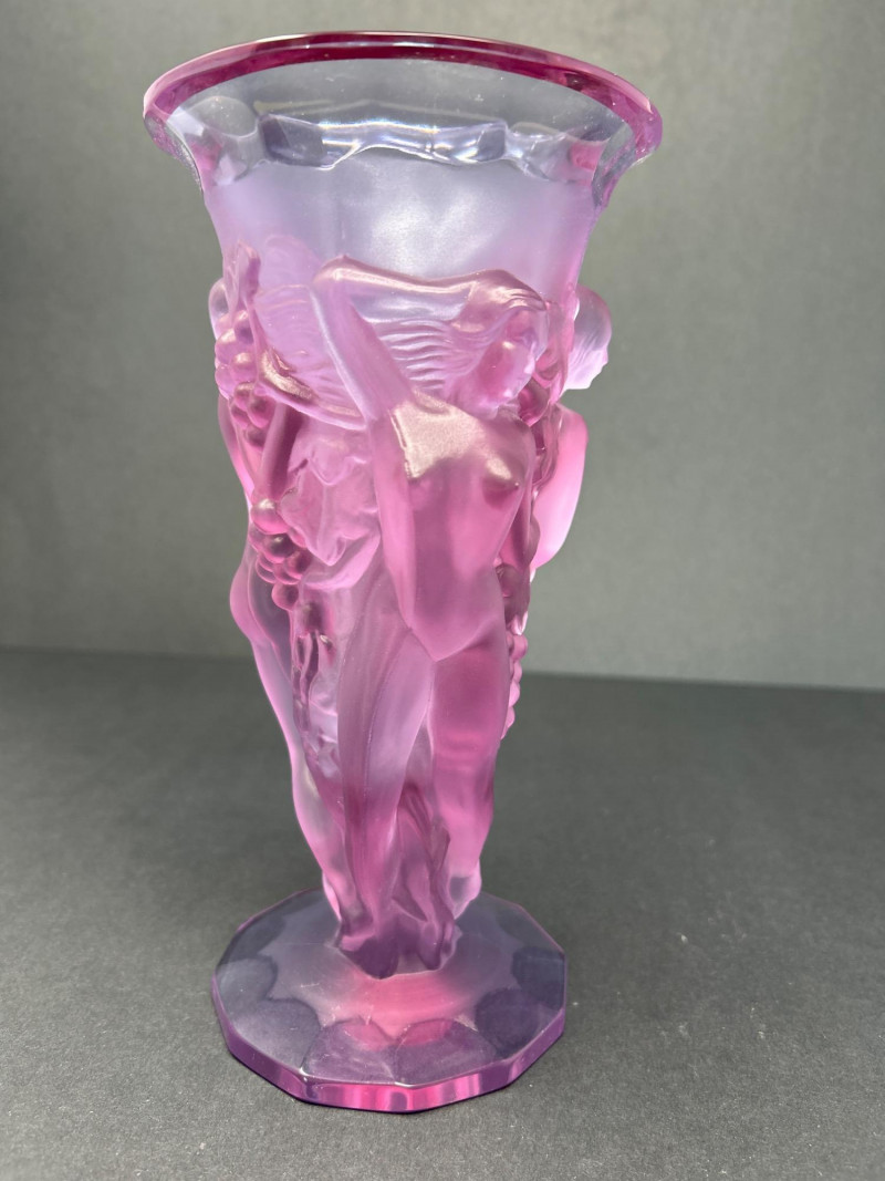 A graceful Lalique vase in frosted pink crystal, featuring two sculpted female figures in high relief, holding clusters of grapes. The vase has a flared rim and a hexagonal base, with Lalique’s signature etched on the underside. The craftsmanship reflects Lalique’s signature blend of sensuality and elegance. Maker: Lalique (France) Material: Frosted pink lead crystal Design: Two nude female figures with grapes in high relief Dimensions: 8.5" H × 4.5" D Base: Hexagonal foot with flared rim Condition: Excellent; signed Category: China/Crystal/Silver Collector’s Note: