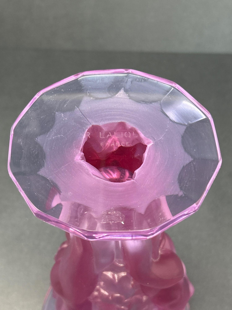 Lalique’s figural vases are celebrated for their sculptural beauty and refined detail. This signed example is a standout for its delicate pink hue and classic Art Deco styling.