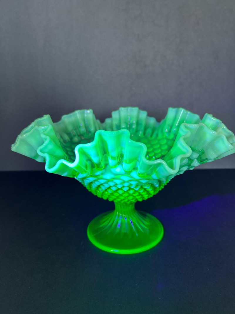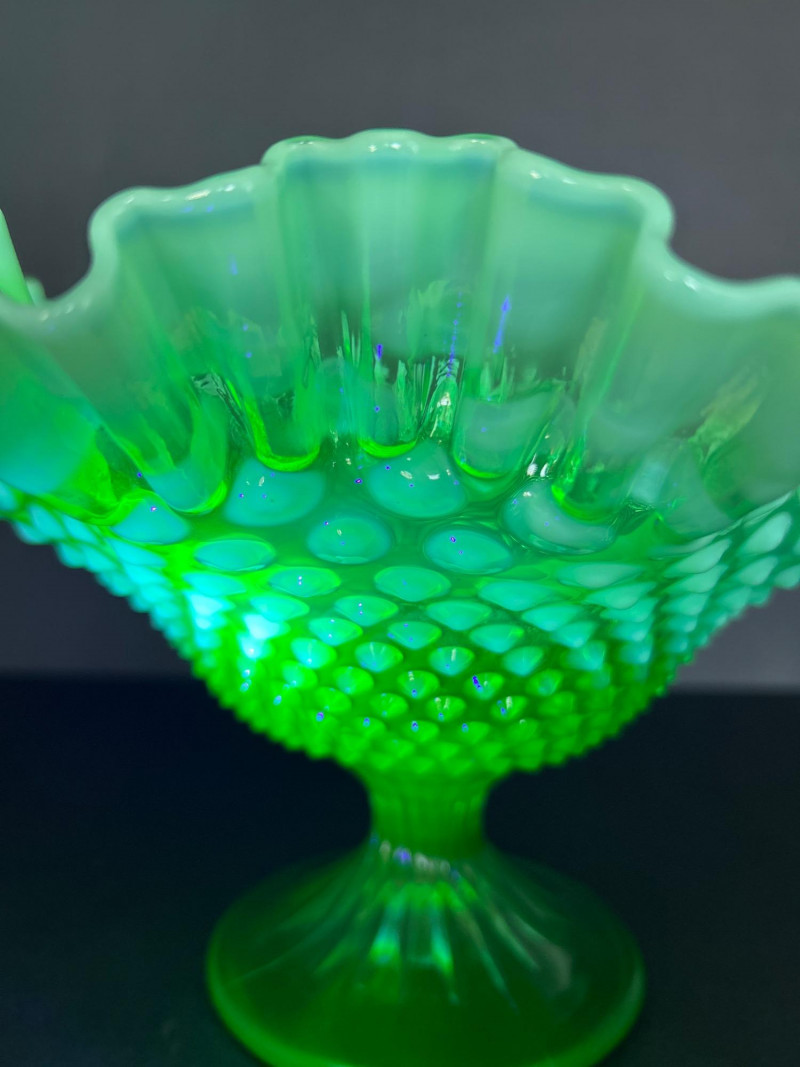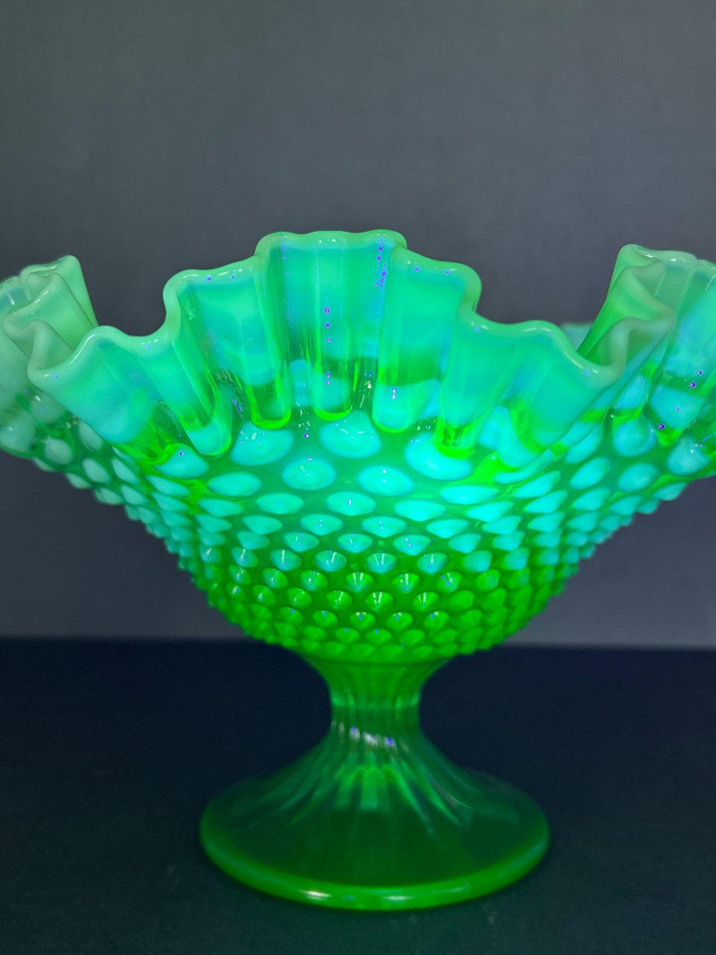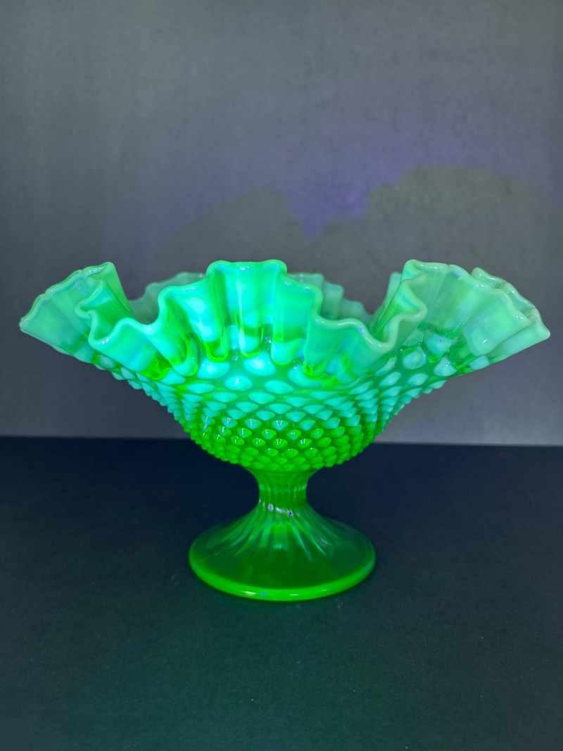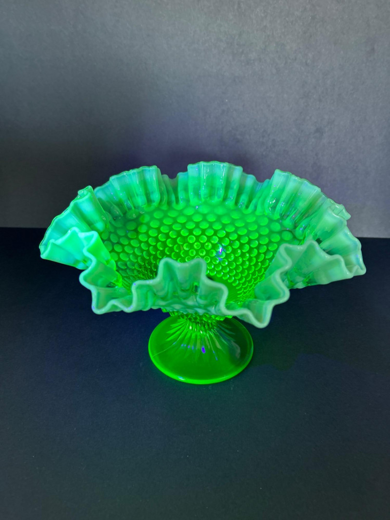 A vibrant green opalescent pedestal compote by Fenton, featuring a classic double ruffle edge and hobnail pattern. This piece is made of uranium glass, which emits a striking UV glow under blacklight—an iconic trait of mid-century Fenton artistry. Maker: Fenton Art Glass Material: Uranium glass with opalescent finish Design: Hobnail texture with double ruffle rim Collector’s Note: