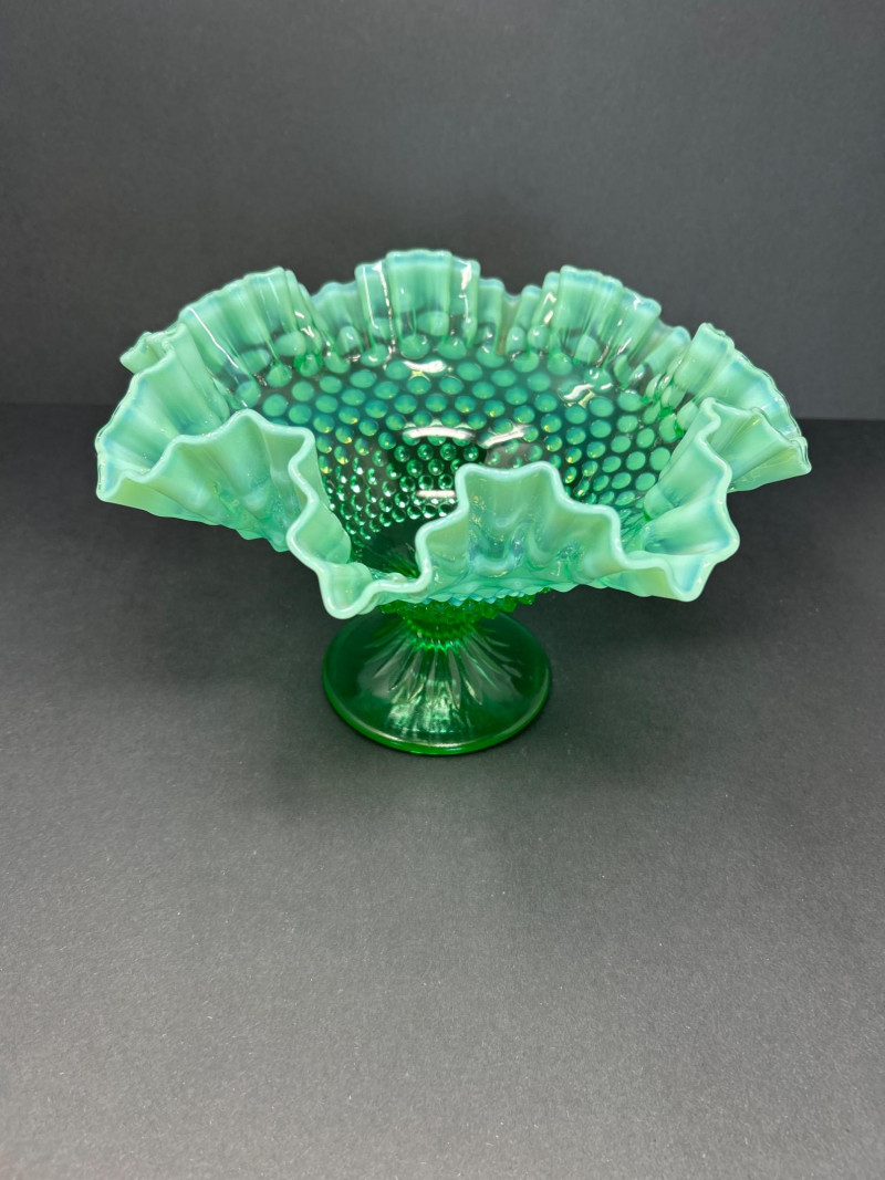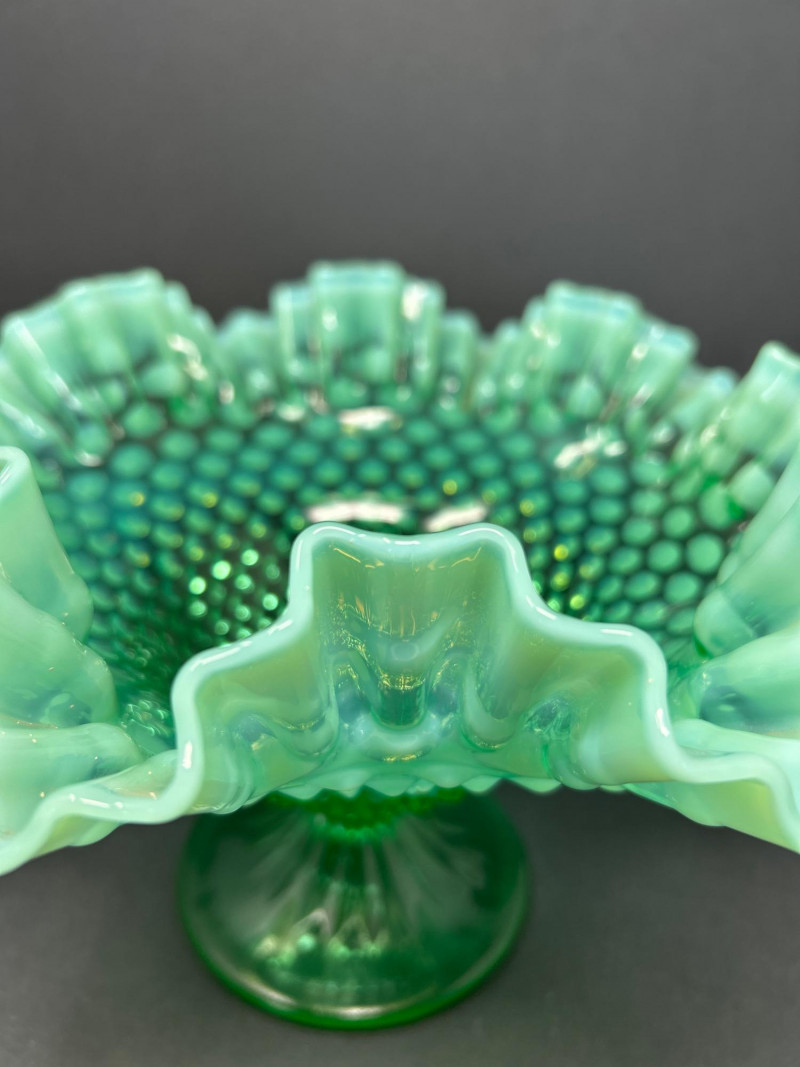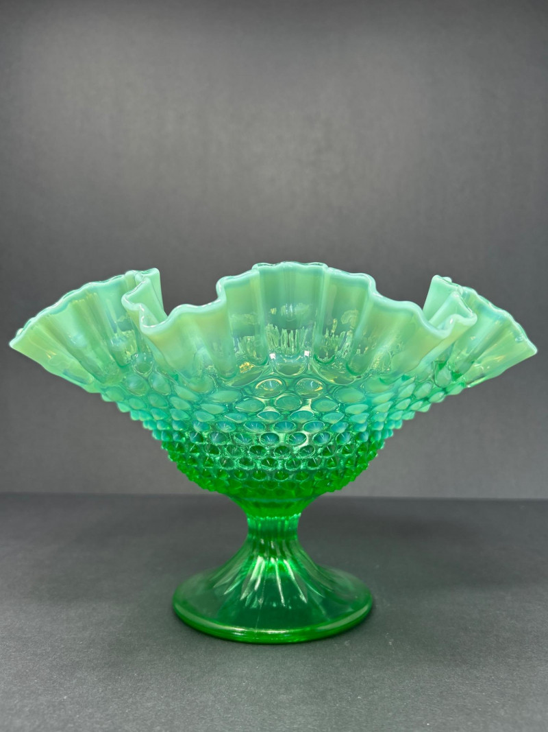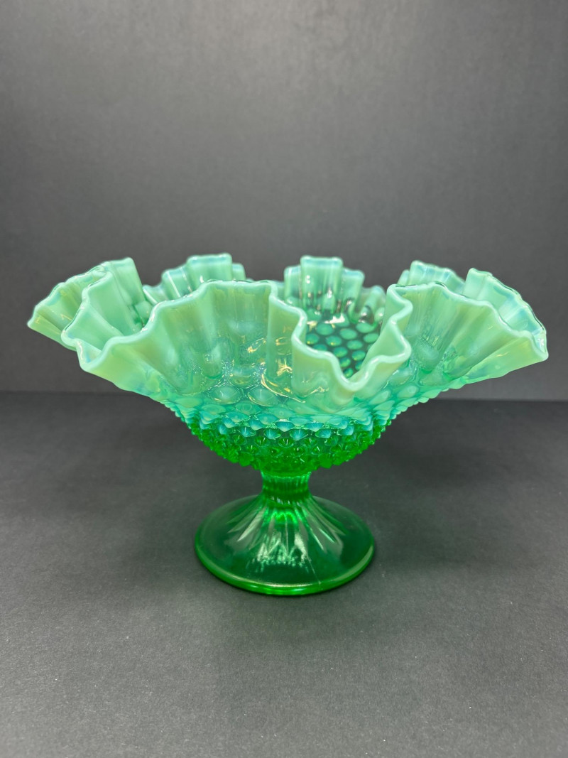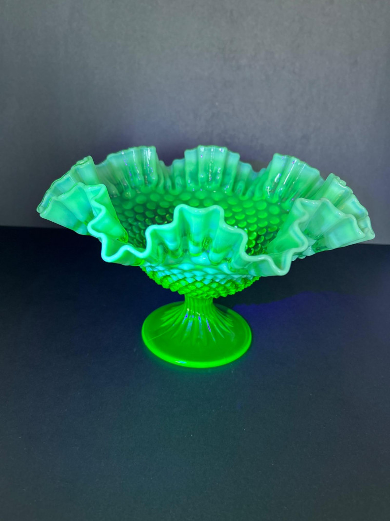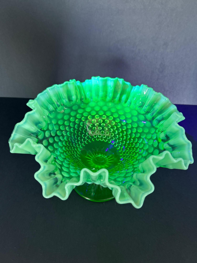 A vibrant green opalescent pedestal compote by Fenton, featuring a classic double ruffle edge and hobnail pattern. This piece is made of uranium glass, which emits a striking UV glow under blacklight—an iconic trait of mid-century Fenton artistry. Maker: Fenton Art Glass Material: Uranium glass with opalescent finish Design: Hobnail texture with double ruffle rim Collector’s Note: