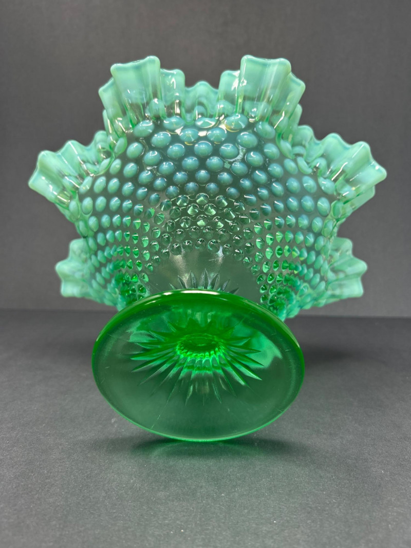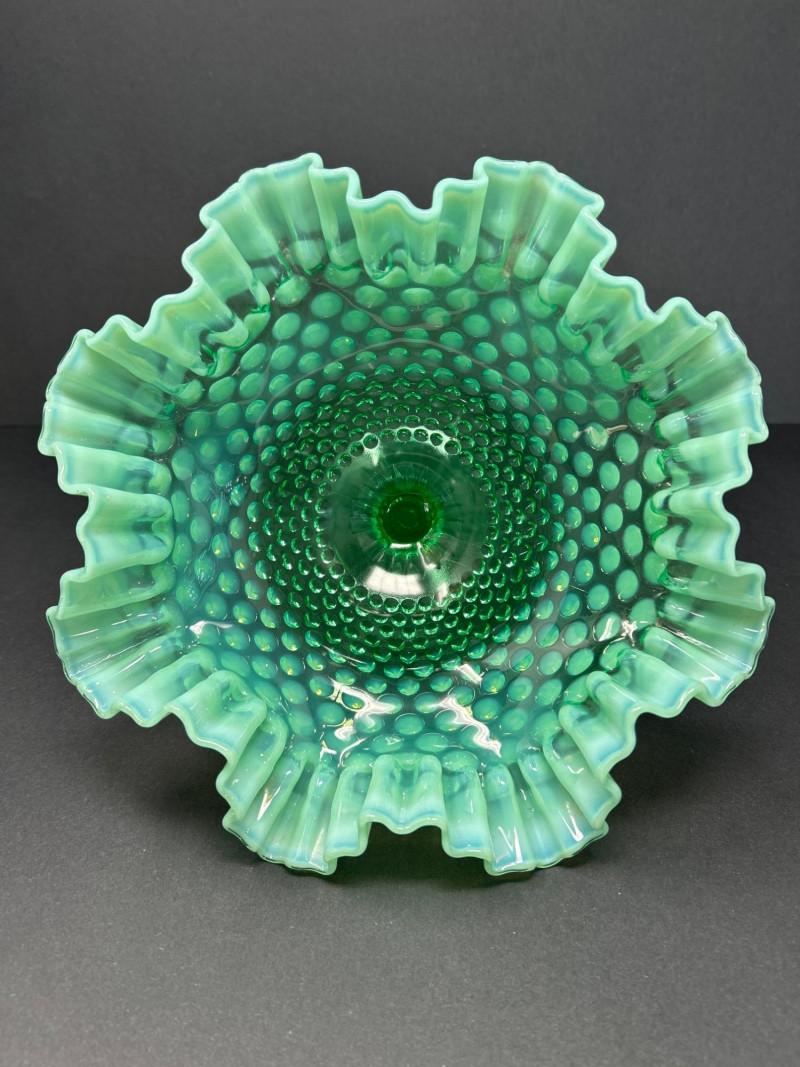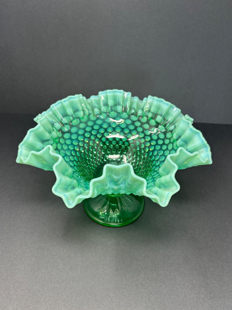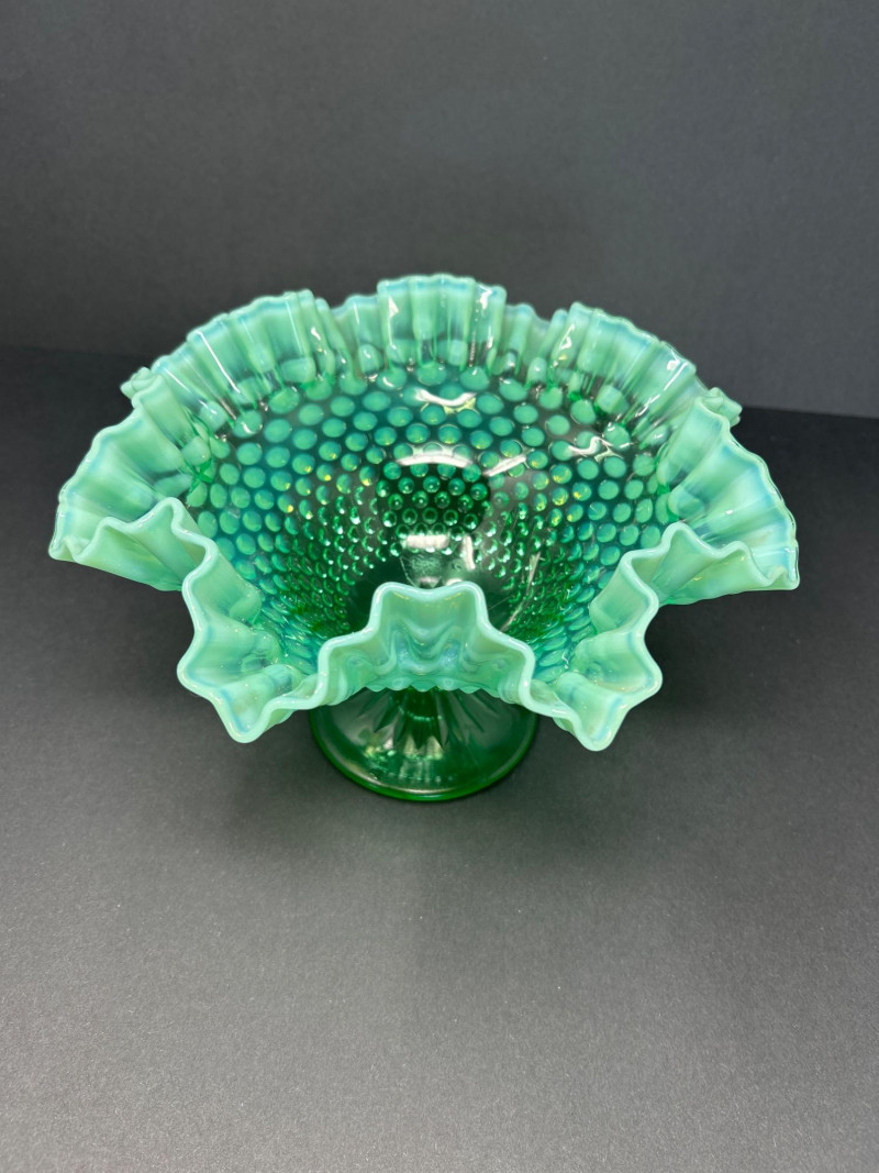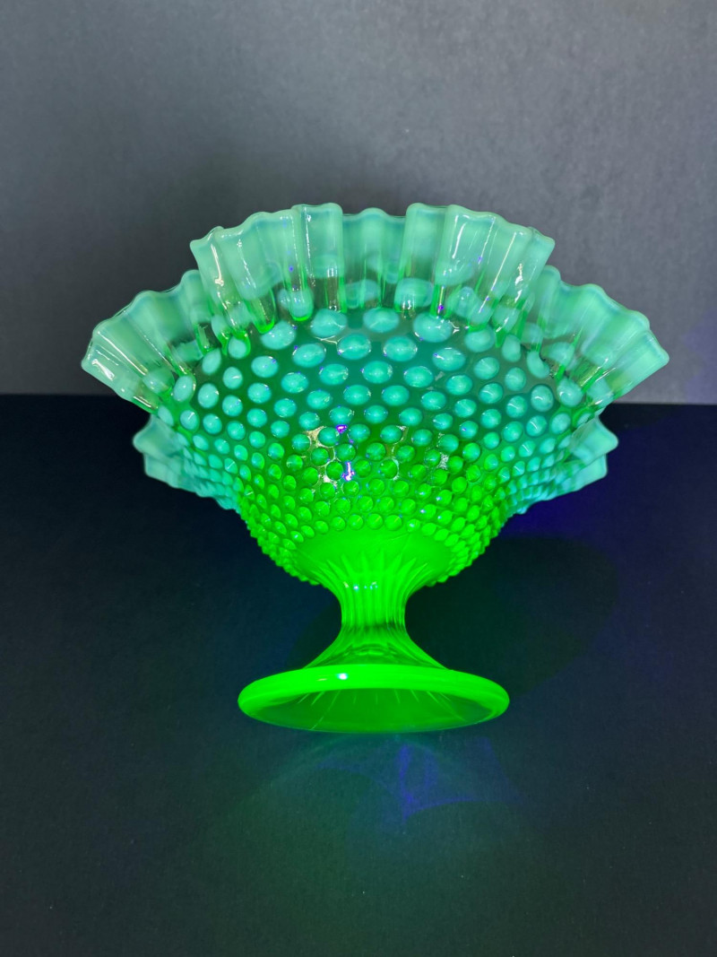 A vibrant green opalescent pedestal compote by Fenton, featuring a classic double ruffle edge and hobnail pattern. This piece is made of uranium glass, which emits a striking UV glow under blacklight—an iconic trait of mid-century Fenton artistry. Maker: Fenton Art Glass Material: Uranium glass with opalescent finish Design: Hobnail texture with double ruffle rim Collector’s Note: