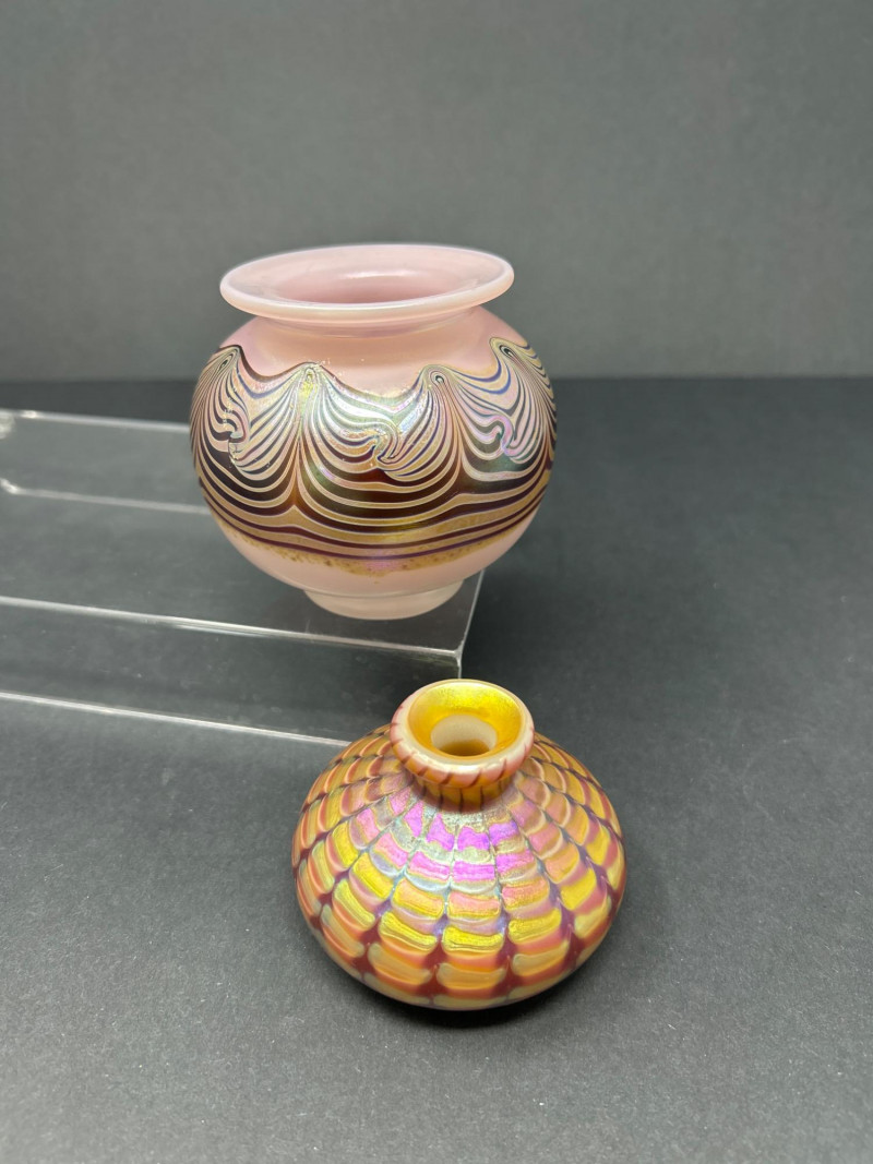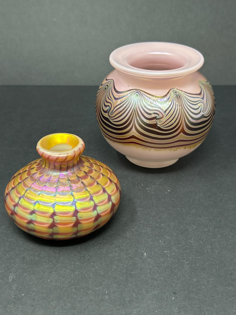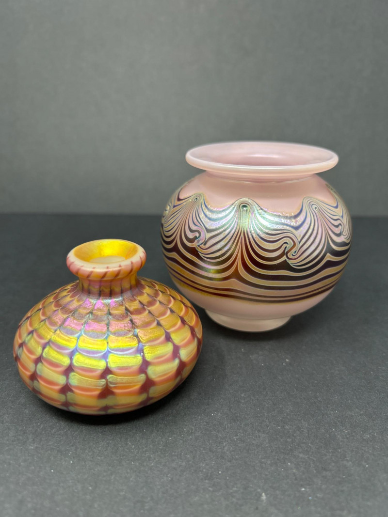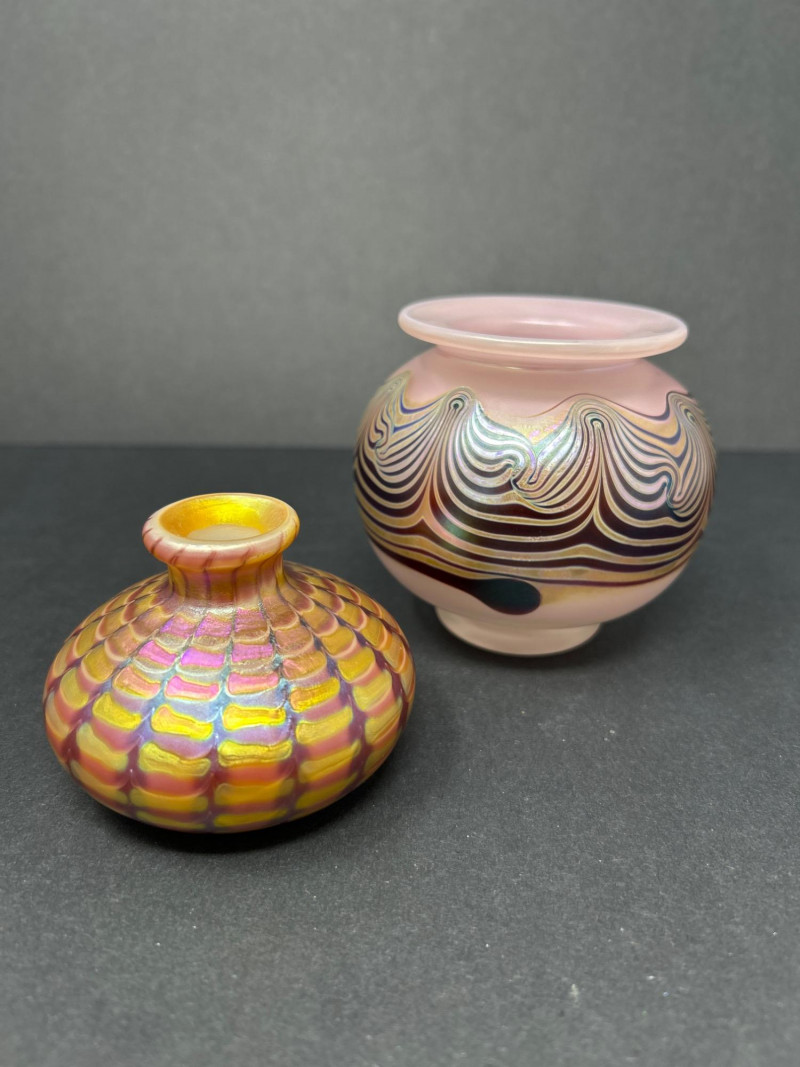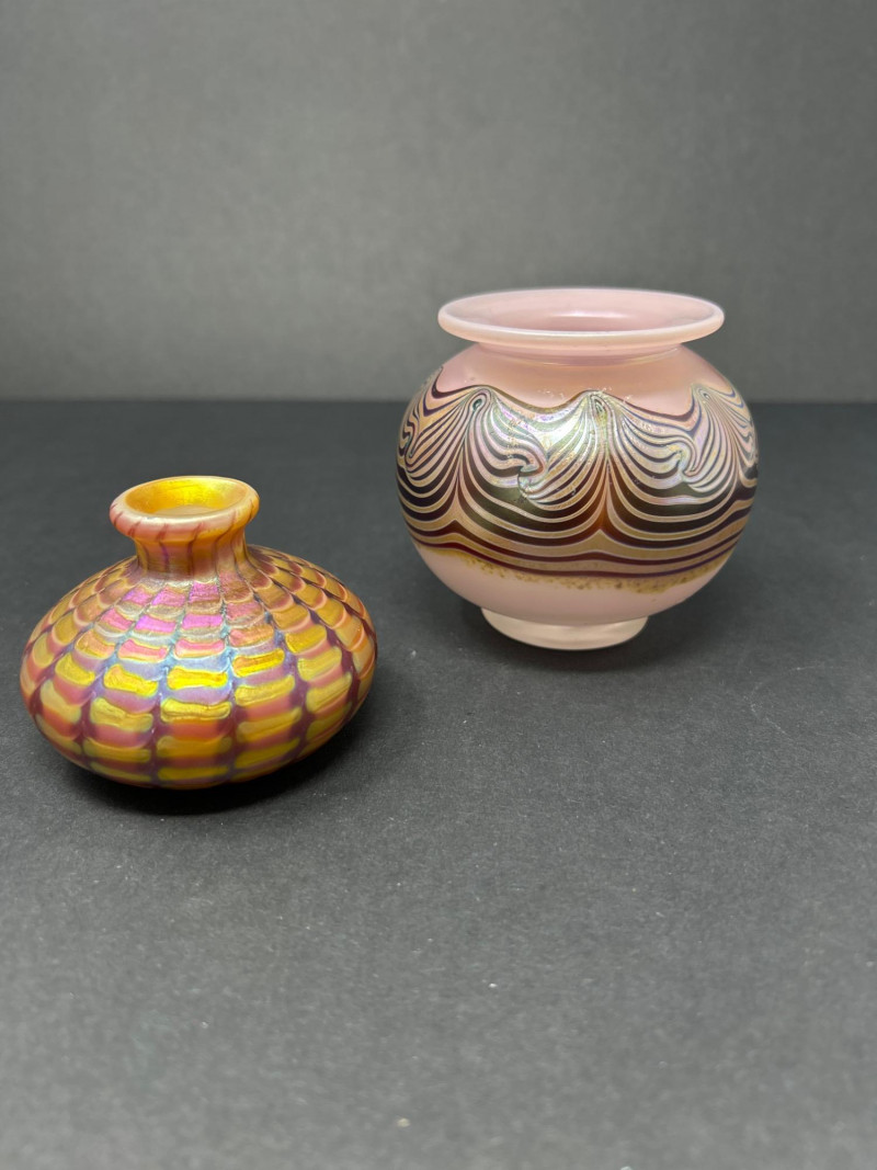 A striking pair of hand-painted iridescent art glass vases, each signed on the base. These small decorative pieces feature bold, reflective surface designs: The shorter vase has a bulbous form with a narrow neck and a mesmerizing fish-scale pattern in hues of gold, orange, and violet. The taller vase is more traditionally shaped, with a soft pink base and intricate wavy iridescent lines in gold, green, and brown. Collector’s Note: