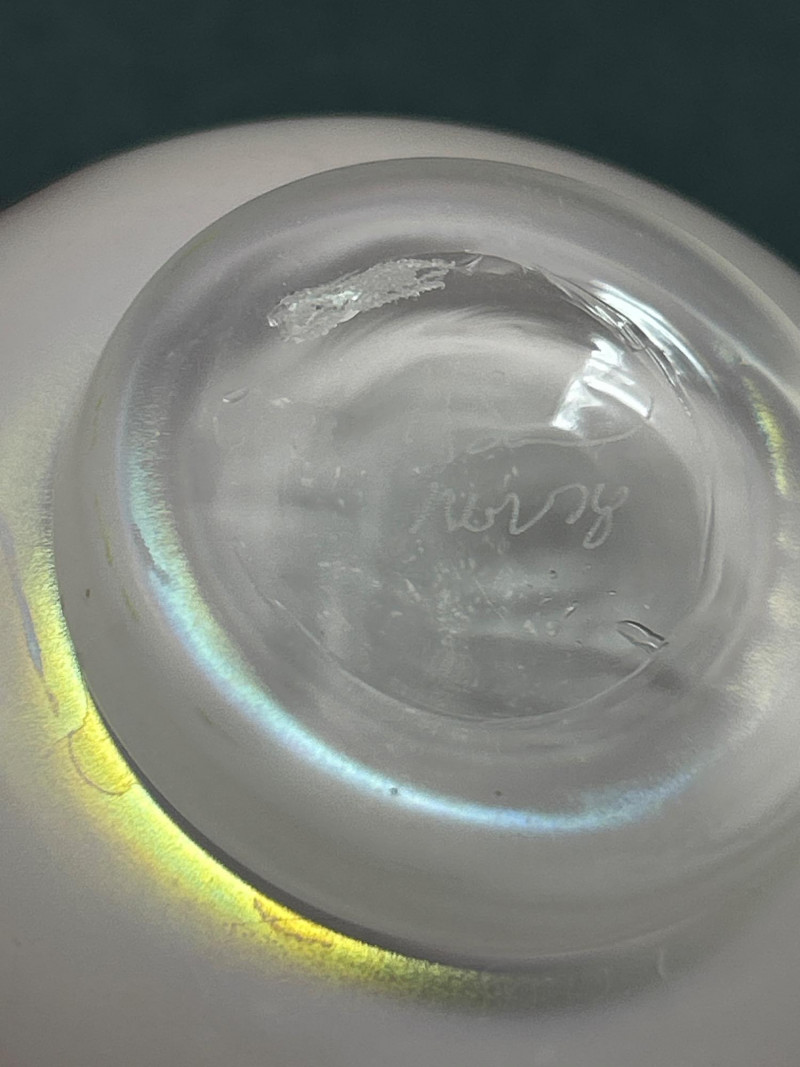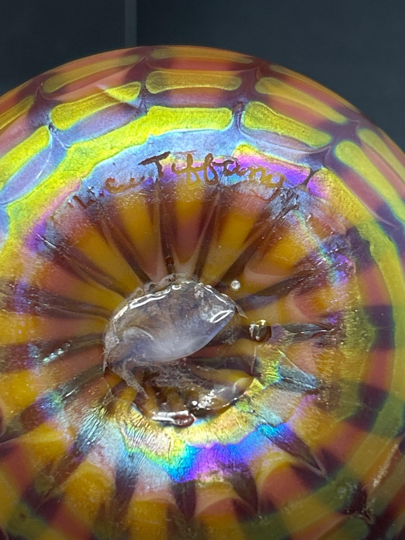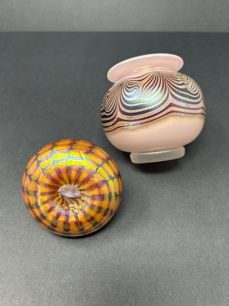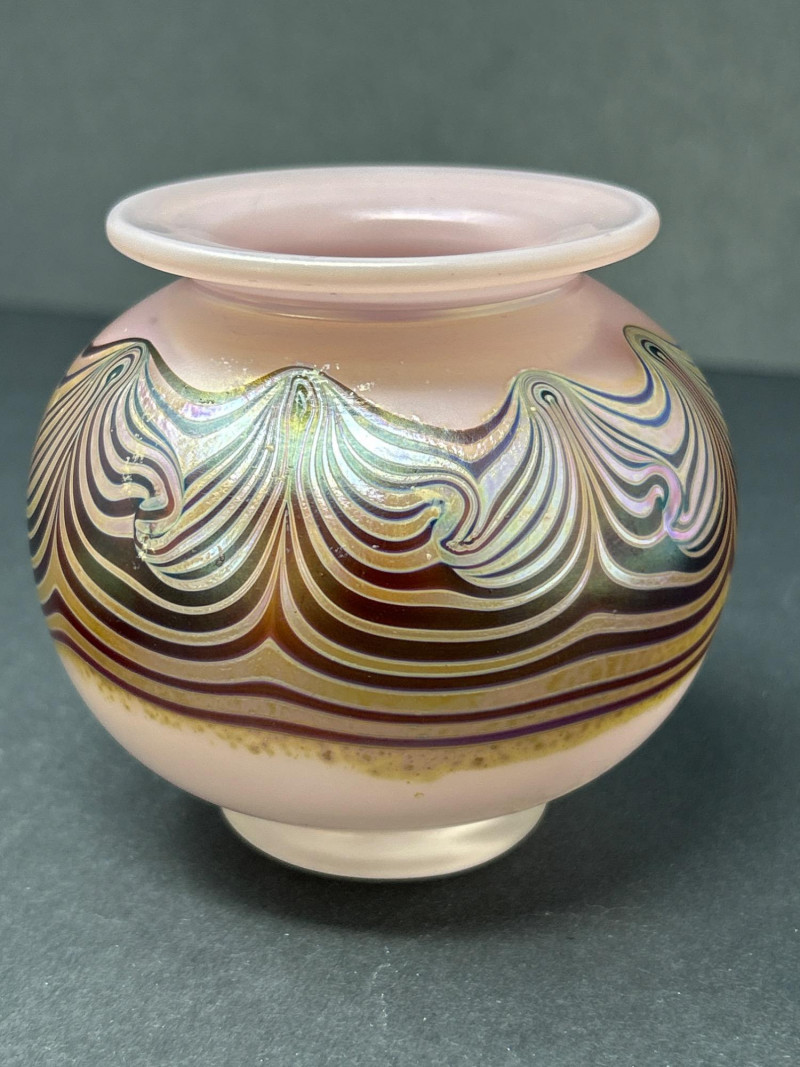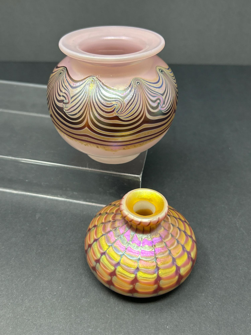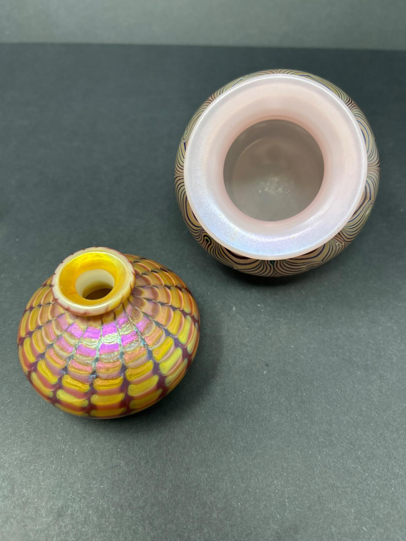 A striking pair of hand-painted iridescent art glass vases, each signed on the base. These small decorative pieces feature bold, reflective surface designs: The shorter vase has a bulbous form with a narrow neck and a mesmerizing fish-scale pattern in hues of gold, orange, and violet. The taller vase is more traditionally shaped, with a soft pink base and intricate wavy iridescent lines in gold, green, and brown. Collector’s Note: