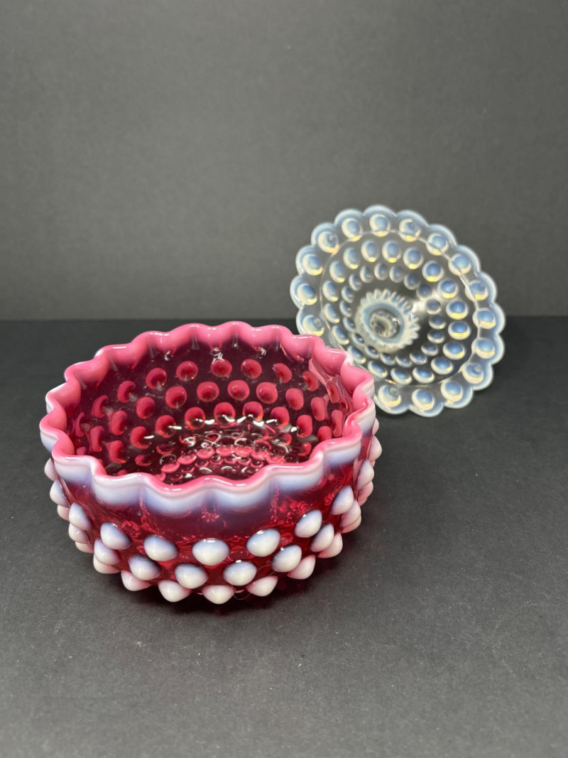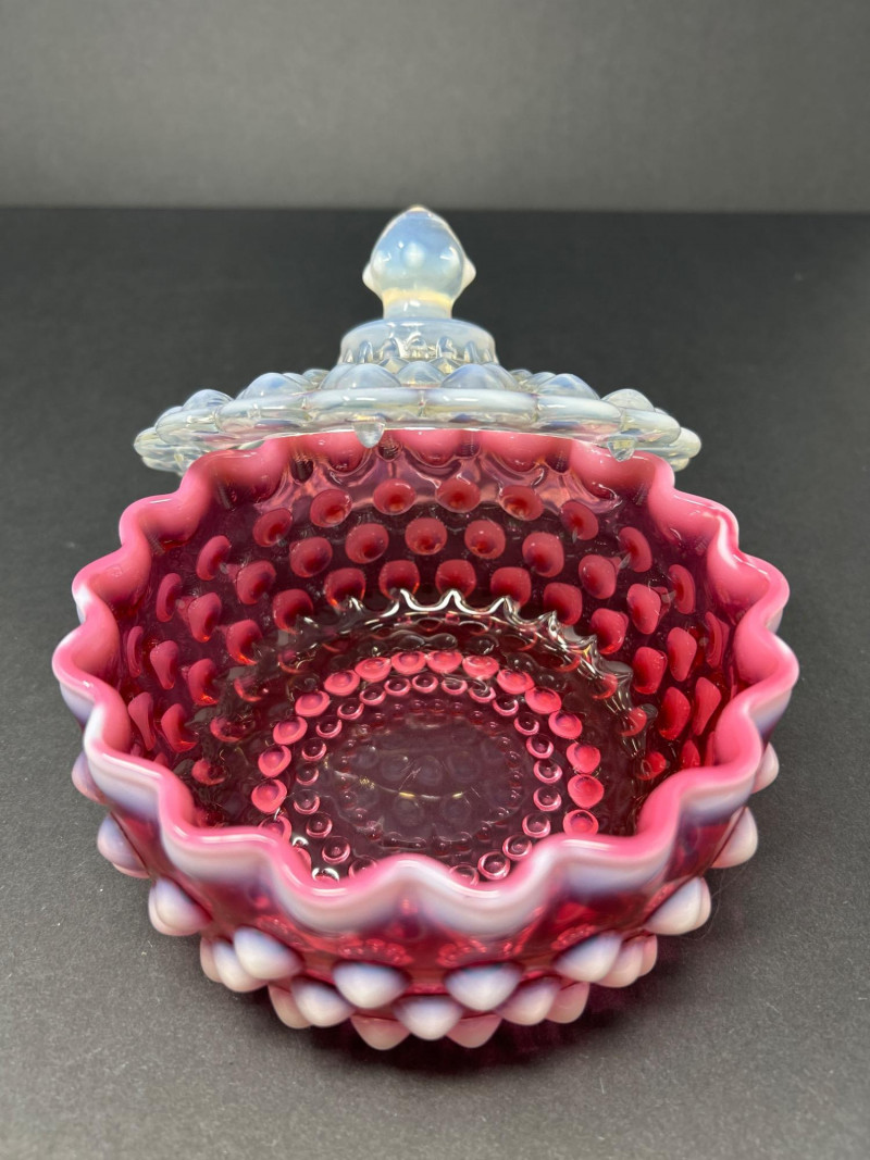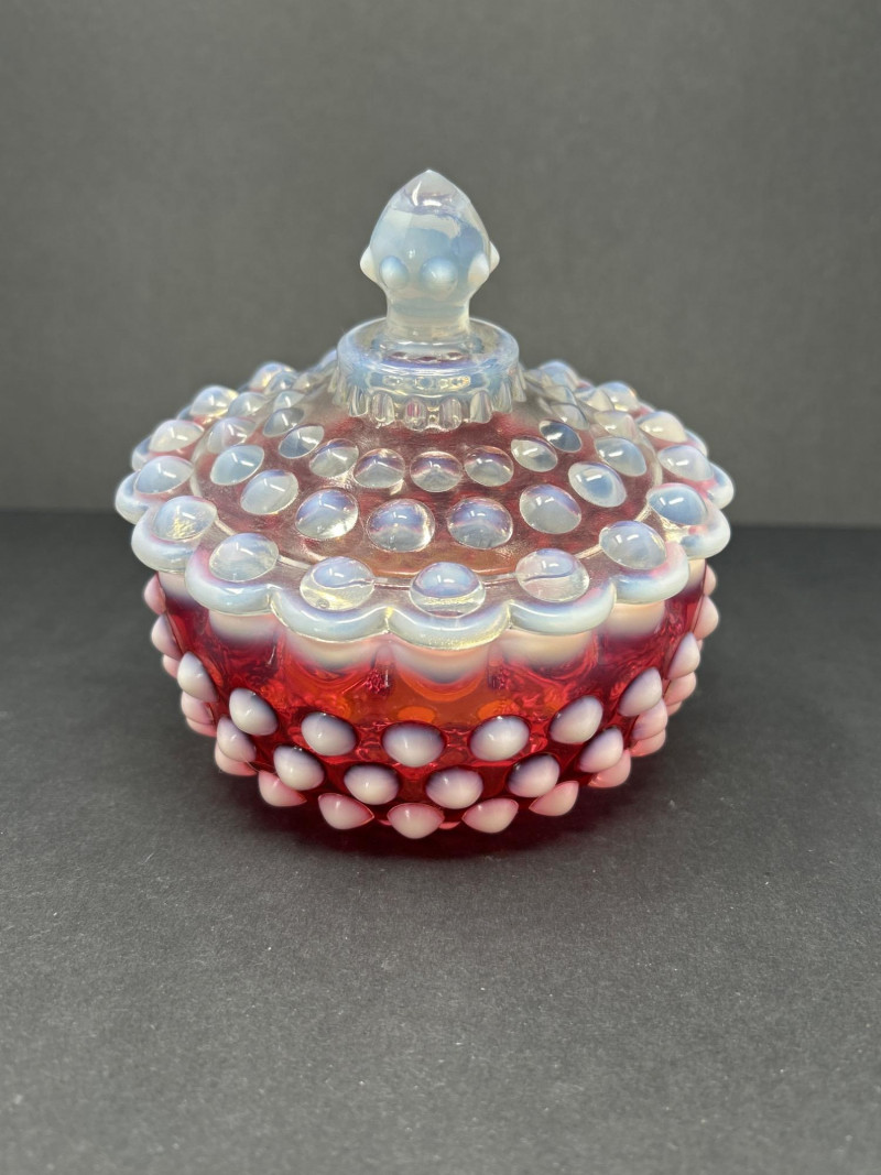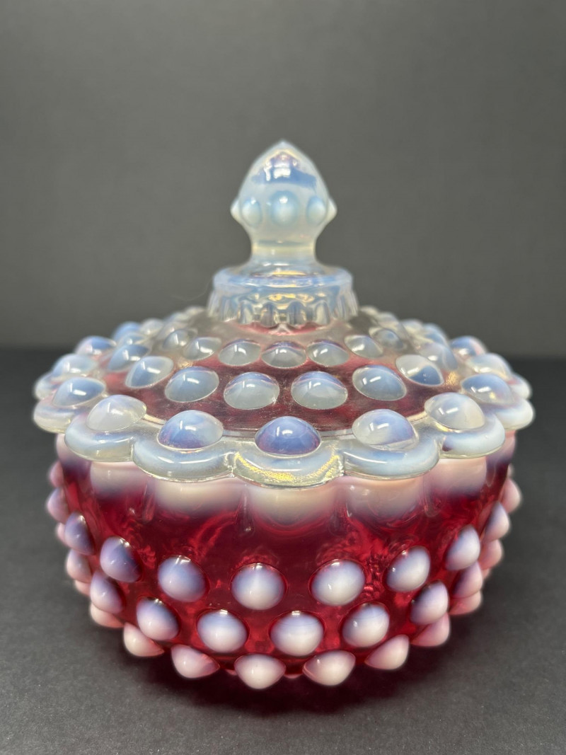 A dazzling Fenton Art Glass lidded candy dish, crafted in cranberry opalescent hobnail. The glass shimmers with iridescent hues of red, pink, and milky white, and features a raised hobnail texture throughout. The matching lid is topped with a finial and continues the hobnail motif, creating a unified and collectible presentation. Maker: Fenton Art Glass Material: Cranberry opalescent glass Pattern: Hobnail Collector’s Note:
