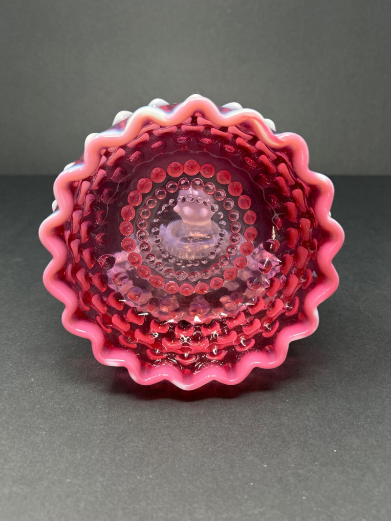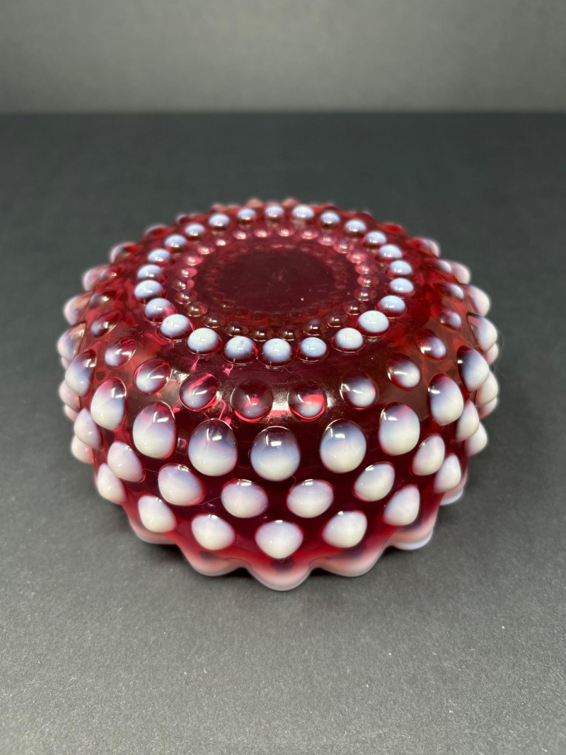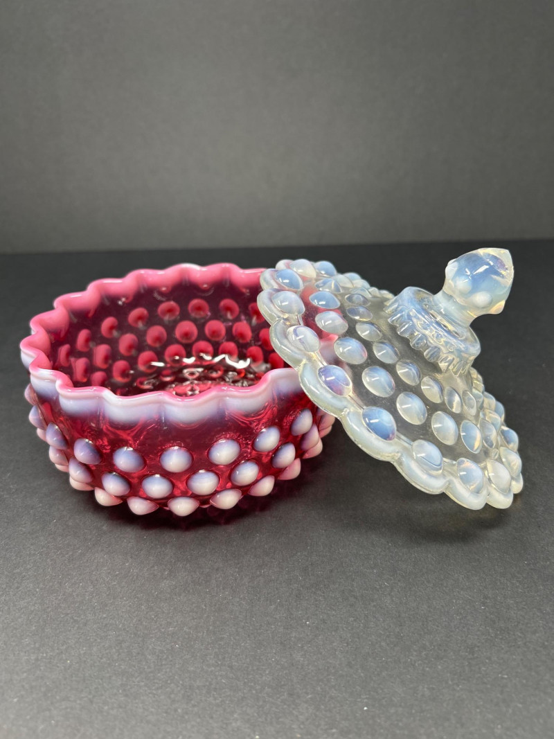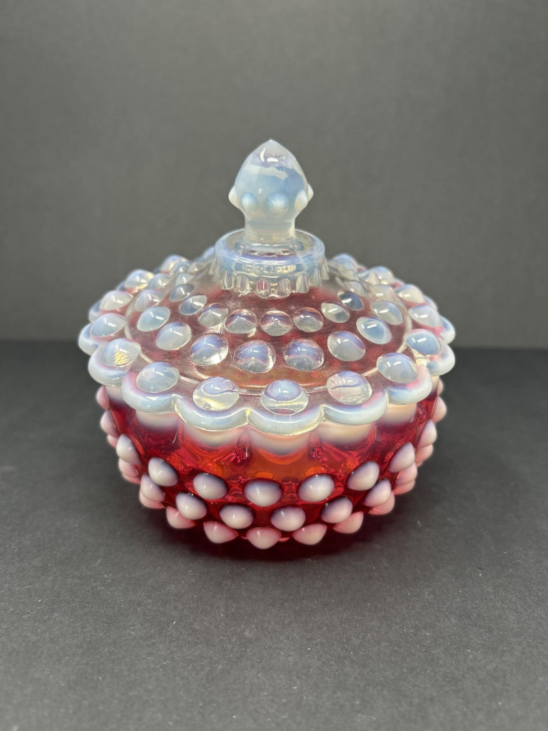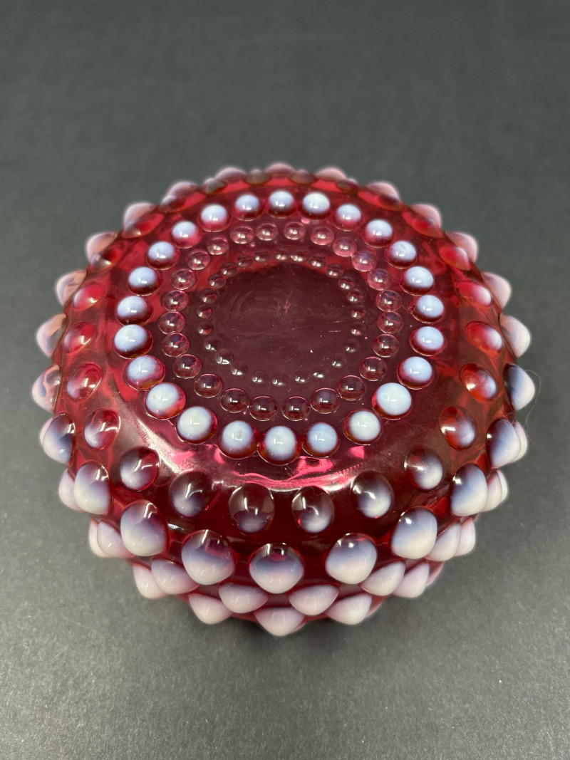 A dazzling Fenton Art Glass lidded candy dish, crafted in cranberry opalescent hobnail. The glass shimmers with iridescent hues of red, pink, and milky white, and features a raised hobnail texture throughout. The matching lid is topped with a finial and continues the hobnail motif, creating a unified and collectible presentation. Maker: Fenton Art Glass Material: Cranberry opalescent glass Pattern: Hobnail Collector’s Note: