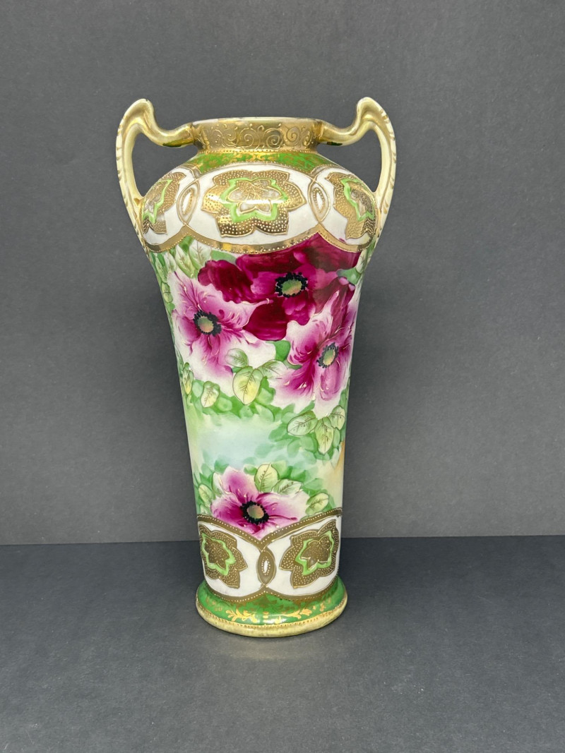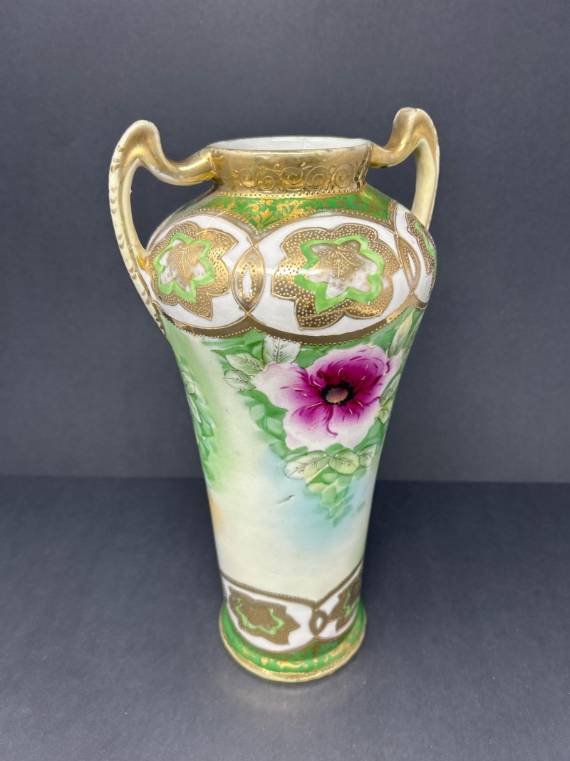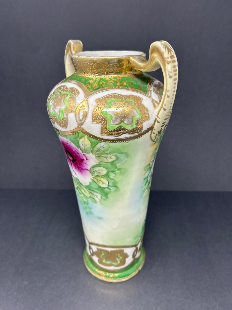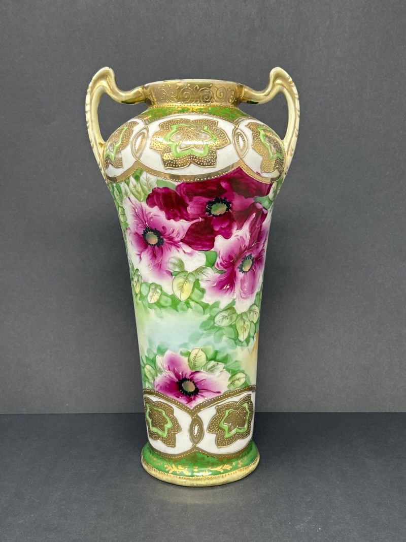 An elegant hand-painted Nippon vase from Japan, dating circa 1891–1921, featuring a classic double-handled silhouette. The body is adorned with vibrant floral motifs and raised gold detailing, showcasing the refined artistry of early Nippon porcelain. Origin: Japan Material: Porcelain Design: Floral with raised gilt accents Collector’s Note:
