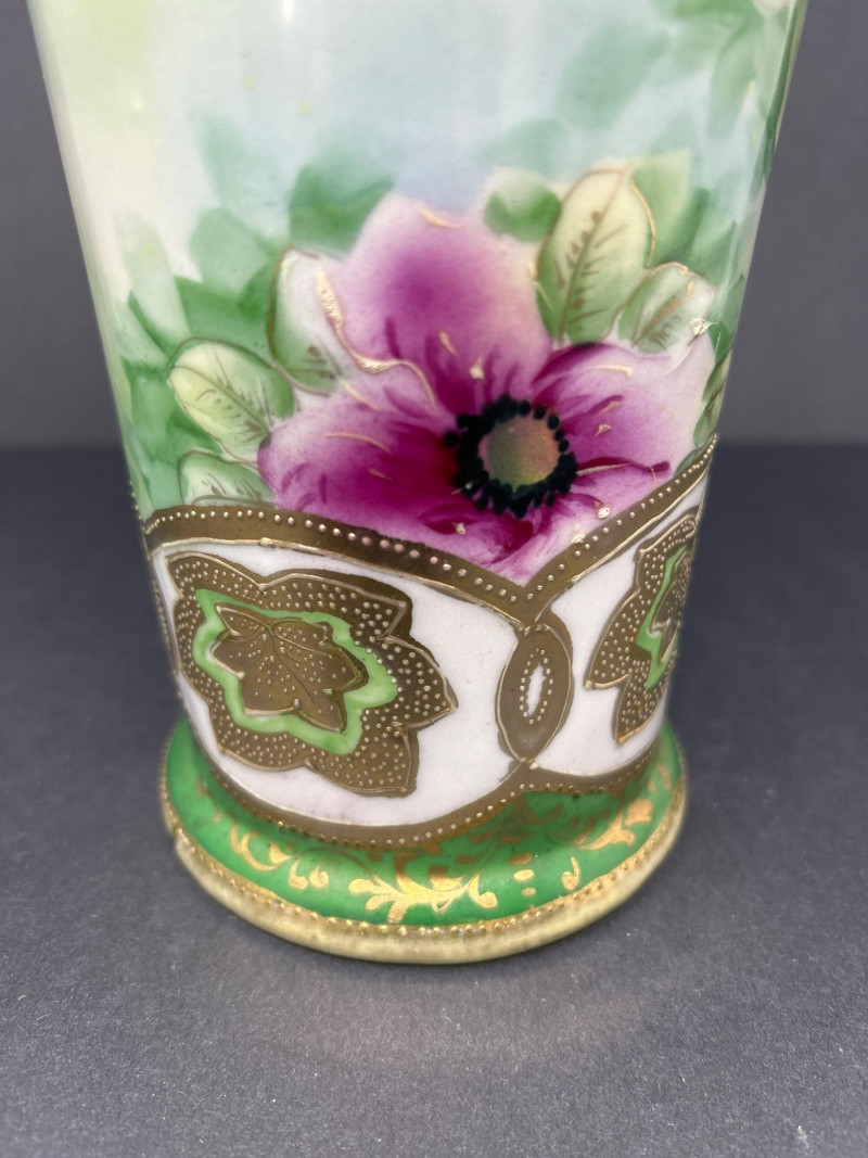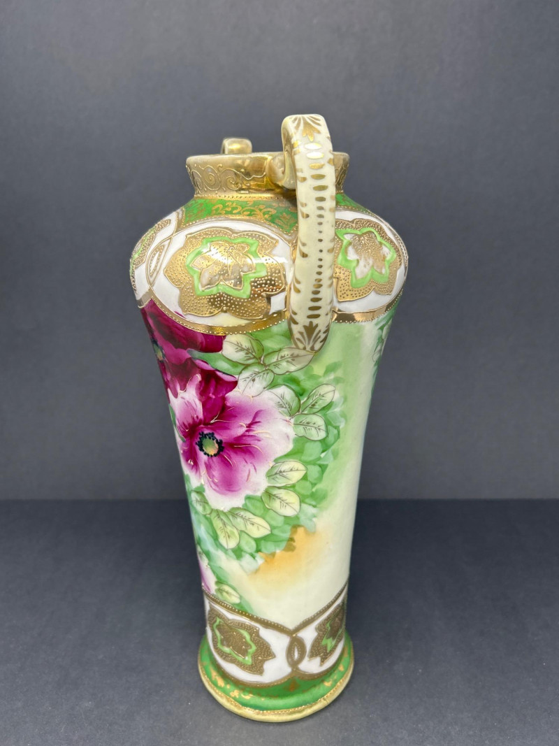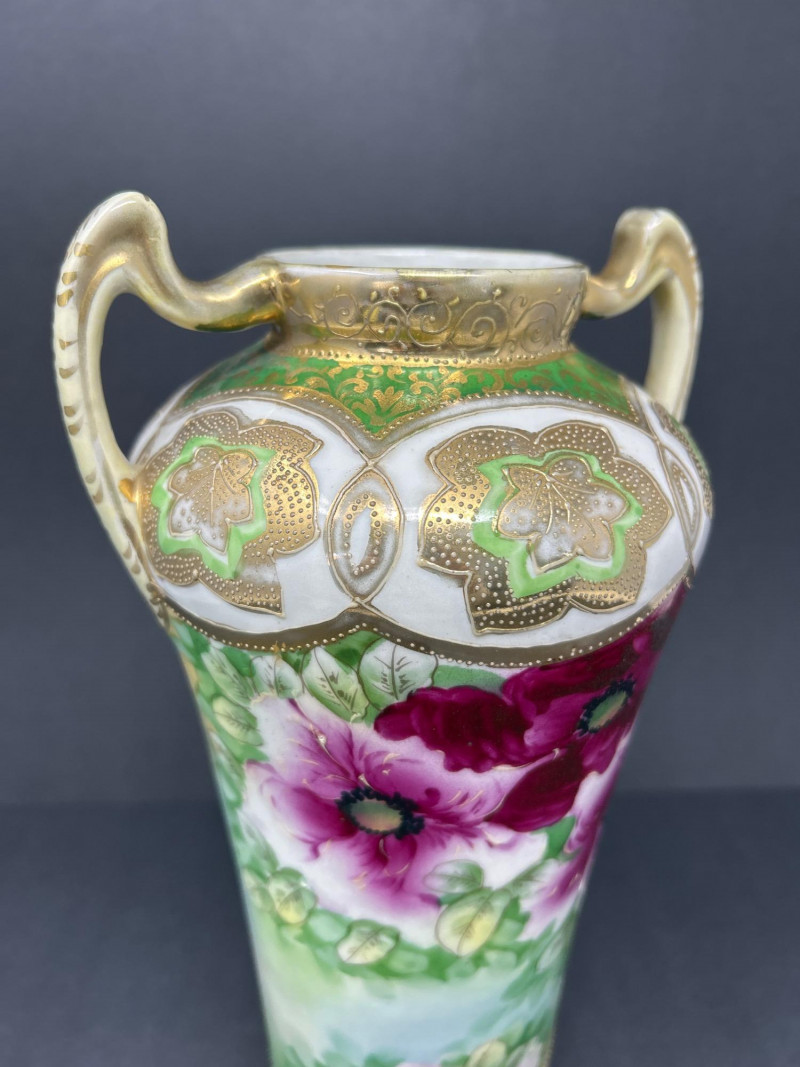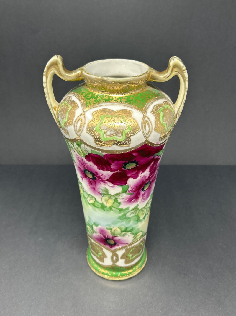 An elegant hand-painted Nippon vase from Japan, dating circa 1891–1921, featuring a classic double-handled silhouette. The body is adorned with vibrant floral motifs and raised gold detailing, showcasing the refined artistry of early Nippon porcelain. Origin: Japan Material: Porcelain Design: Floral with raised gilt accents Collector’s Note: