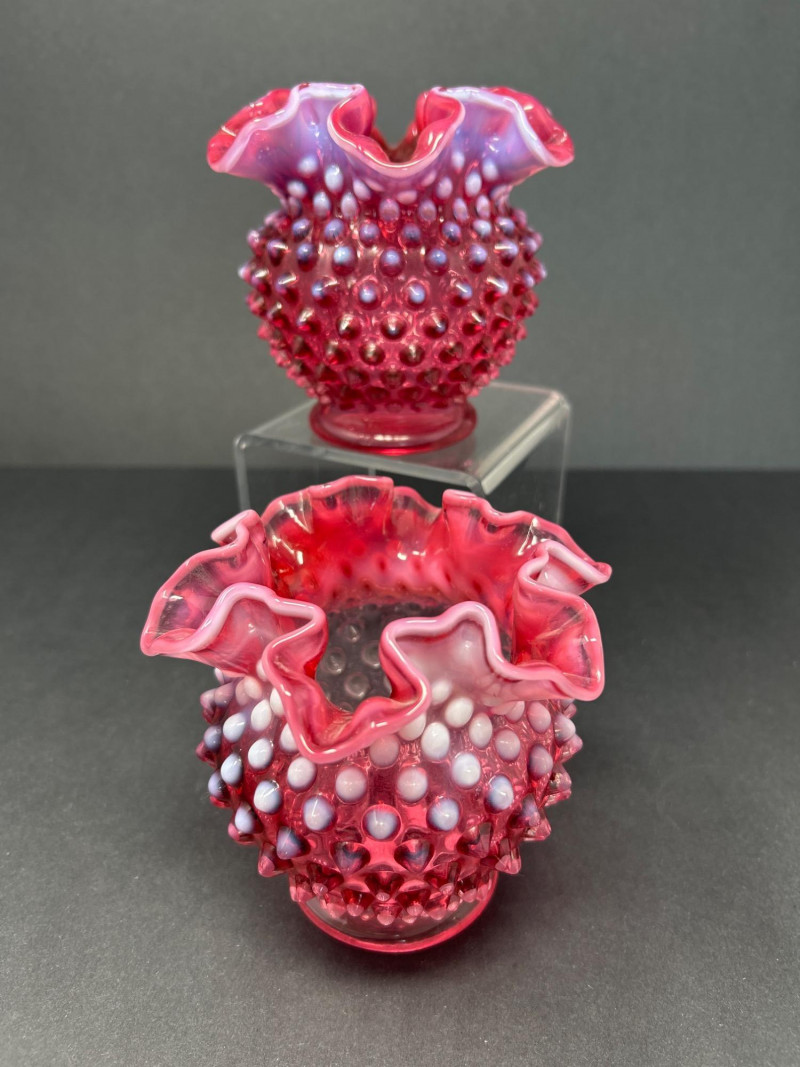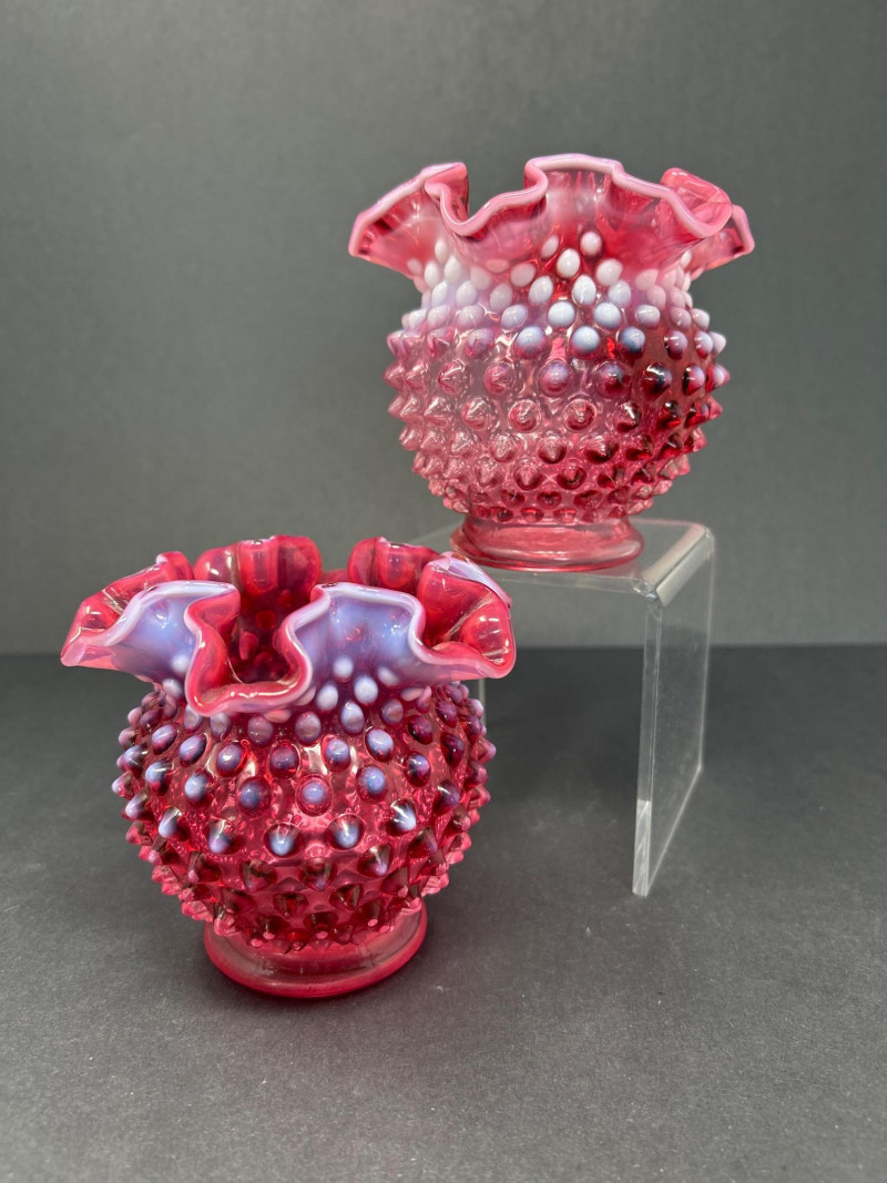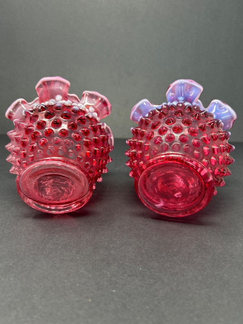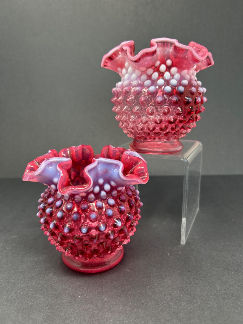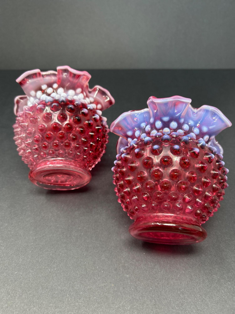 Two hand-blown Fenton opalescent cranberry vases, each featuring a classic hobnail texture and double-crimped ruffled rim. The ombré effect transitions from deep raspberry to soft lavender, creating a luminous interplay of color and form. A charming duo for display or gifting. Origin: United States