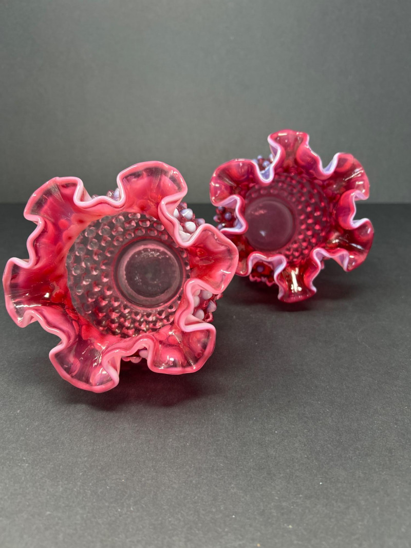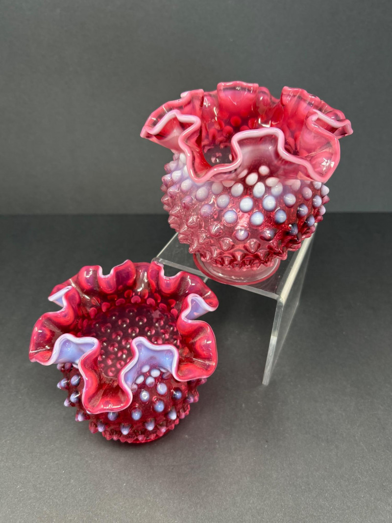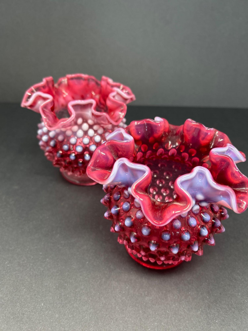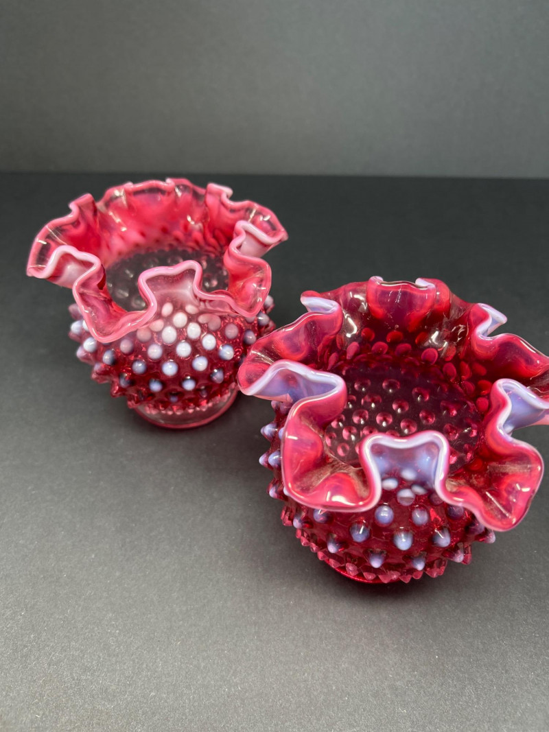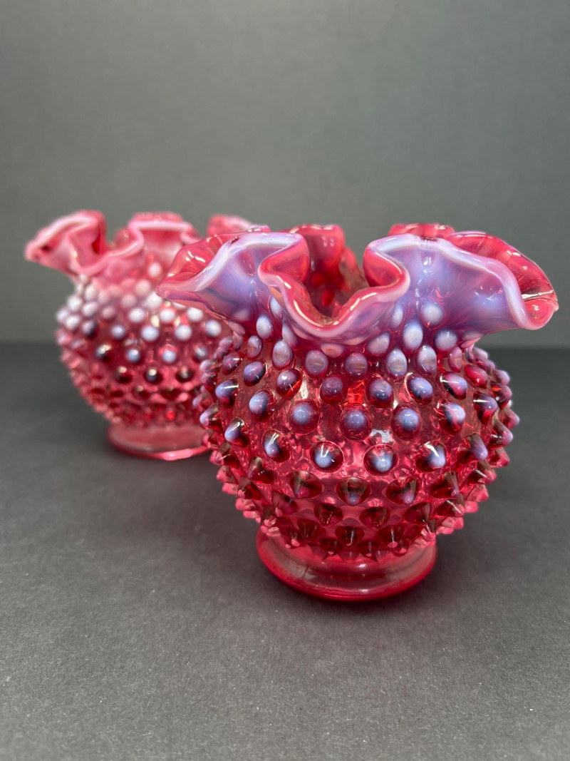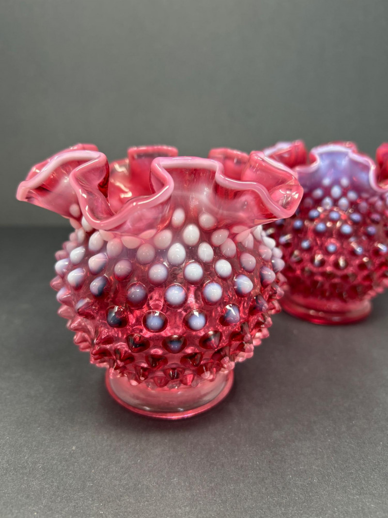 Two hand-blown Fenton opalescent cranberry vases, each featuring a classic hobnail texture and double-crimped ruffled rim. The ombré effect transitions from deep raspberry to soft lavender, creating a luminous interplay of color and form. A charming duo for display or gifting. Origin: United States