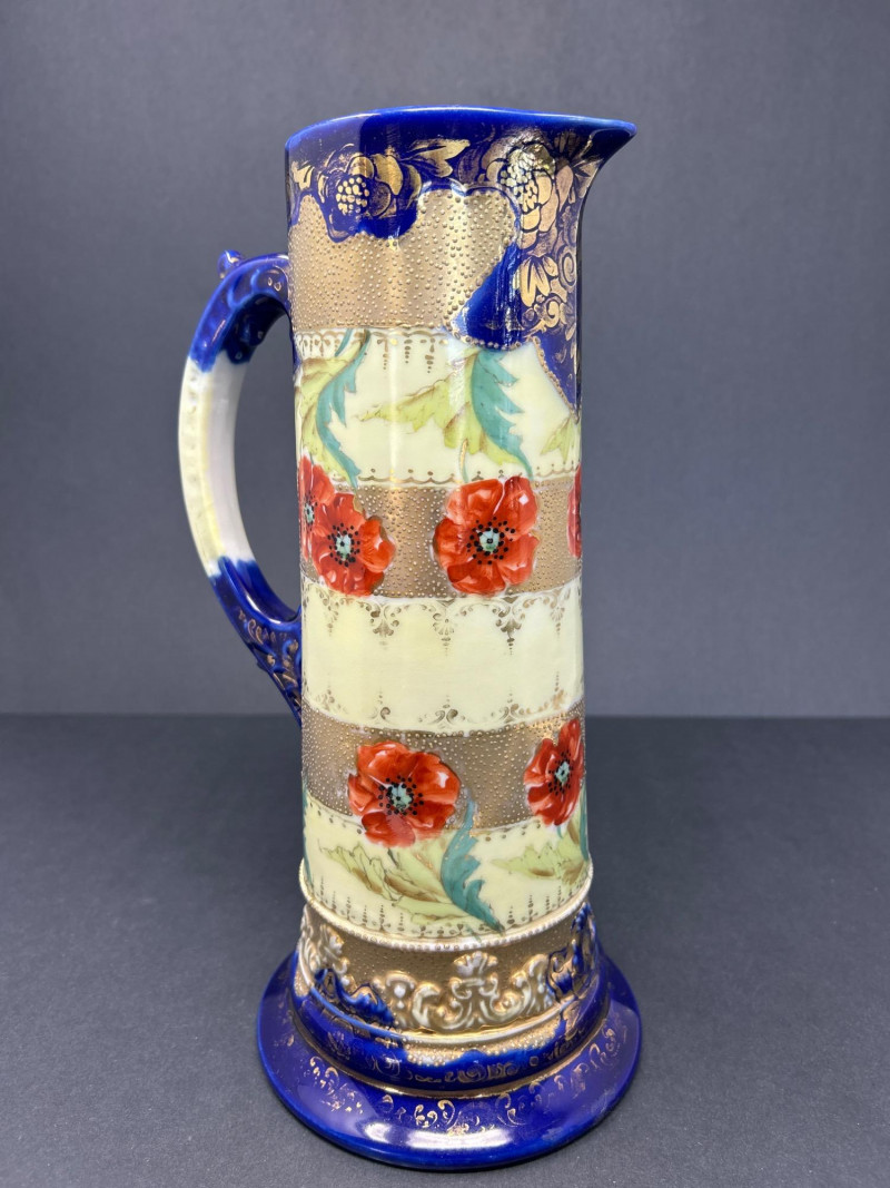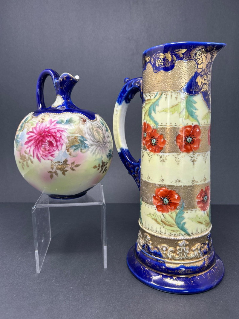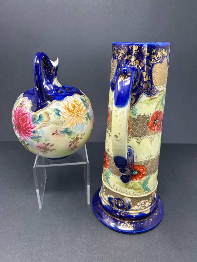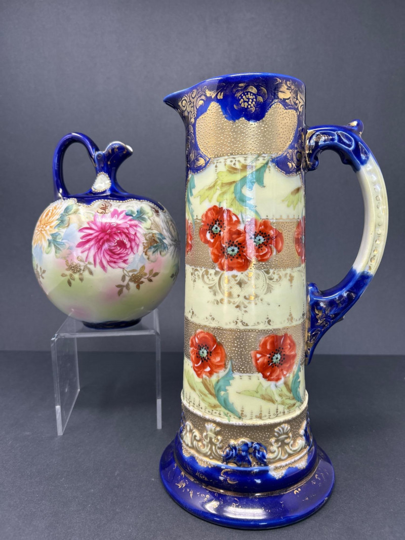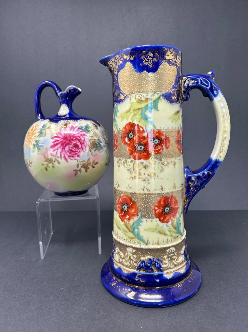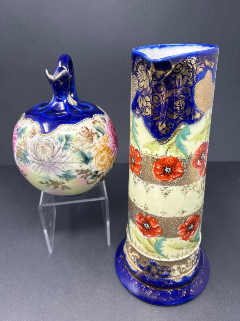 A beautiful pairing of hand-painted Nippon ceramic vases, each showcasing distinct floral artistry and raised gold moriage detailing. Round Vase: 8" tall, featuring a soft cream background with a large pink chrysanthemum and delicate blue and gold blossoms. Tall Vase: 12" tall, decorated with bold red poppies and green foliage framed by ornate cobalt blue and gold accents. Origin: Japan (Nippon era, circa 1891–1921) Collector’s Note: