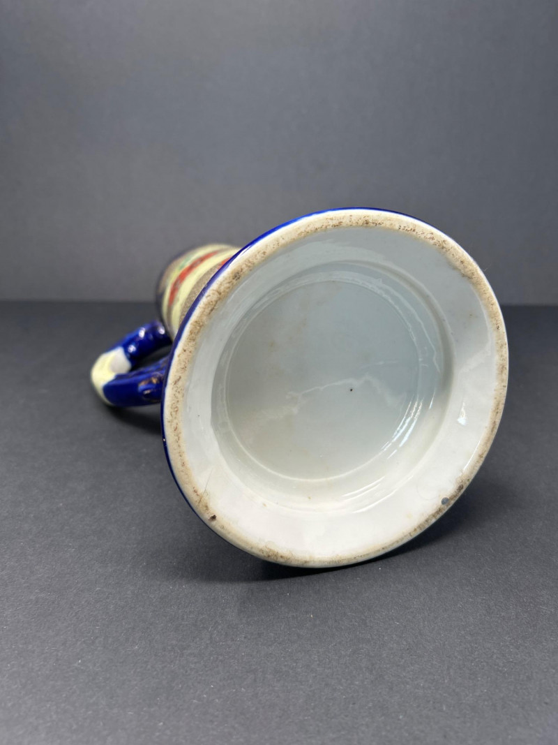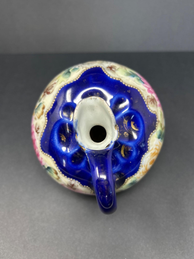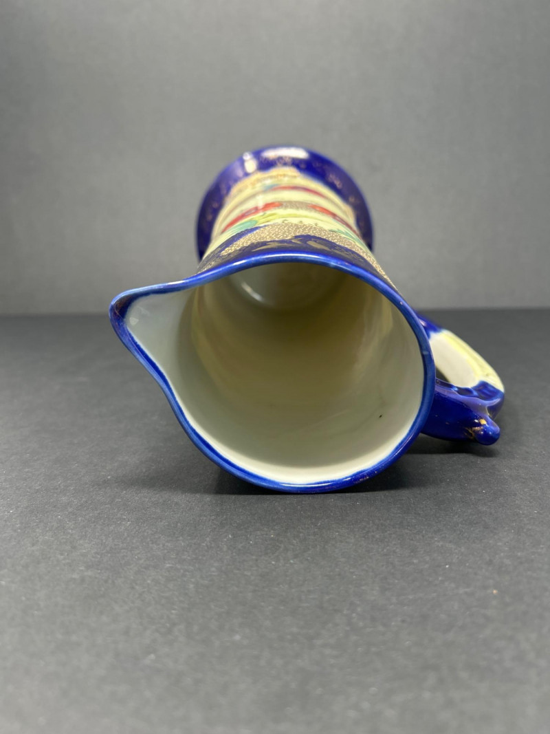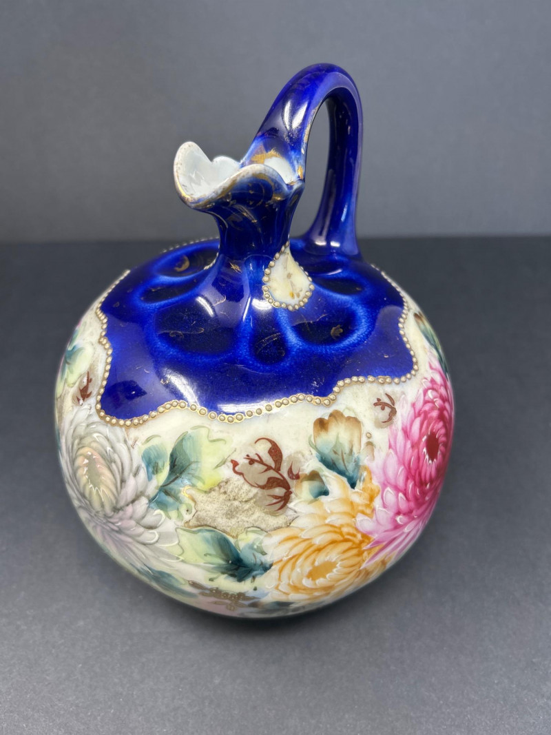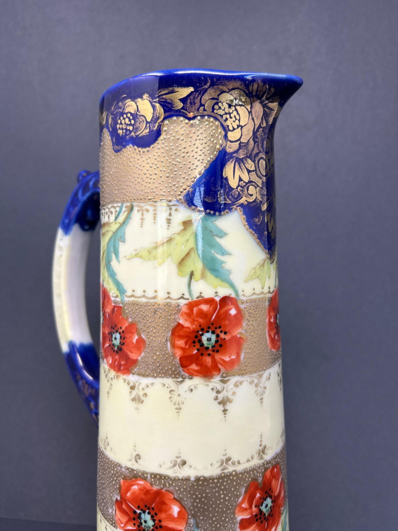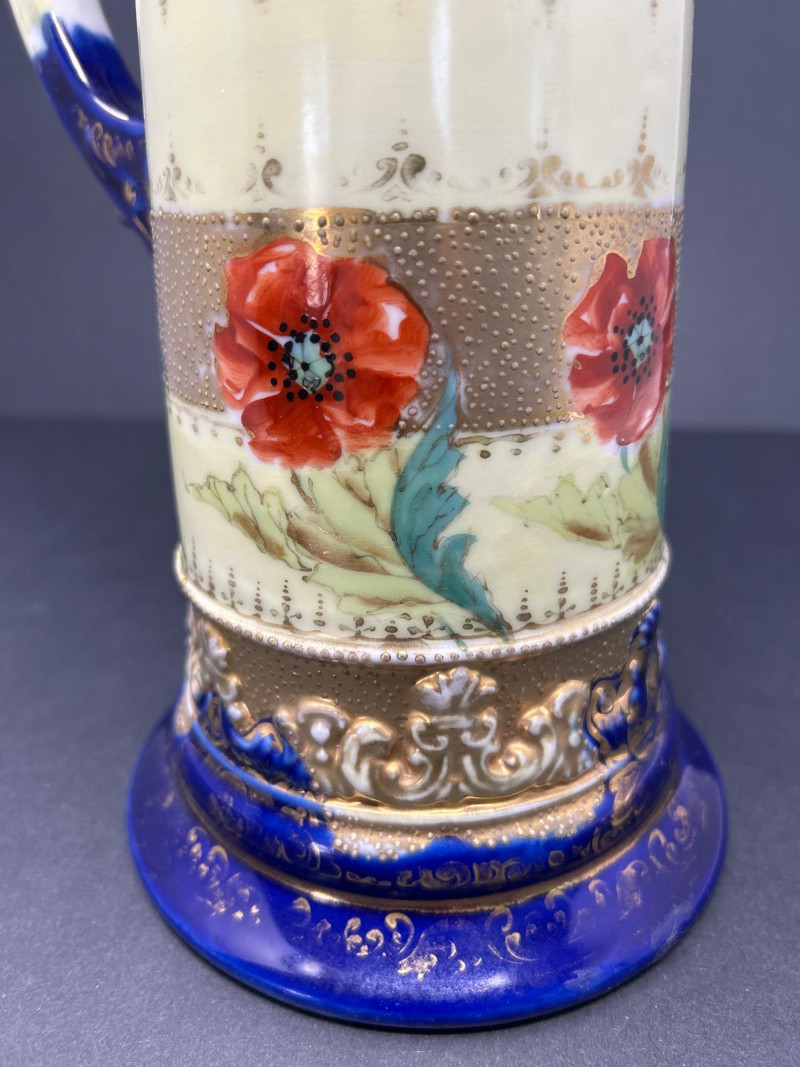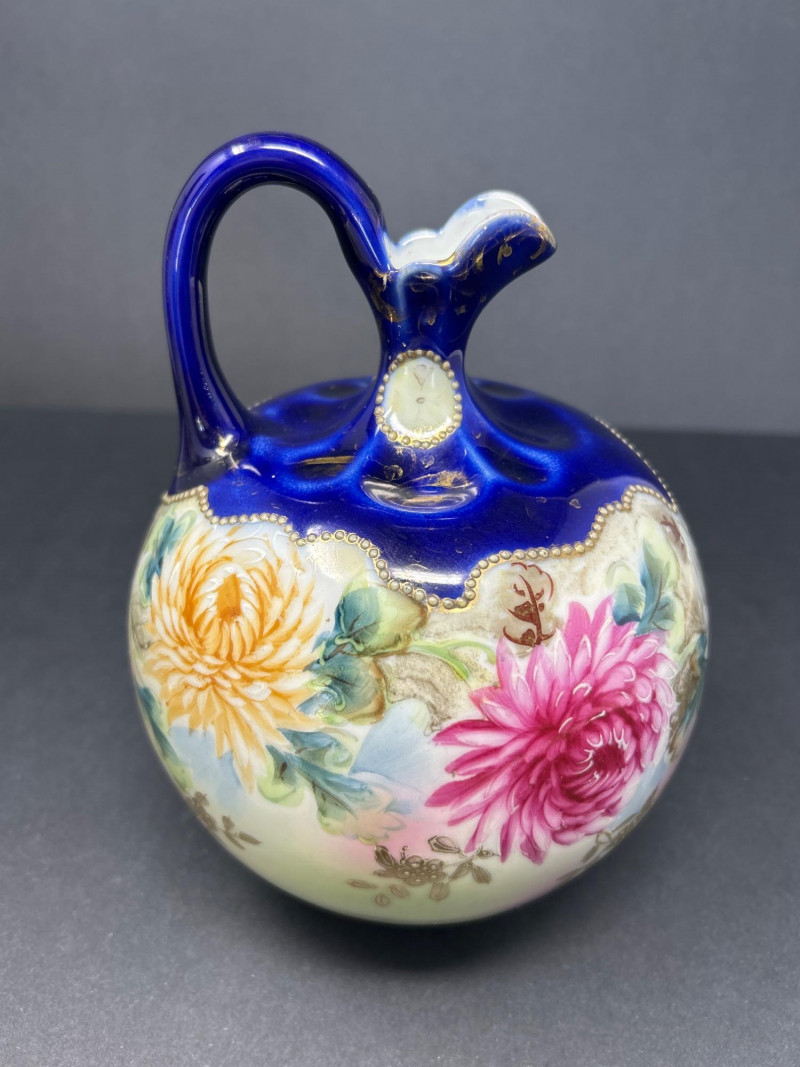 A beautiful pairing of hand-painted Nippon ceramic vases, each showcasing distinct floral artistry and raised gold moriage detailing. Round Vase: 8" tall, featuring a soft cream background with a large pink chrysanthemum and delicate blue and gold blossoms. Tall Vase: 12" tall, decorated with bold red poppies and green foliage framed by ornate cobalt blue and gold accents. Origin: Japan (Nippon era, circa 1891–1921) Collector’s Note: