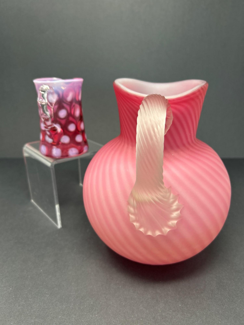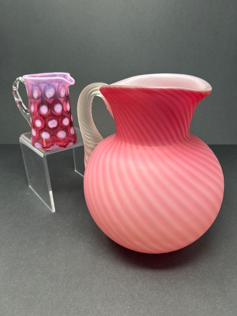 A charming duo of vintage art glass pitchers, each showcasing unique craftsmanship and color. Large Pitcher: 8.5" tall, featuring a frosted cranberry swirl design with a ribbed texture and clear handle. Possibly Victorian era. Small Pitcher: 4" tall, a Fenton Coin Dot creamer in rich cranberry glass with circular indentations and a clear applied handle. Collector’s Note: