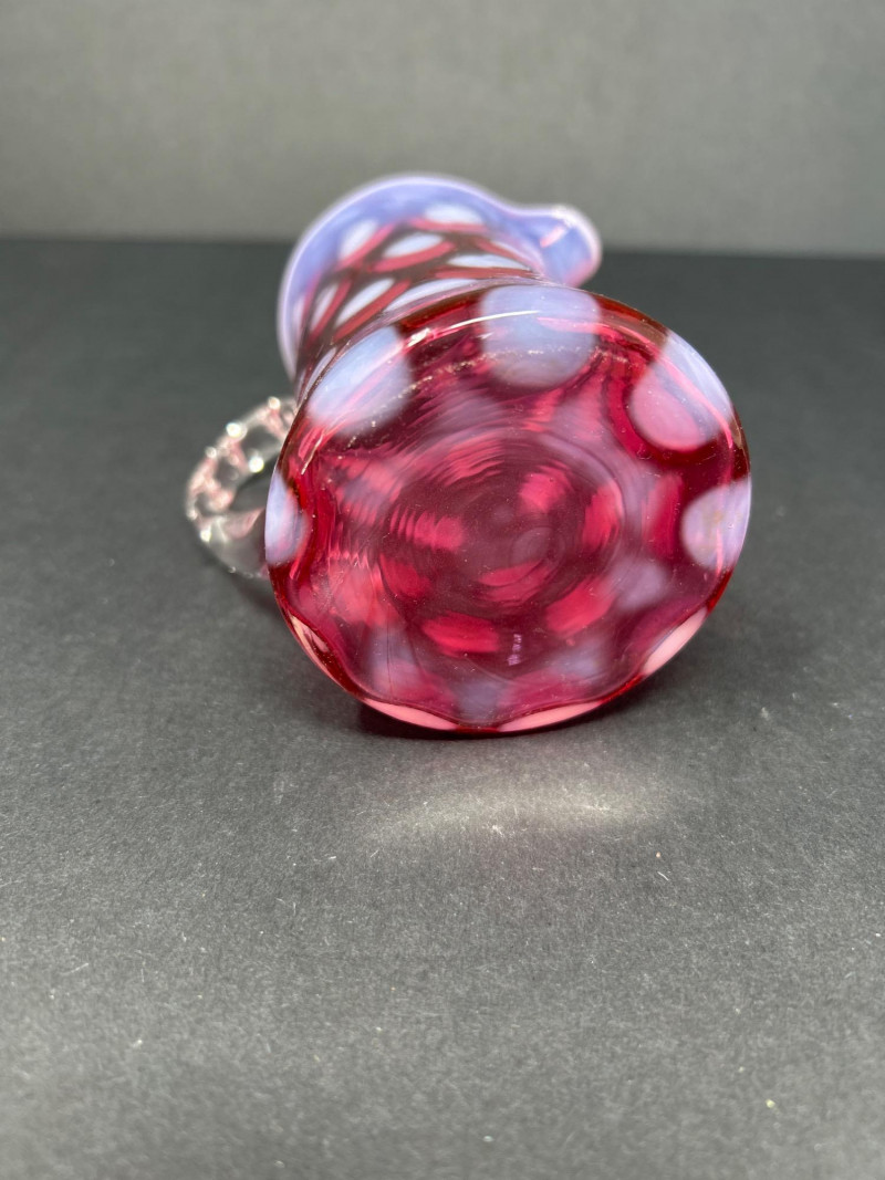 This pairing offers a delightful contrast in form and texture—perfect for collectors of Fenton or Victorian glassware, or anyone drawn to cranberry hues and tactile design.