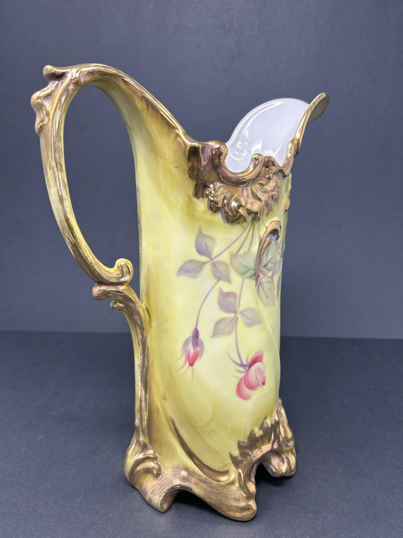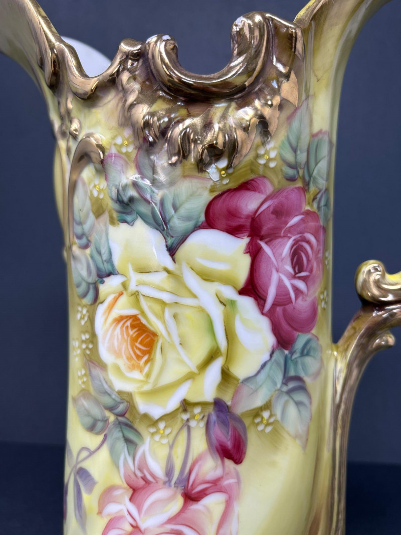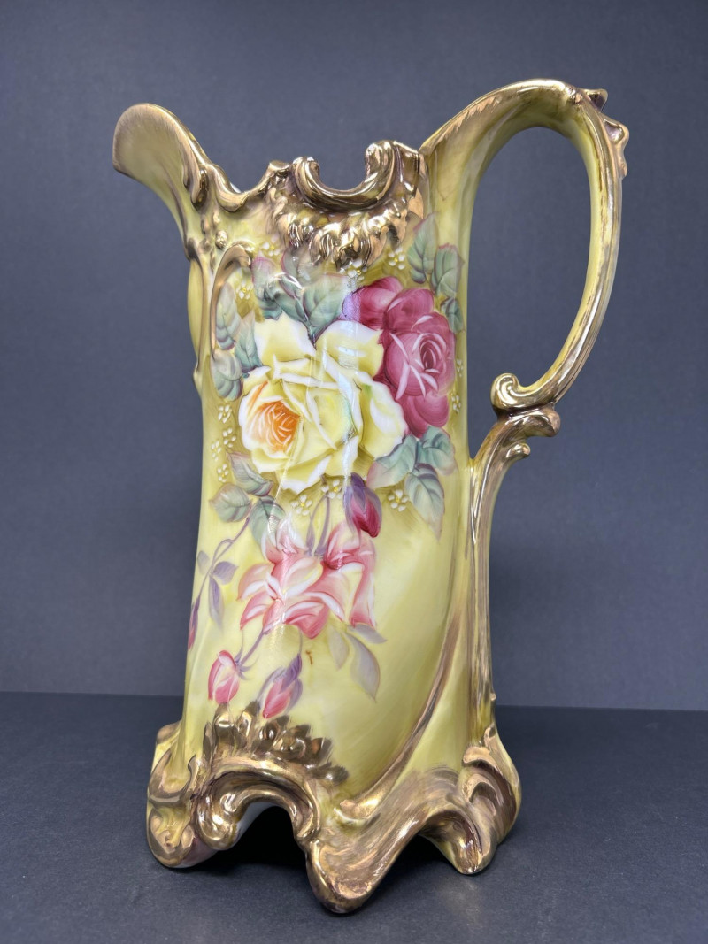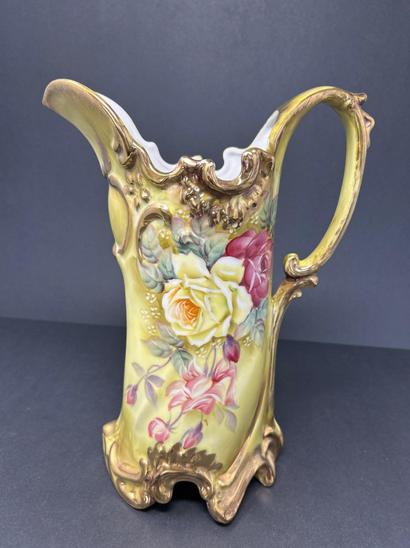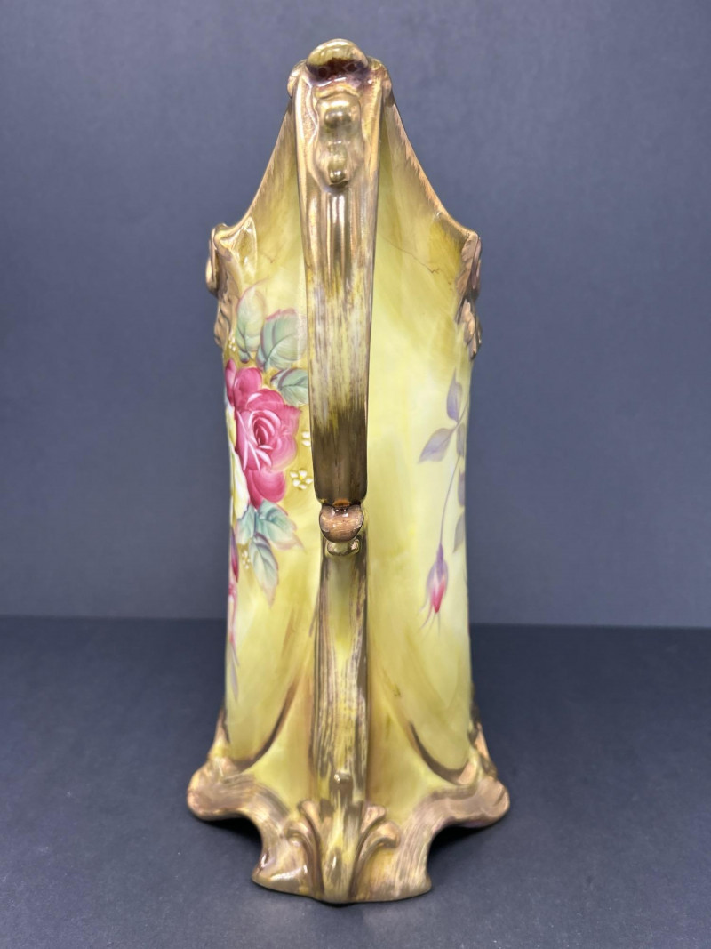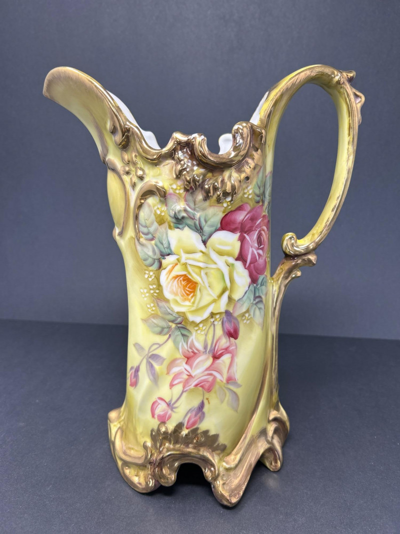 A stunning porcelain pitcher, featuring a soft yellow background adorned with hand-painted roses in shades of pink, cream, and red, accented by ornate gold detailing around the rim, handle, and base. The sculptural form and floral artistry reflect the elegance of early 20th-century Japanese export ware. Origin: Japan (Nippon era, circa 1891–1921) Material: Porcelain Design: Roses with raised gold accents Collector’s Note: