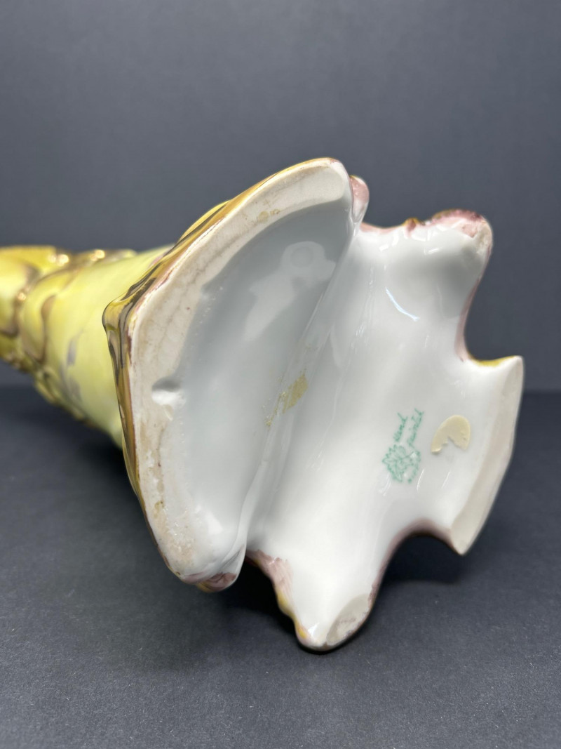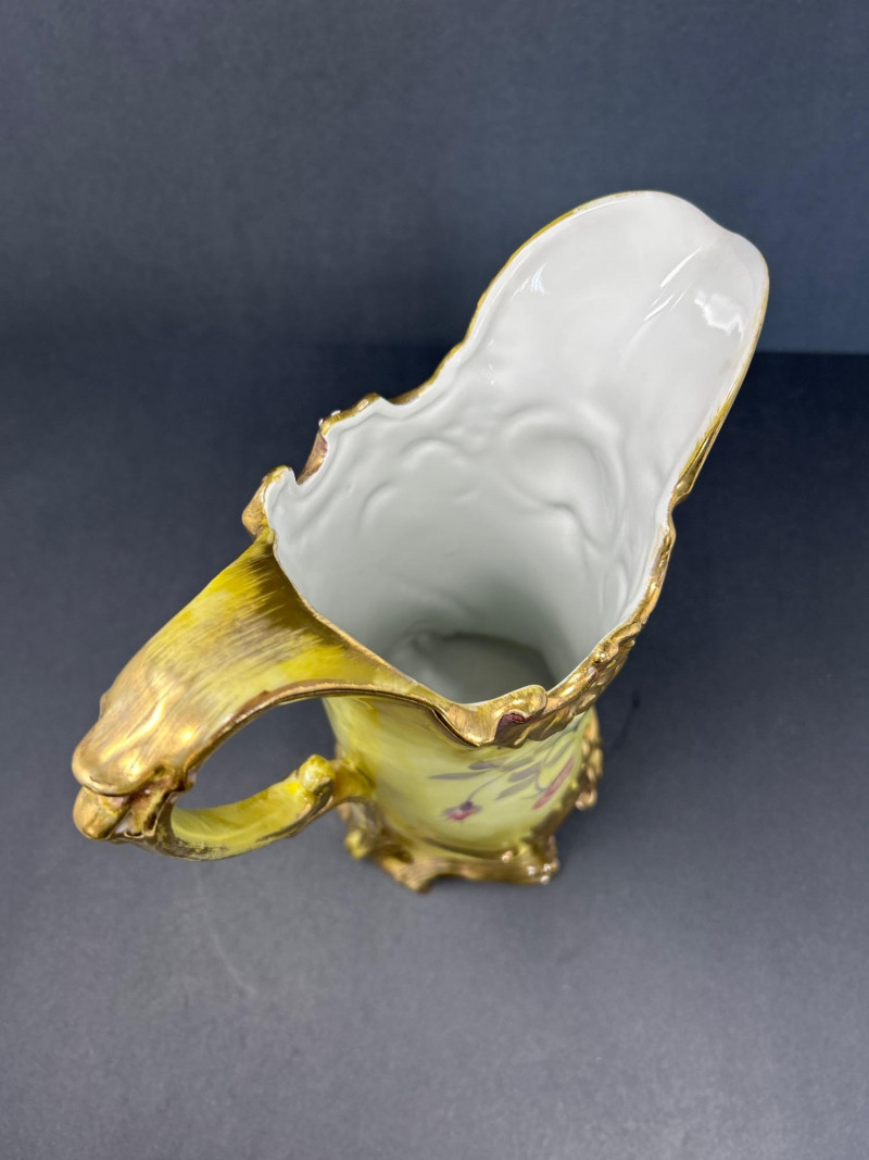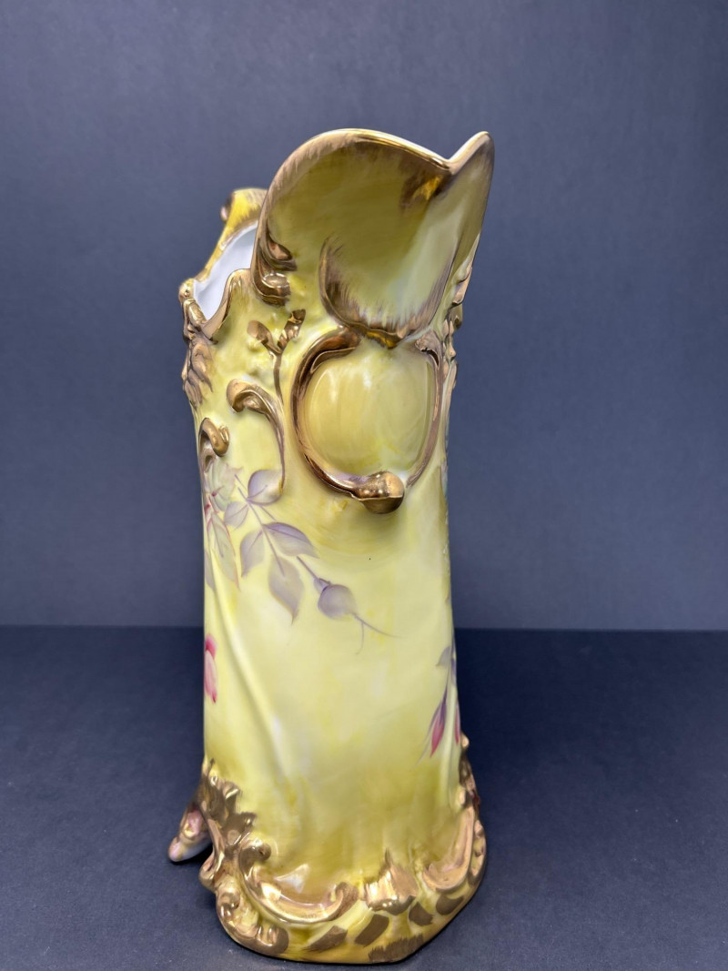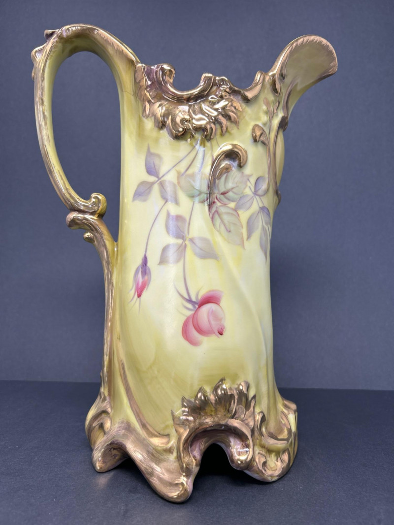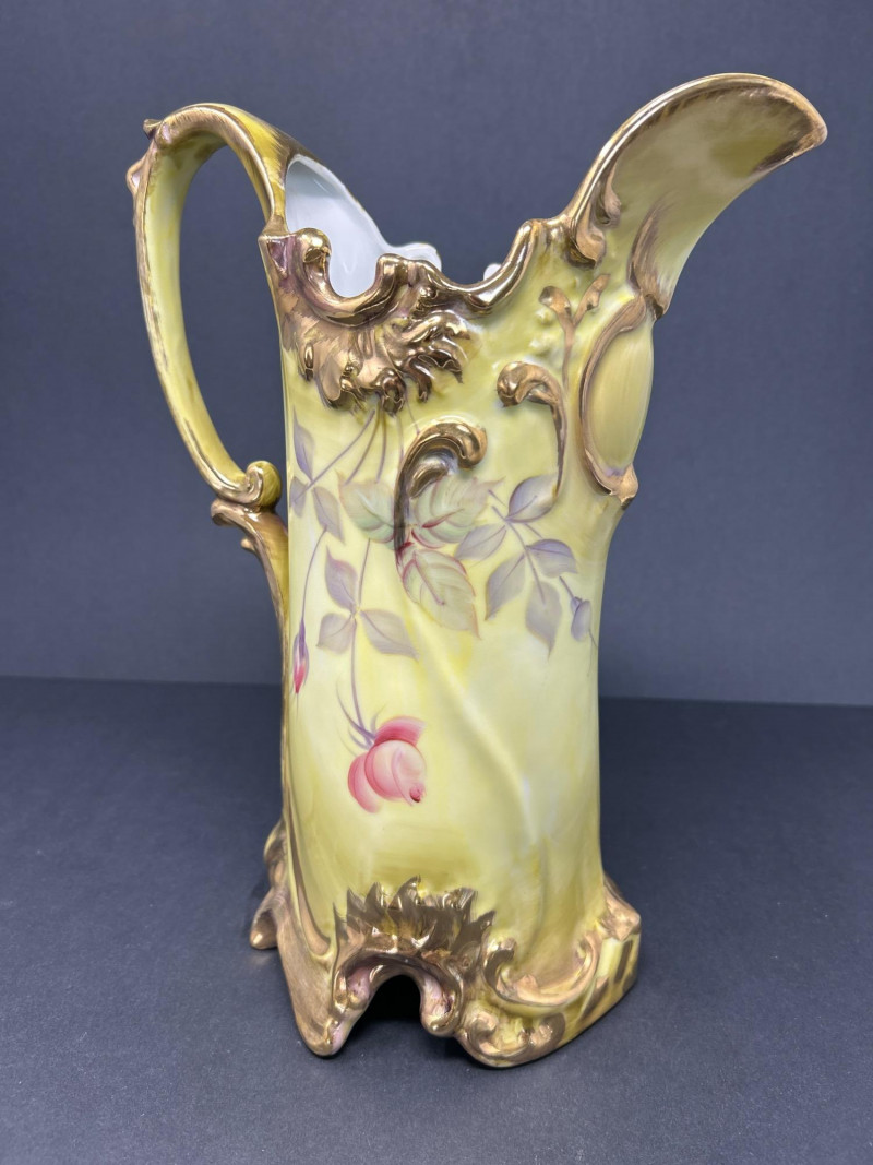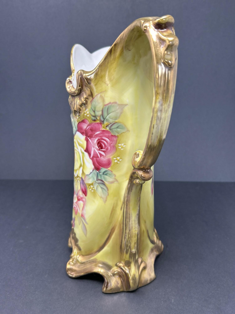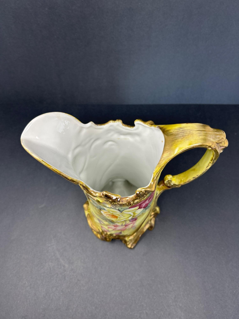 A stunning porcelain pitcher, featuring a soft yellow background adorned with hand-painted roses in shades of pink, cream, and red, accented by ornate gold detailing around the rim, handle, and base. The sculptural form and floral artistry reflect the elegance of early 20th-century Japanese export ware. Origin: Japan (Nippon era, circa 1891–1921) Material: Porcelain Design: Roses with raised gold accents Collector’s Note: