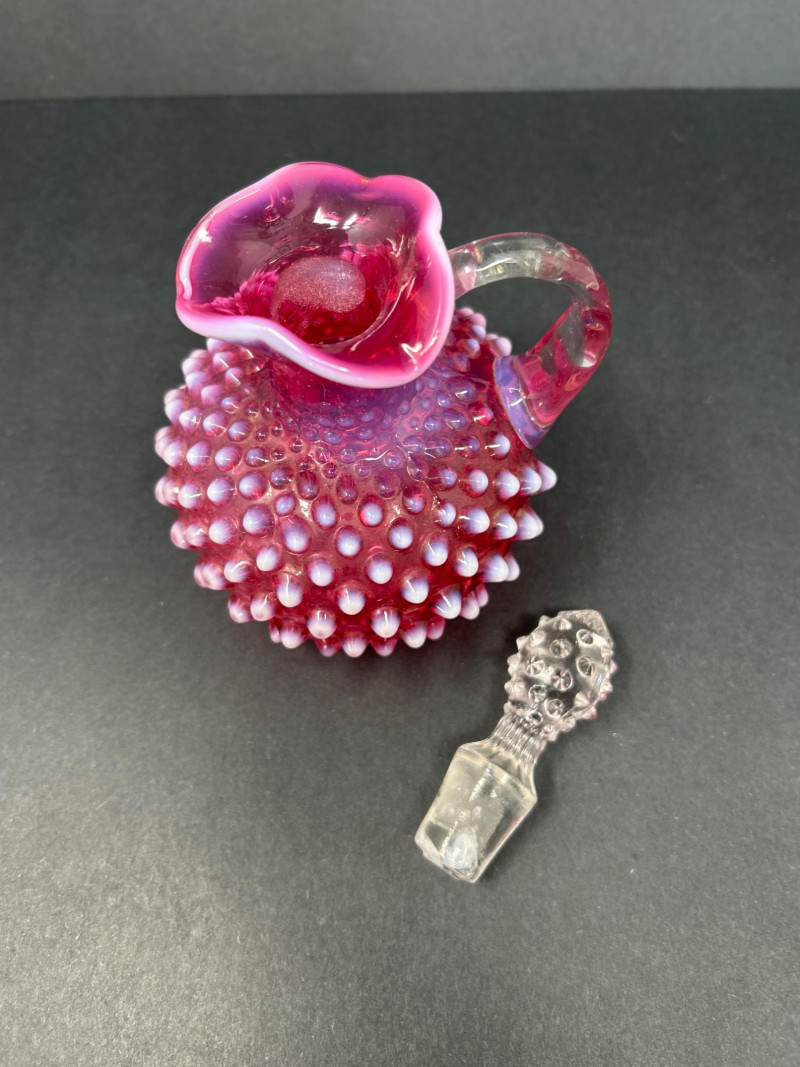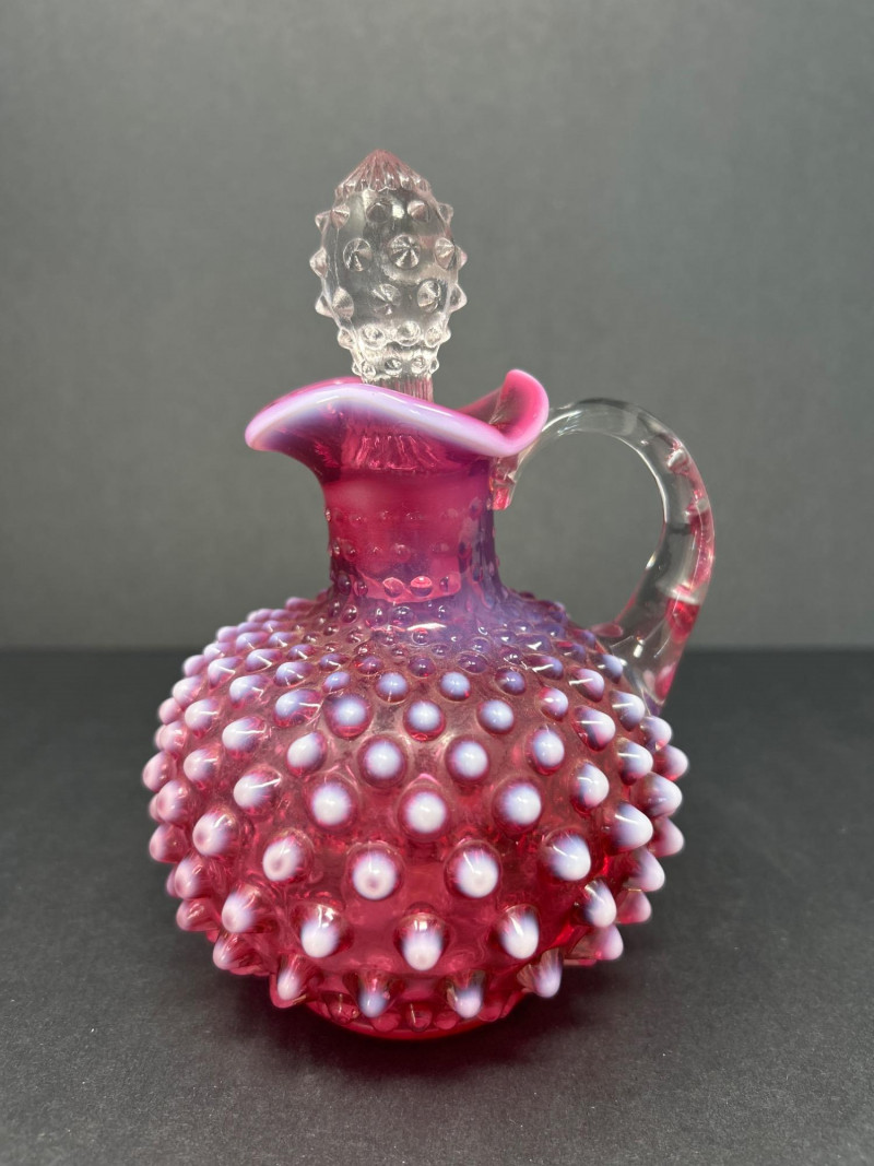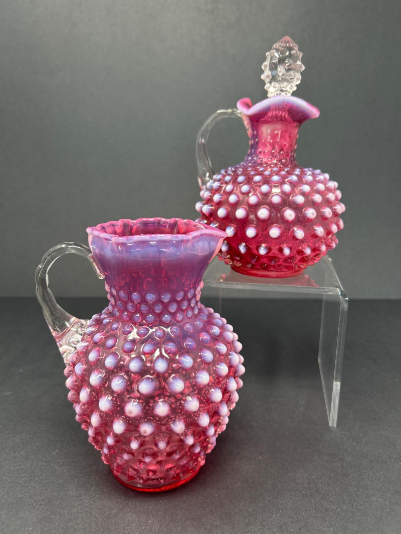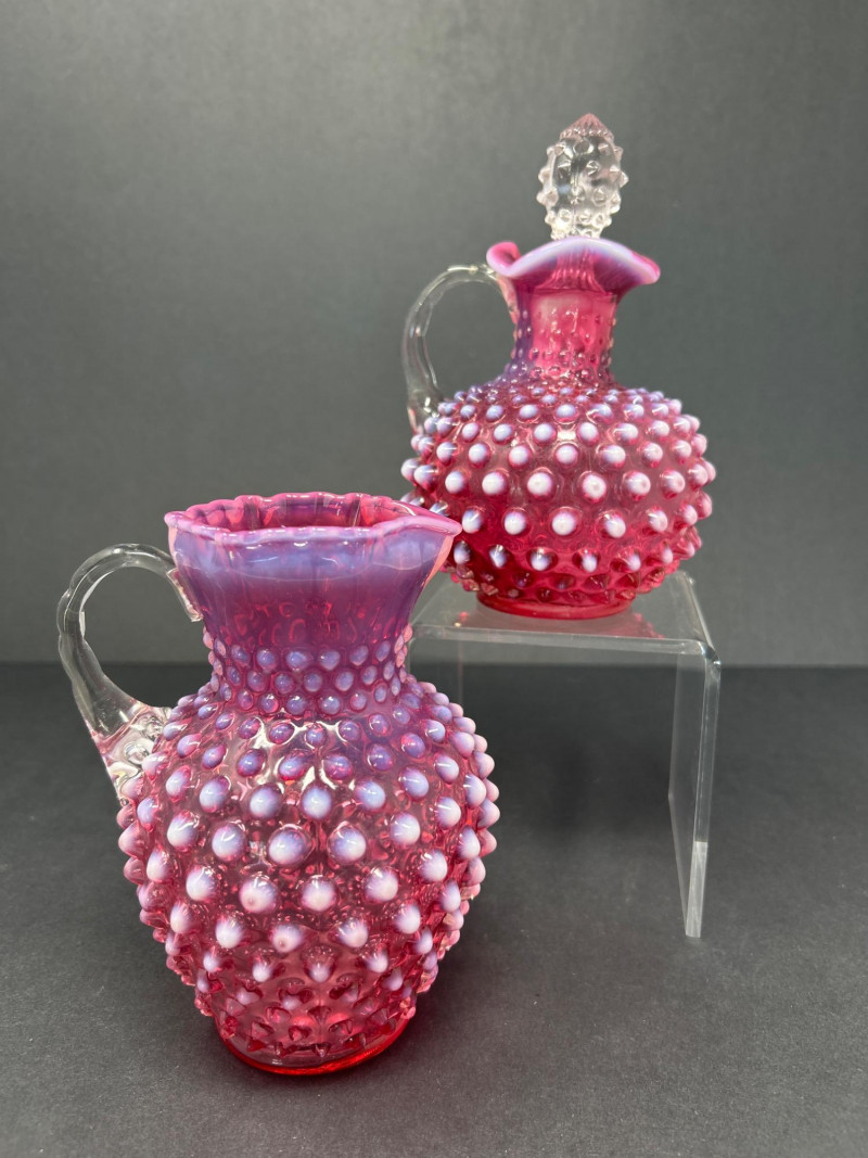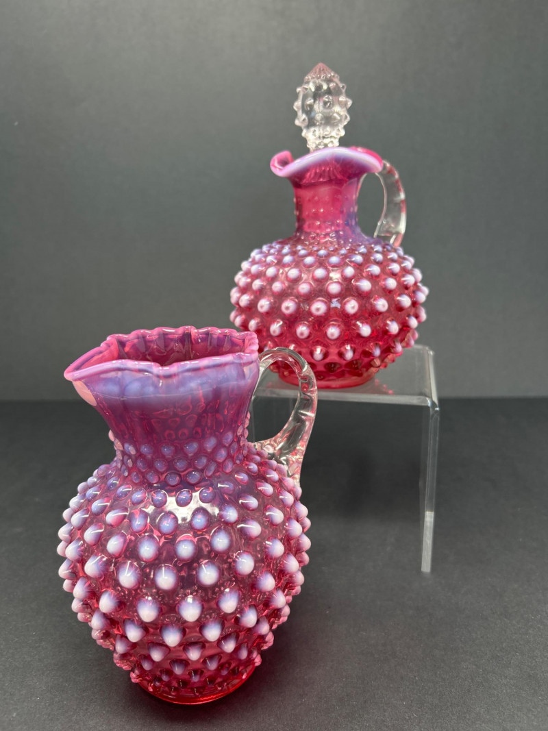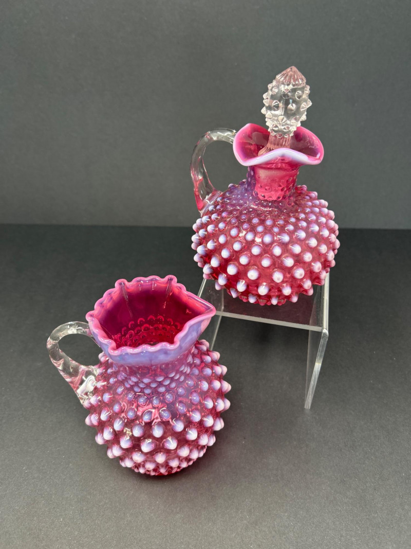 A radiant pairing of Fenton opalescent cranberry glass, crafted by encasing a layer of gold ruby within opalescent glass. The hobnail texture adds depth and sparkle, while the gradient coloration transitions from rich raspberry to soft blush. Cruet with original stopper and decorative finial, approx. 6.5" H Pitcher with flared rim and clear applied handle, approx. 6" H Origin: United States