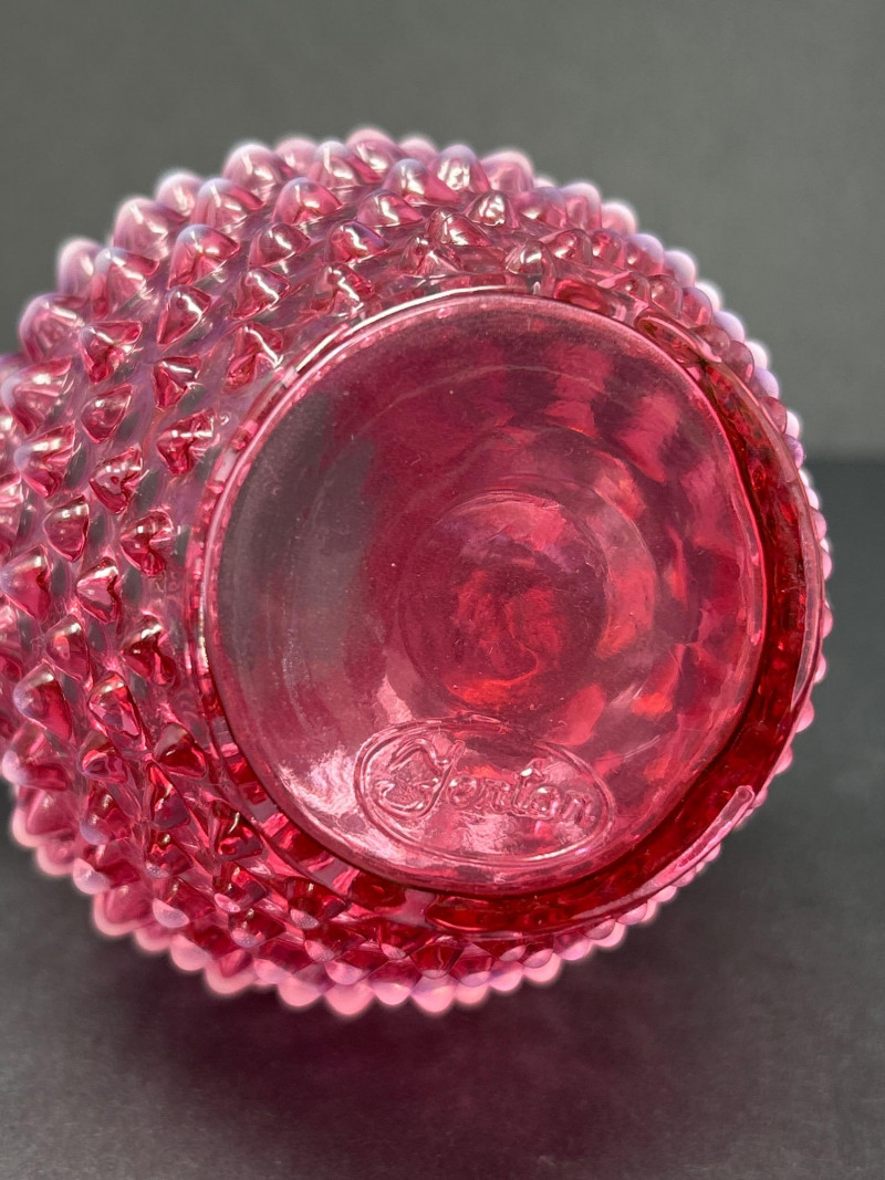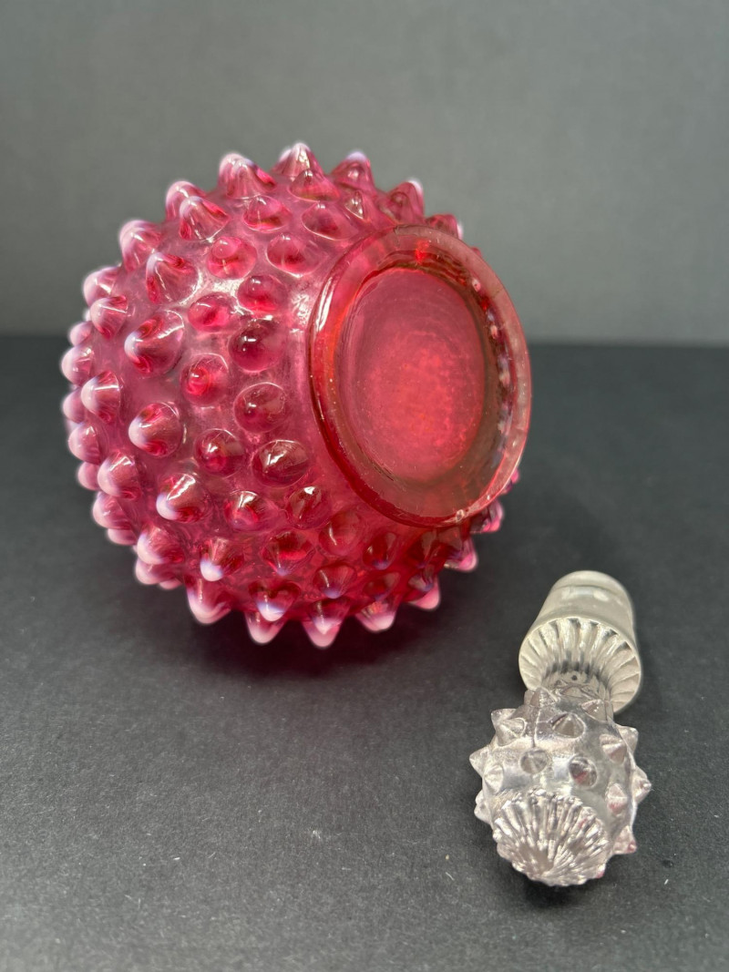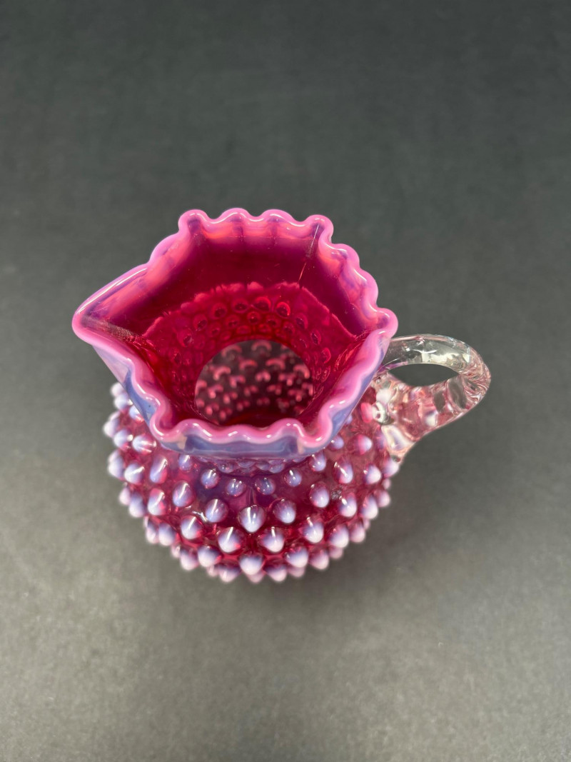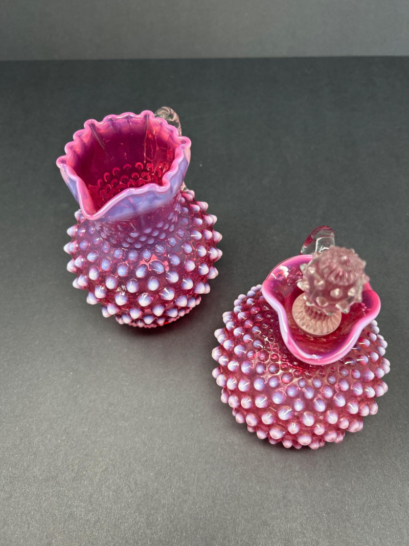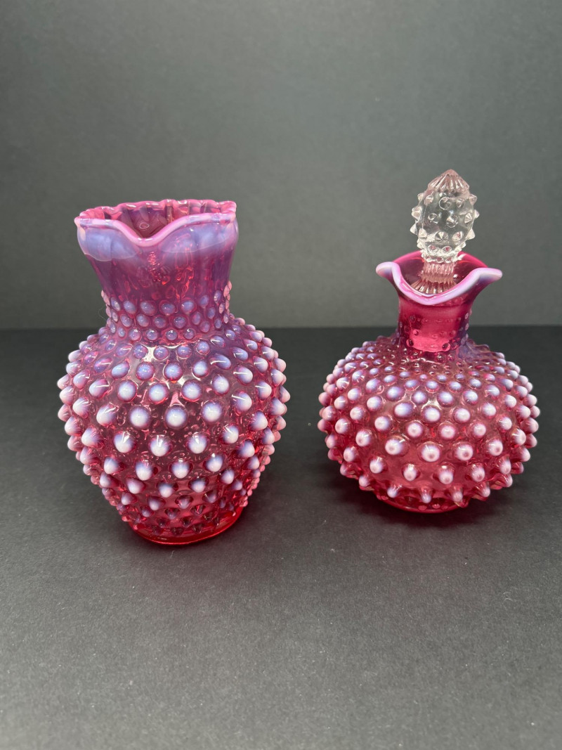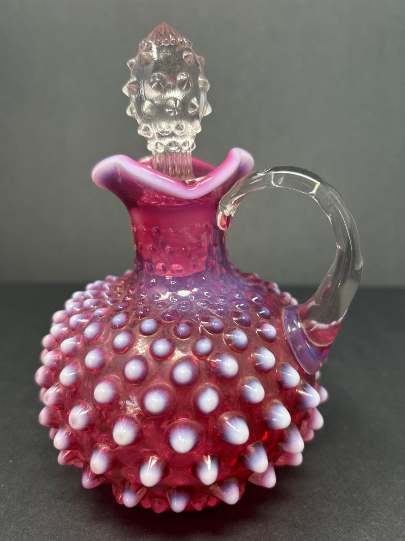 A radiant pairing of Fenton opalescent cranberry glass, crafted by encasing a layer of gold ruby within opalescent glass. The hobnail texture adds depth and sparkle, while the gradient coloration transitions from rich raspberry to soft blush. Cruet with original stopper and decorative finial, approx. 6.5" H Pitcher with flared rim and clear applied handle, approx. 6" H Origin: United States
