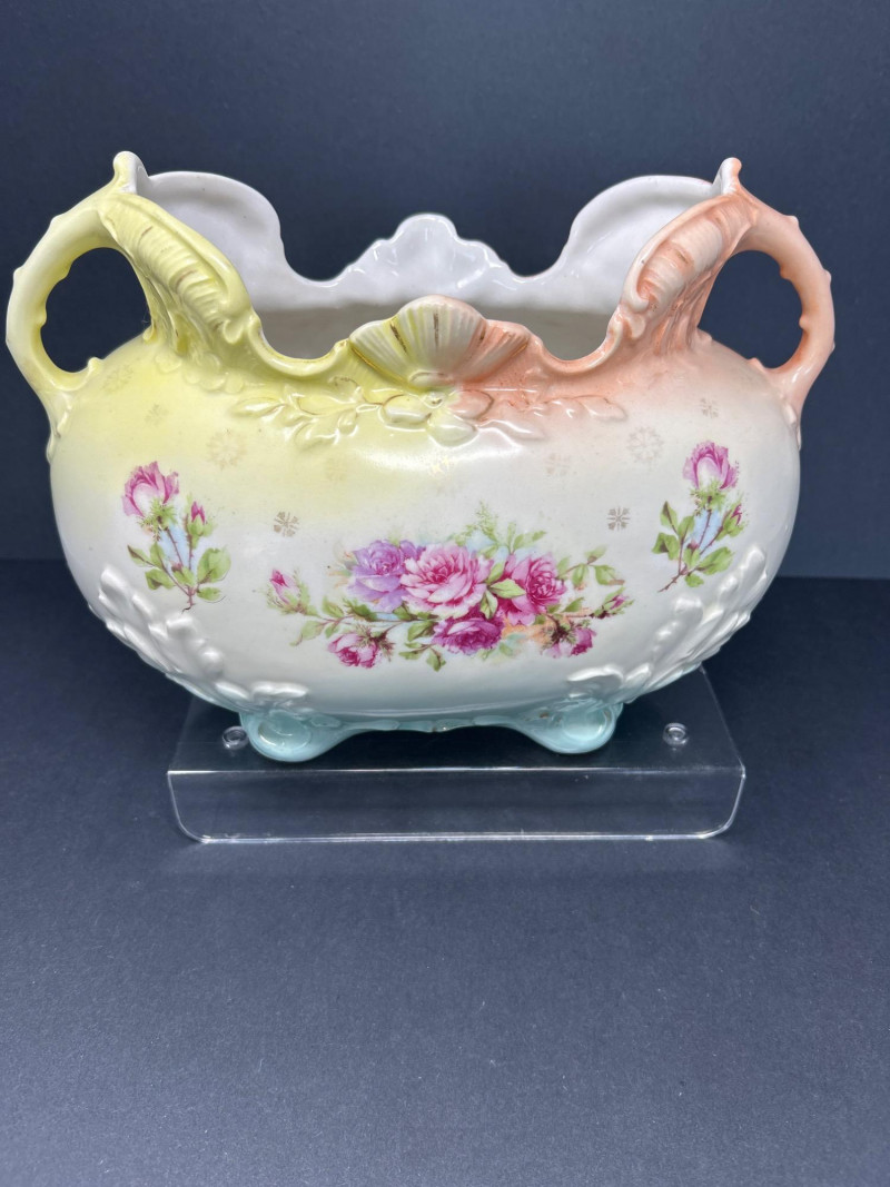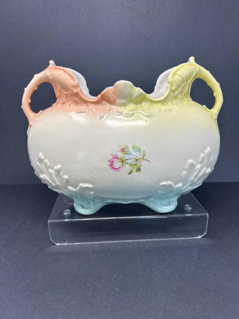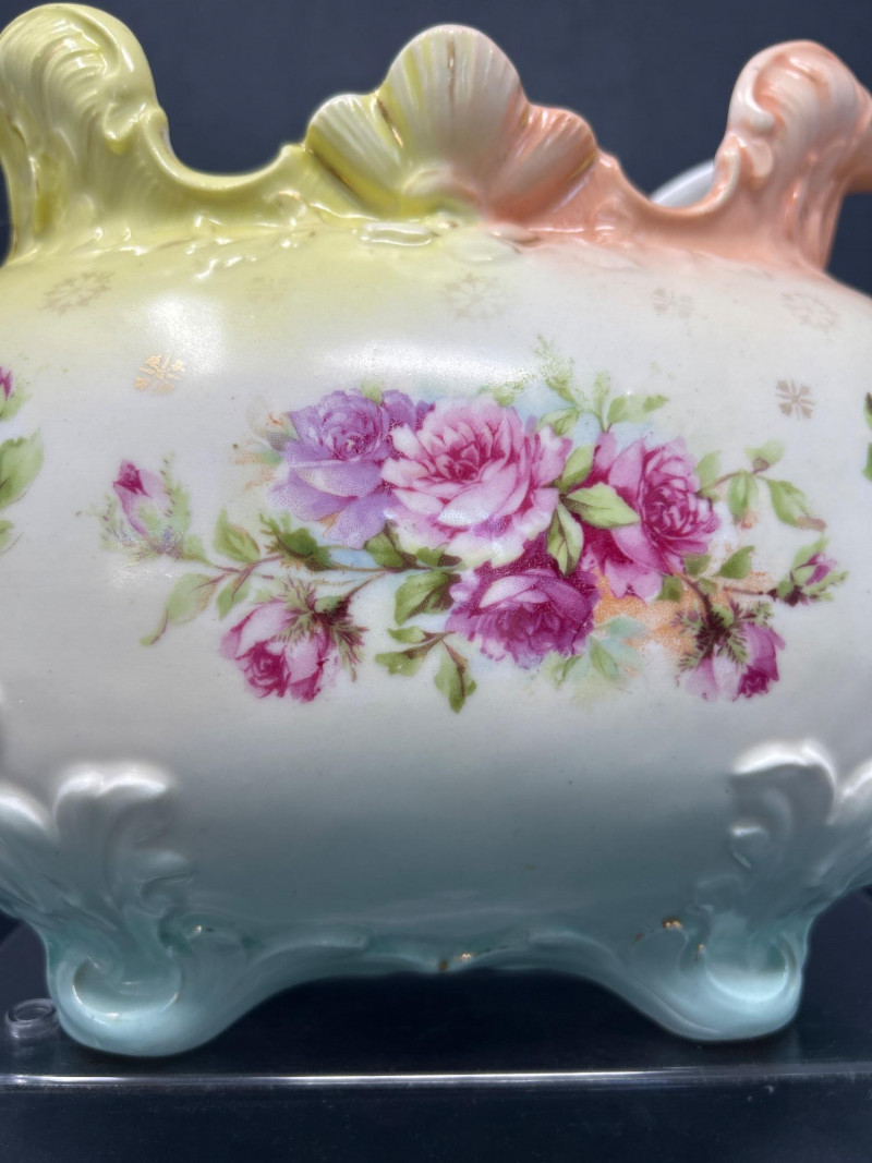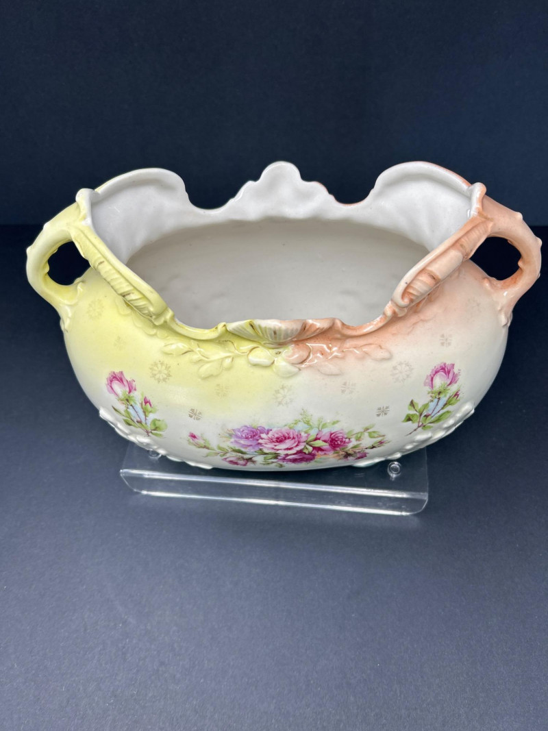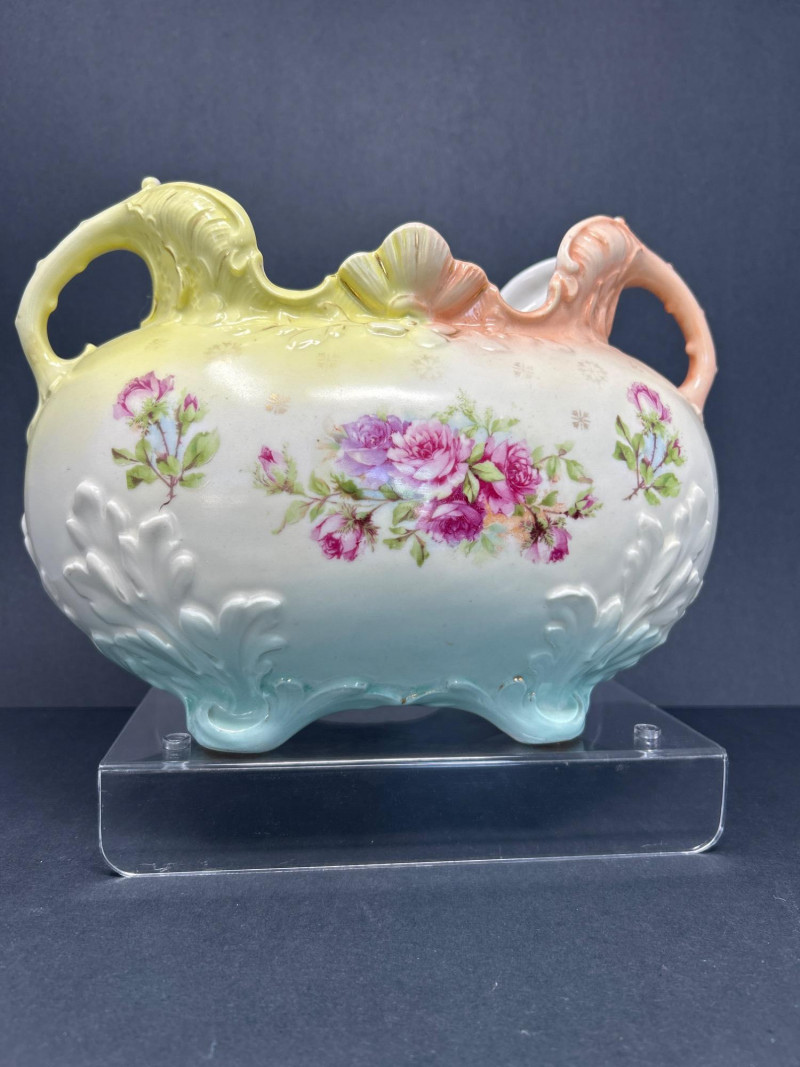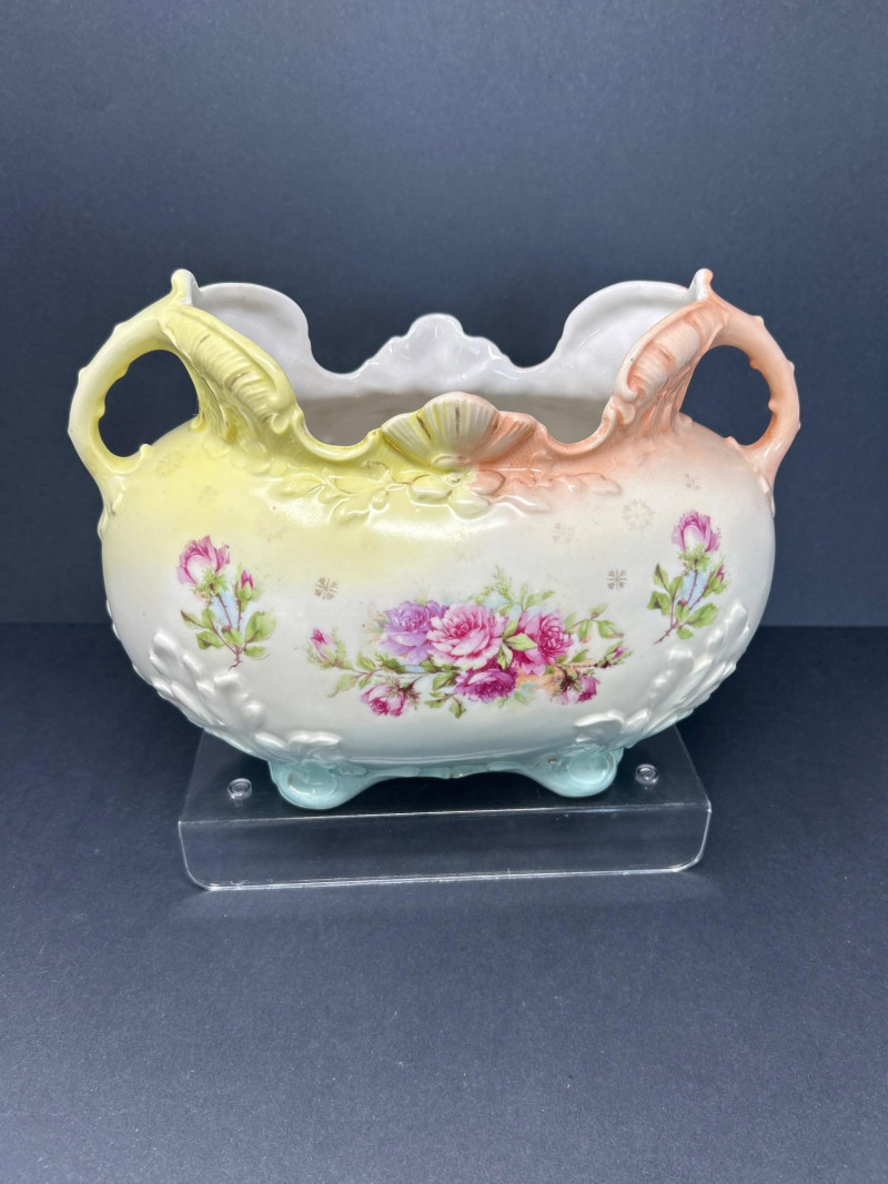 A vintage porcelain jardinière with romantic hand-painted florals and soft ombré glazing. The body transitions from lemon yellow to blush peach, fading into ivory and pale blue at the base. Raised floral reliefs and scalloped twin handles add Victorian charm, while the pink and lavender roses evoke a garden in bloom. Origin: Likely European, early 20th century