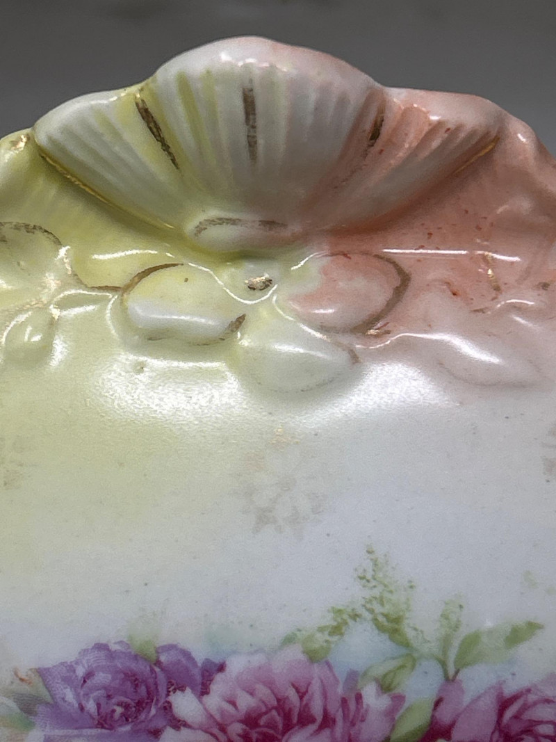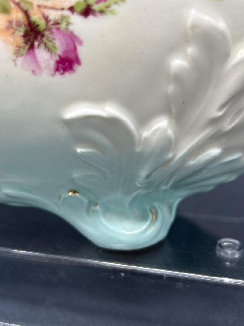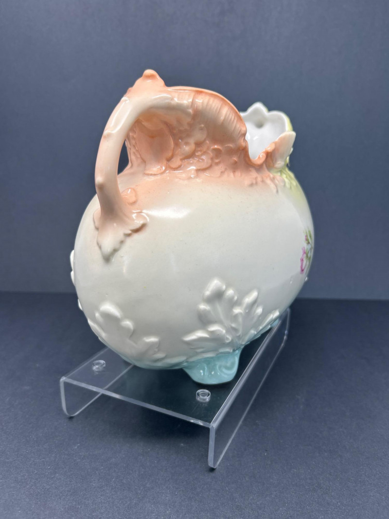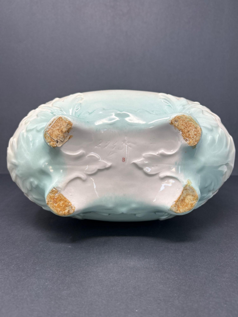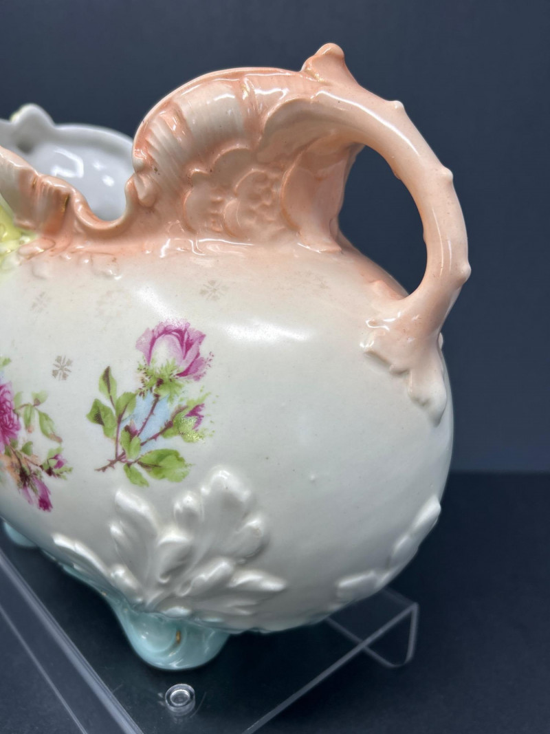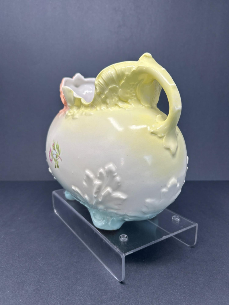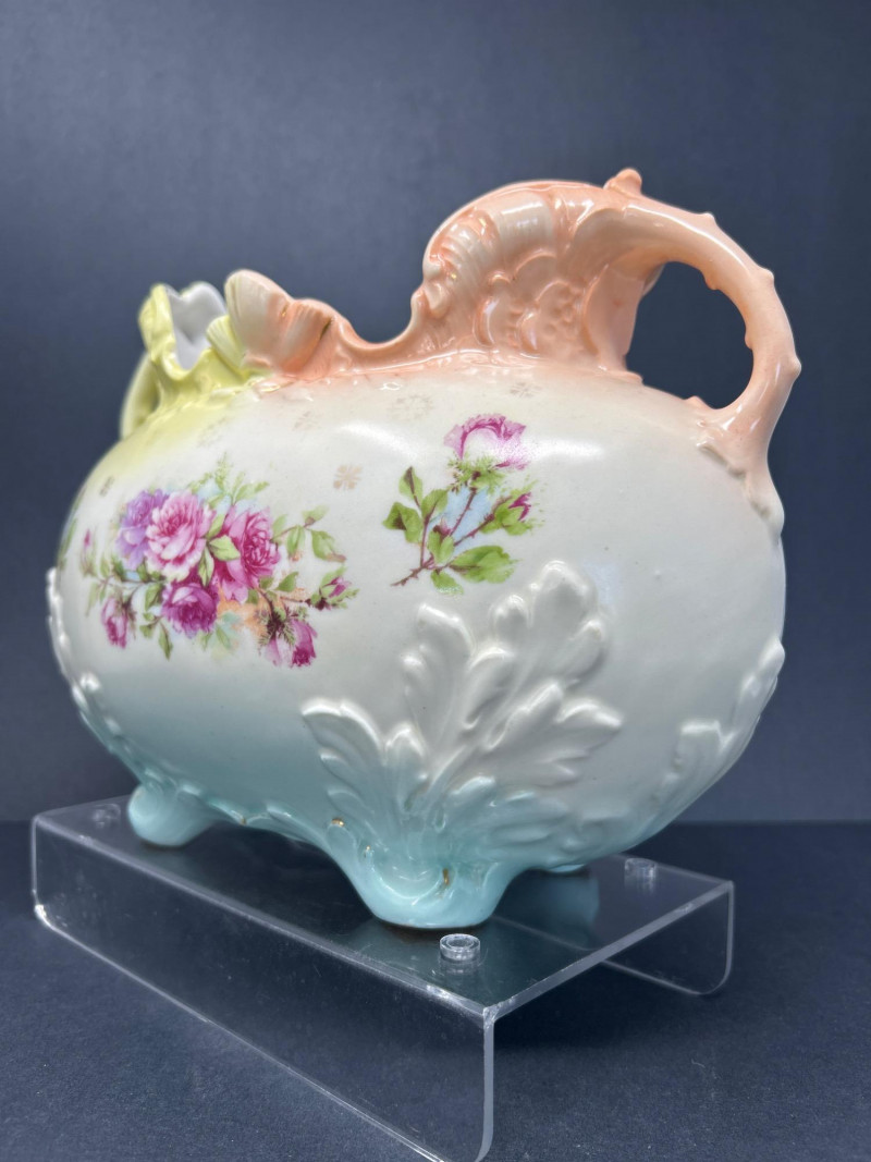 Design: Scalloped rim, twin handles, floral reliefs, and ombré glaze