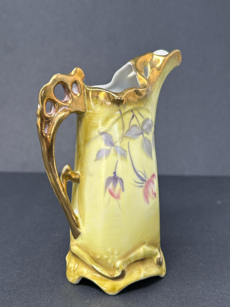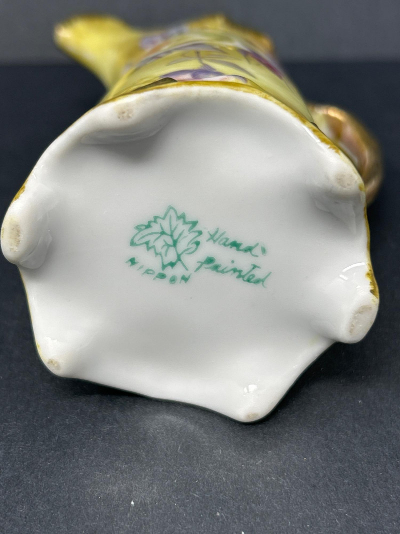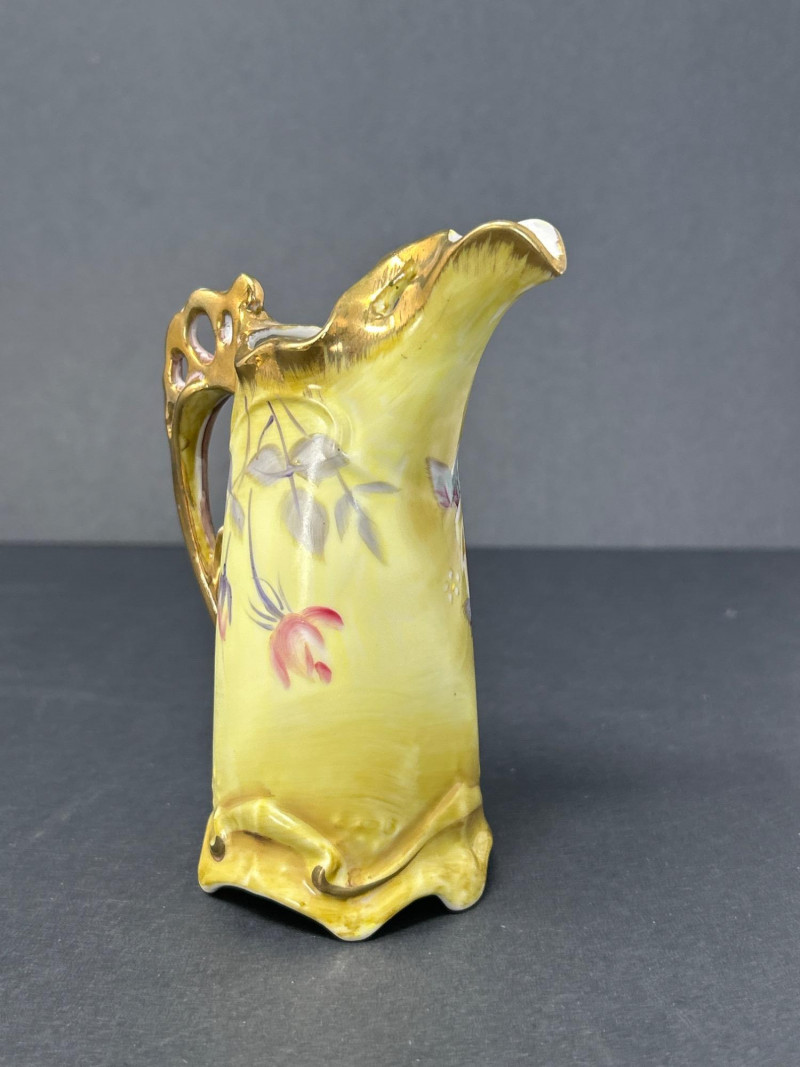 A graceful Nippon porcelain creamer, hand-painted with soft yellow and violet florals accented by delicate gold trim. This early 20th-century piece reflects the refined artistry associated with Japanese export ware marked “Nippon,” popular from the 1890s to the 1920s. Design: Delicate floral motif with gold embellishments; gently scalloped rim and footed base