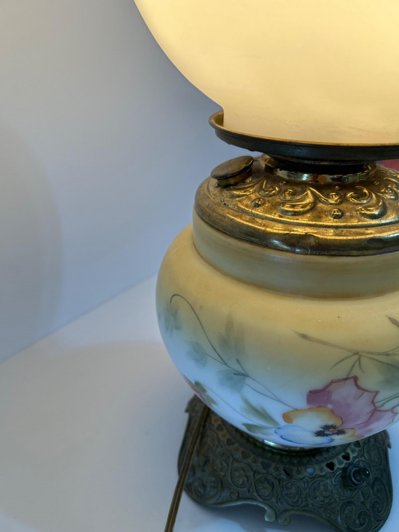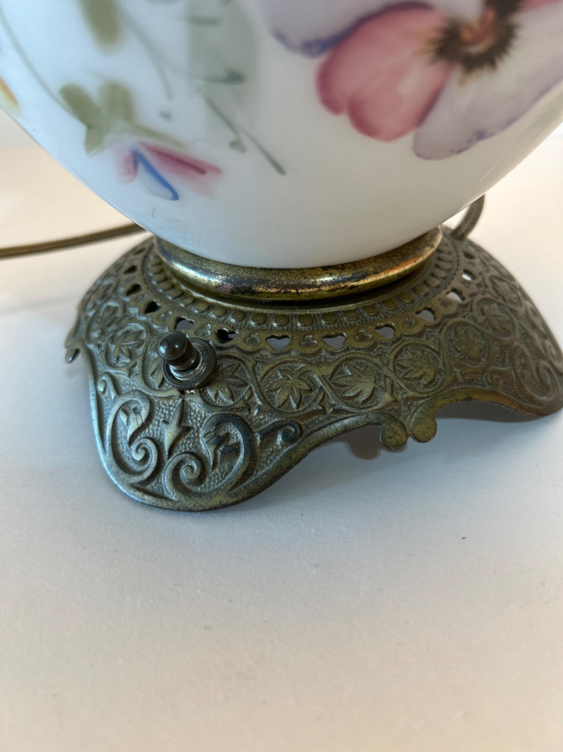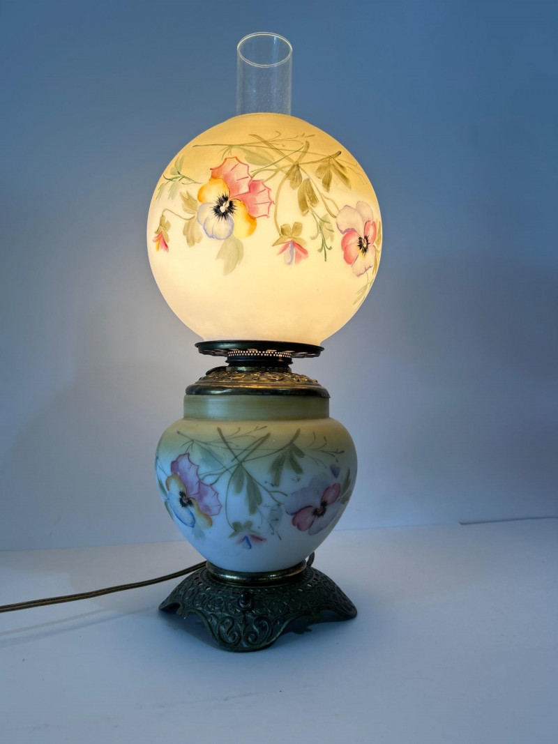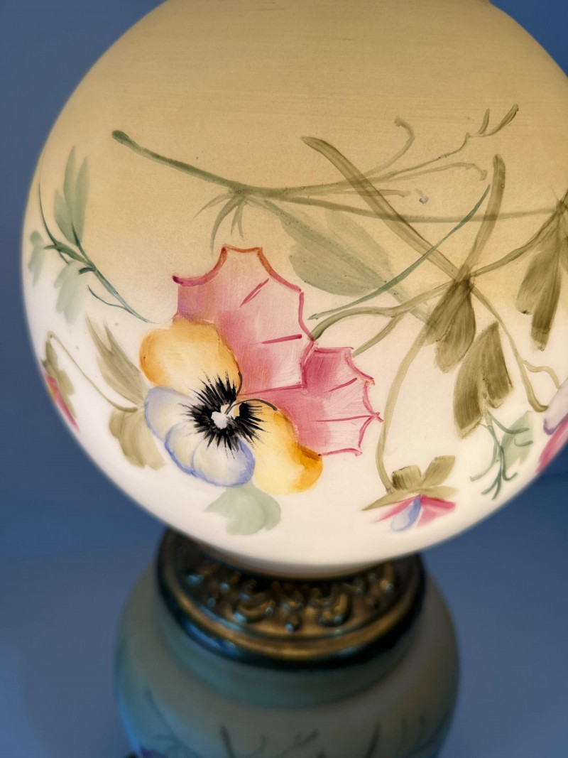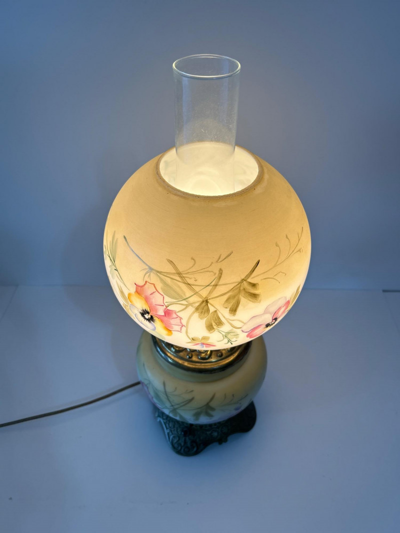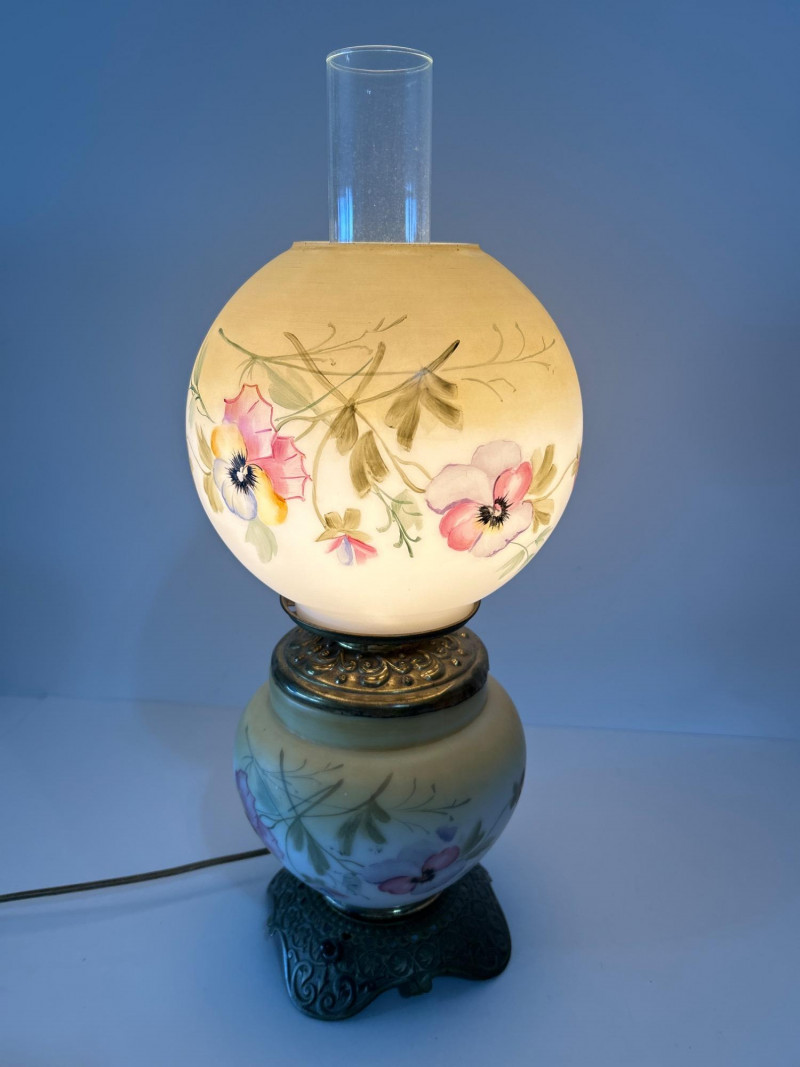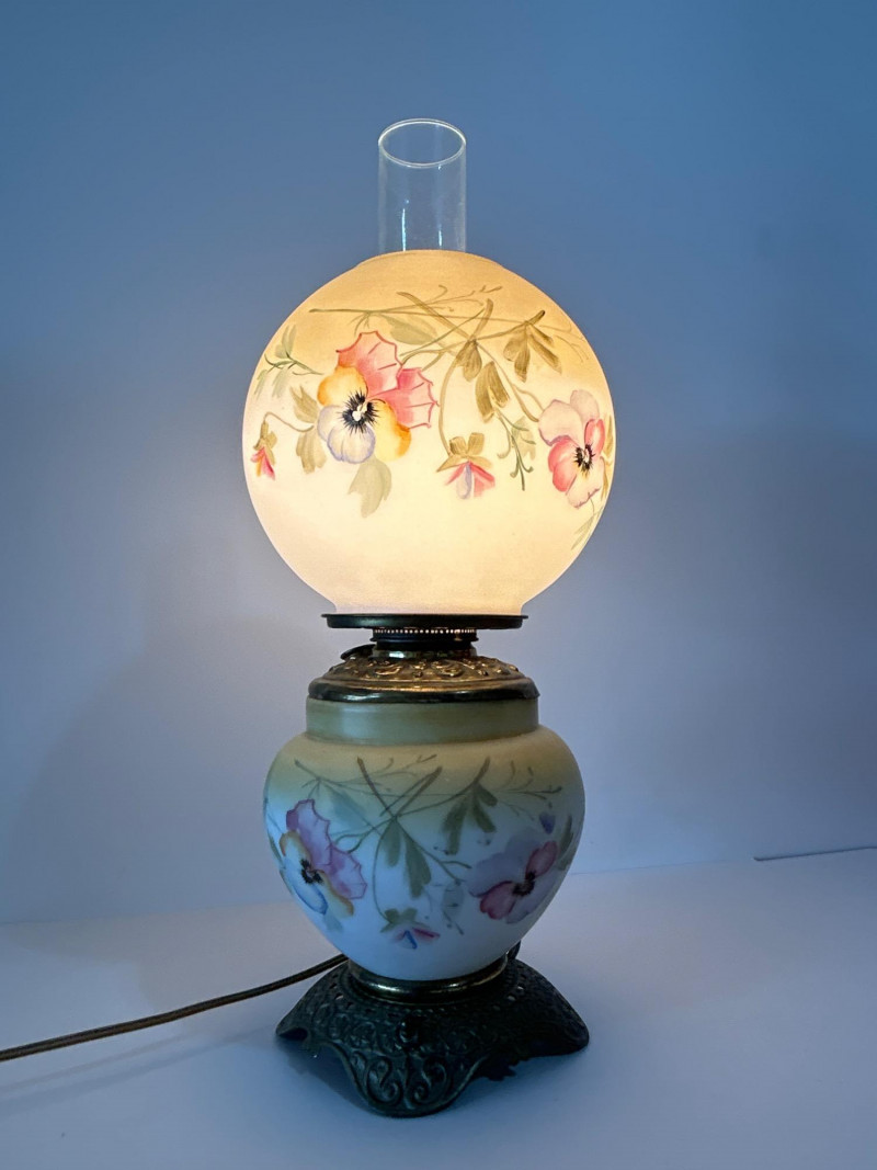 Hand-painted hurricane lamps like this one were popular in early 20th-century American homes for their soft glow and decorative charm. This example stands out for its delicate floral artistry and well-preserved condition, making it a lovely addition to vintage lighting collections or romantic interior décor