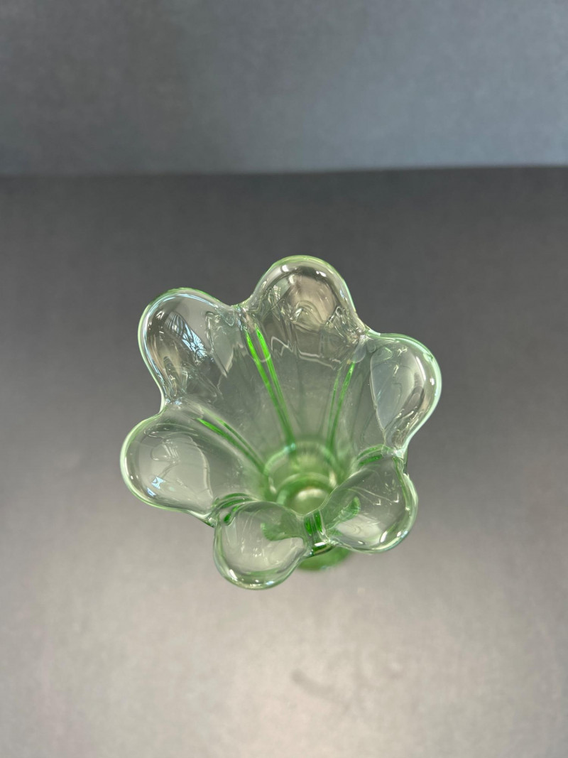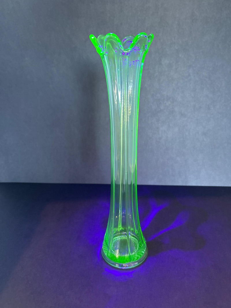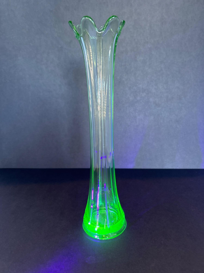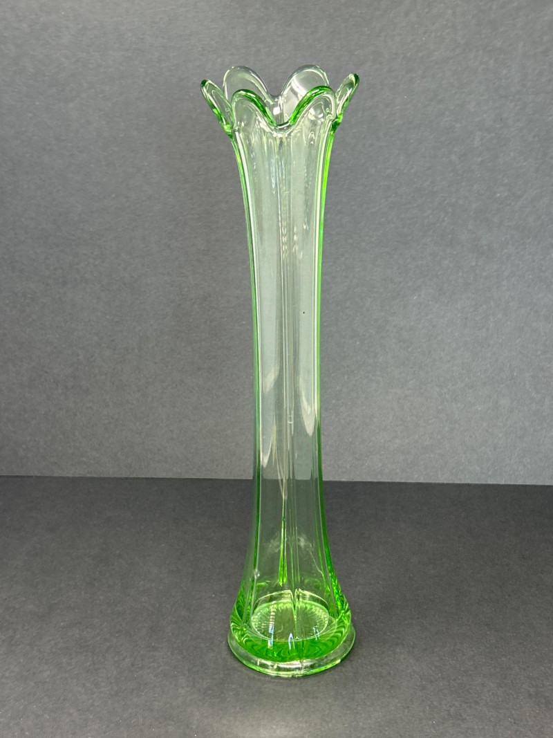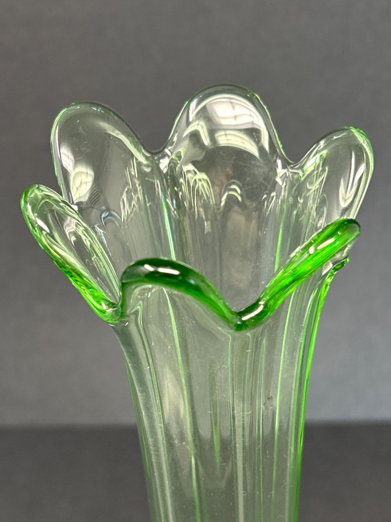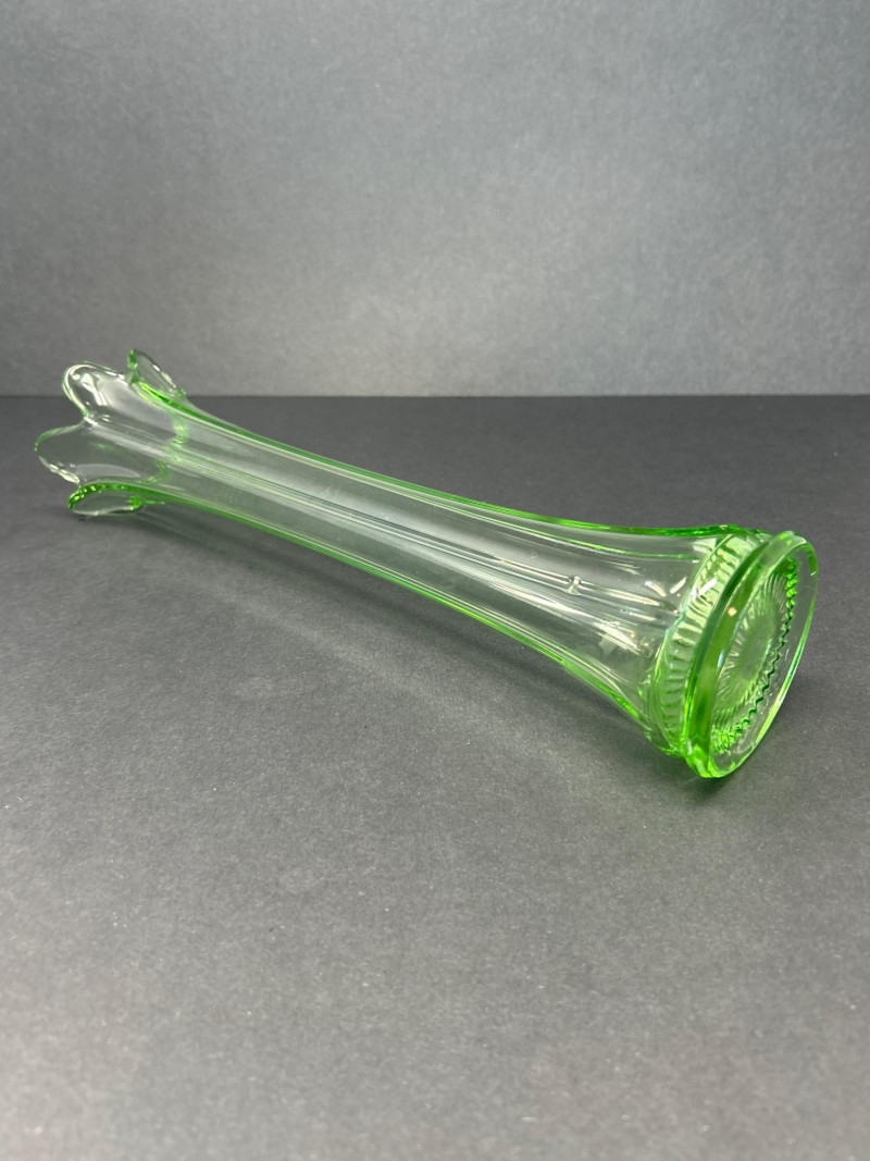 Collectibility: Uranium glass swung vases are highly collectible for their sculptural appeal and glowing properties. Comparable examples in this size and style typically sell for $45–$120 depending on maker and condition.