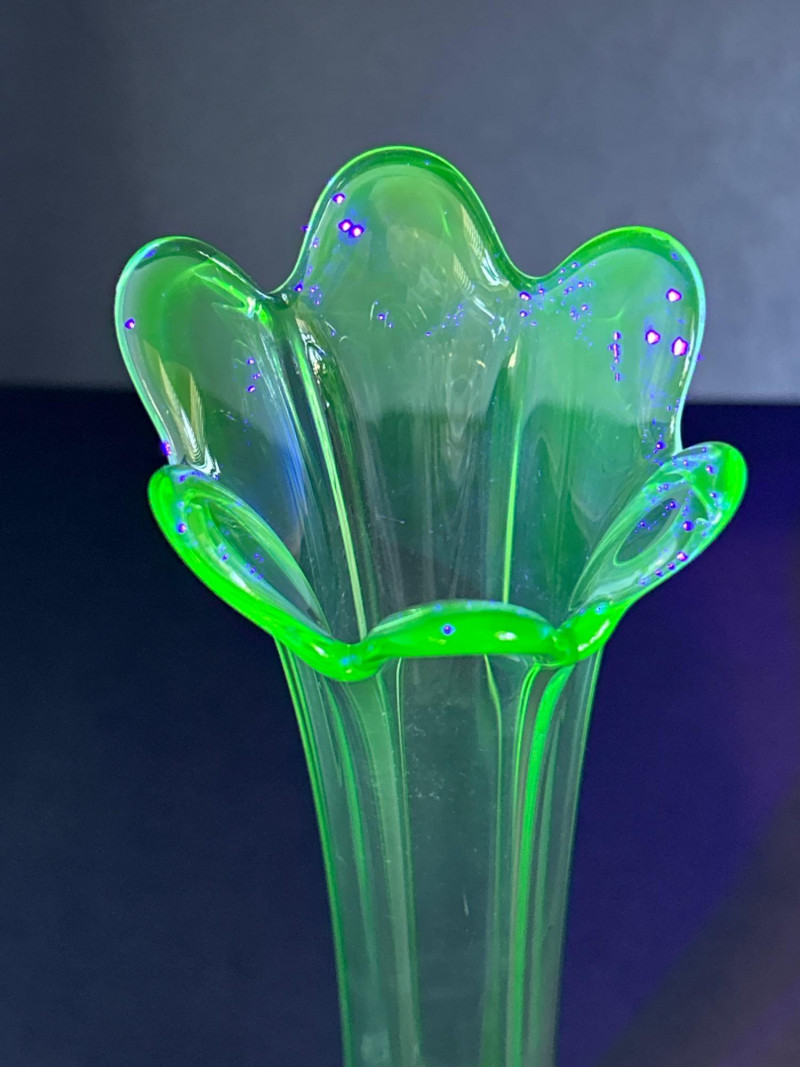 A striking six-finger uranium swung vase, showcasing the dramatic fluidity and luminous glow that define mid-century art glass. This piece likely dates to the 1950s–60s, when swung vases were popularized by makers like Fenton and Viking. Design: Elongated form with six distinct “fingers” at the rim; vibrant green glass with uranium content that fluoresces under UV light