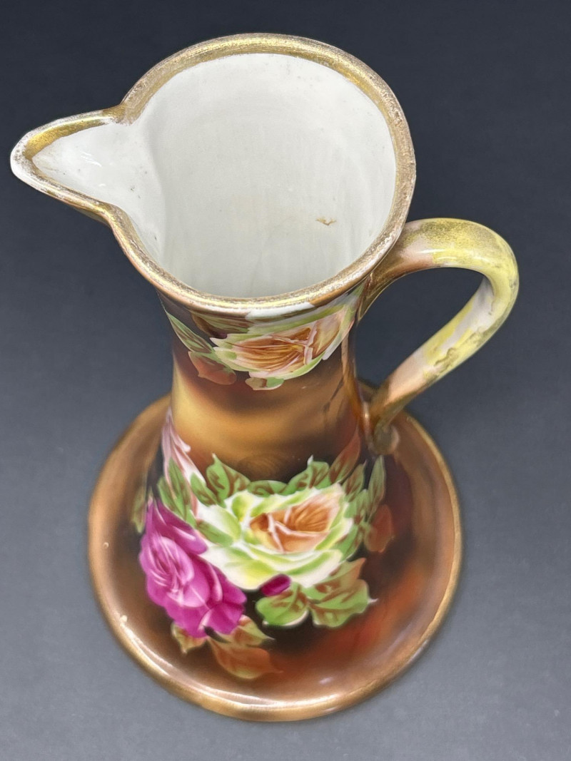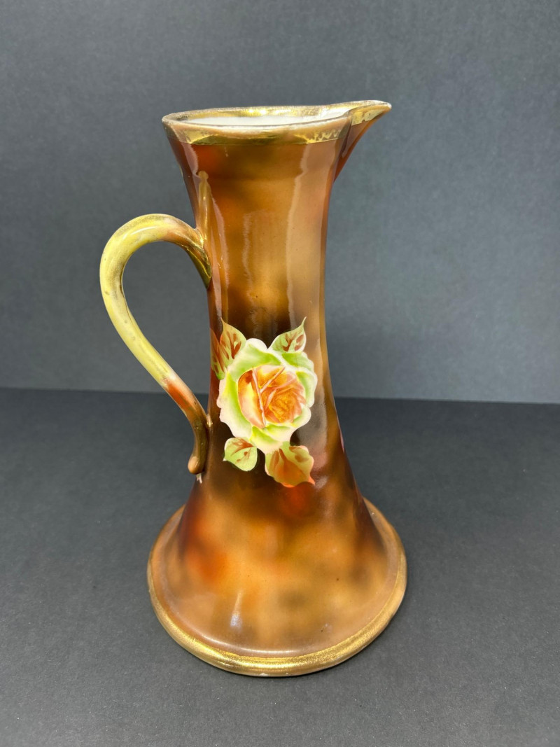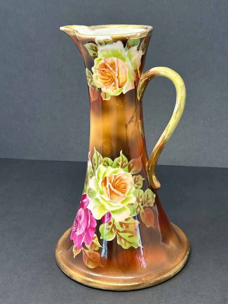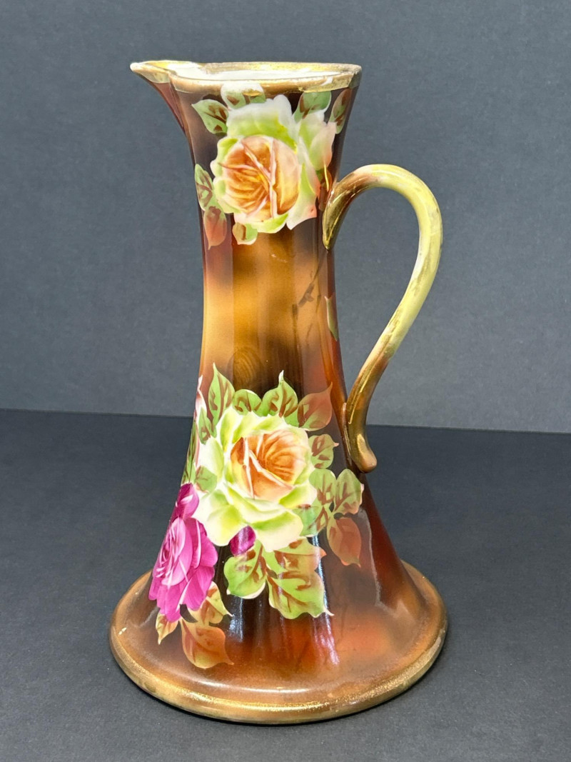 Nippon porcelain remains highly collectible for its craftsmanship and romantic aesthetic. Pitchers with bold florals and intact gilding typically range from $40–$150 depending on maker and condition.