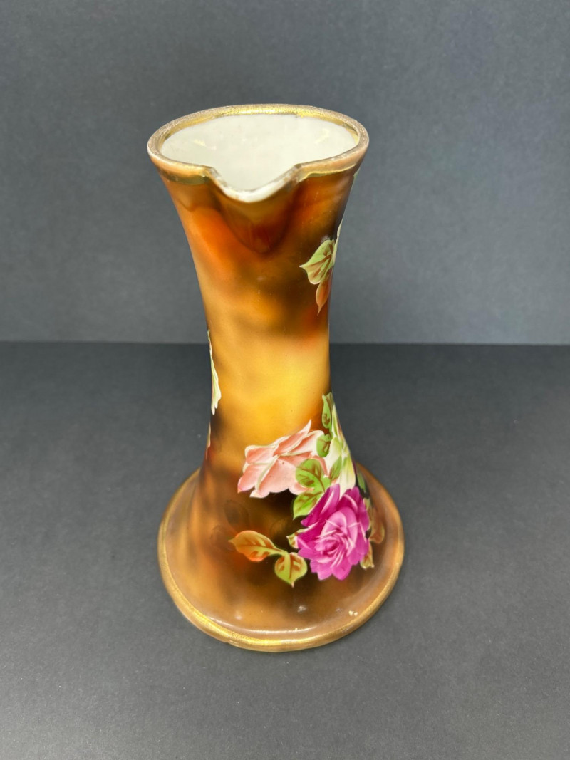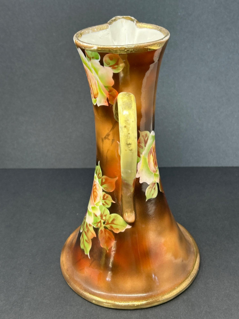 A hand-painted Nippon porcelain pitcher, adorned with vibrant roses cascading across a warm brown and golden-yellow background. The floral motif is rendered with delicate brushwork, typical of early 20th-century Japanese export ware. Design: