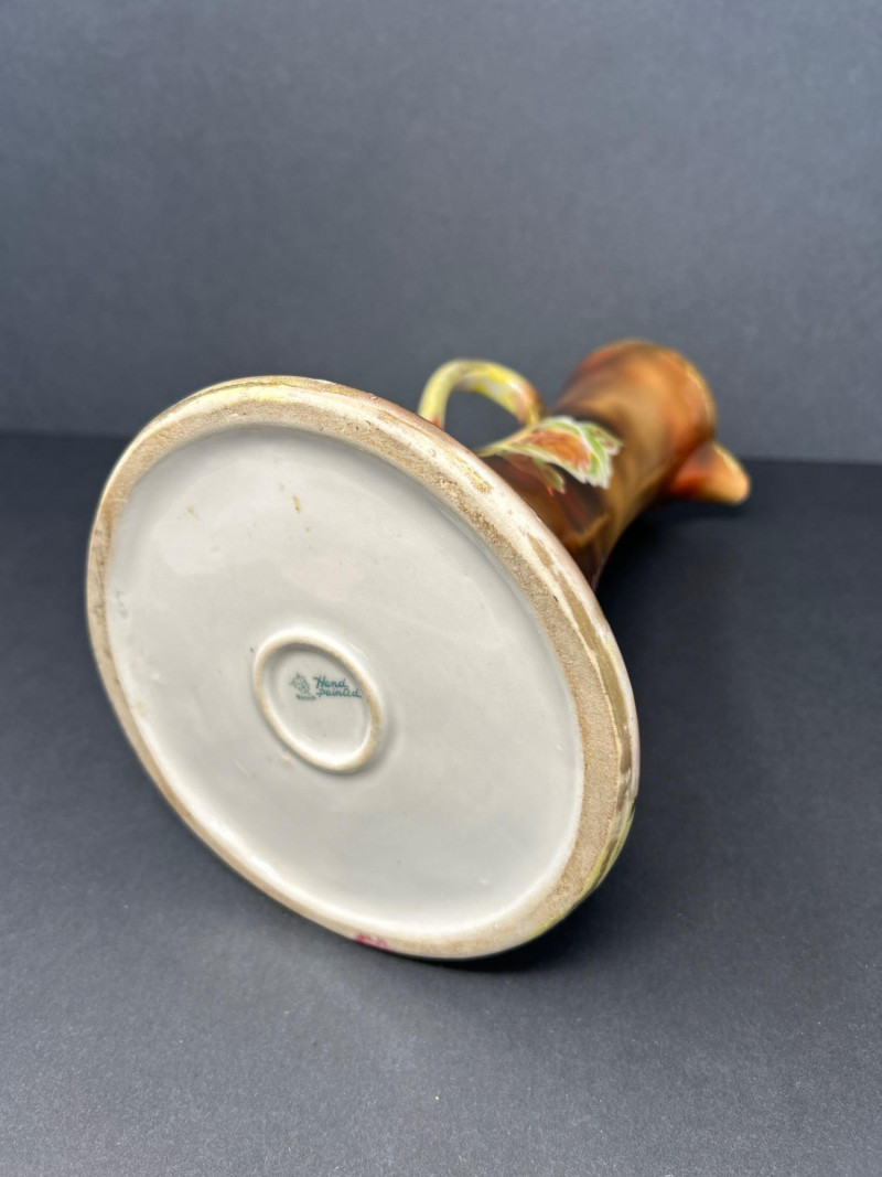 Graceful bulbous form with a flared spout and ornate handle; richly colored roses in pink, red, and coral tones over a mottled earth-toned ground. Materials: