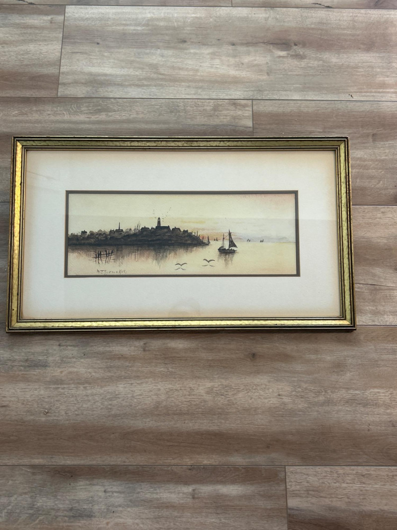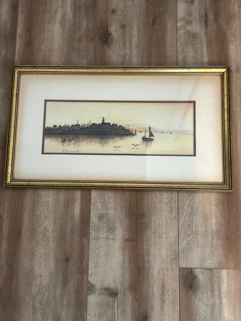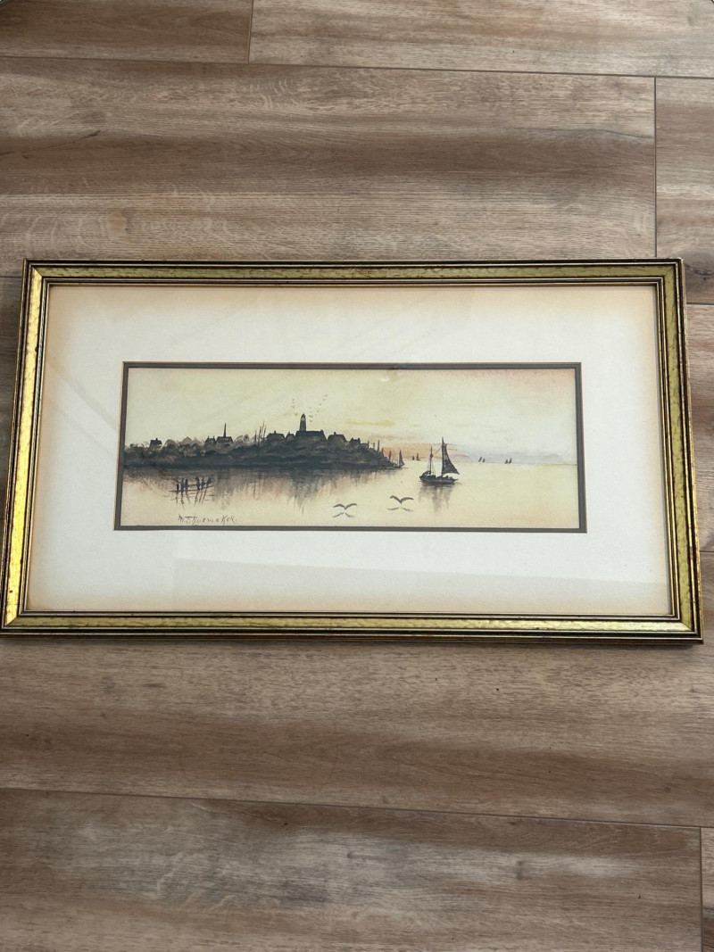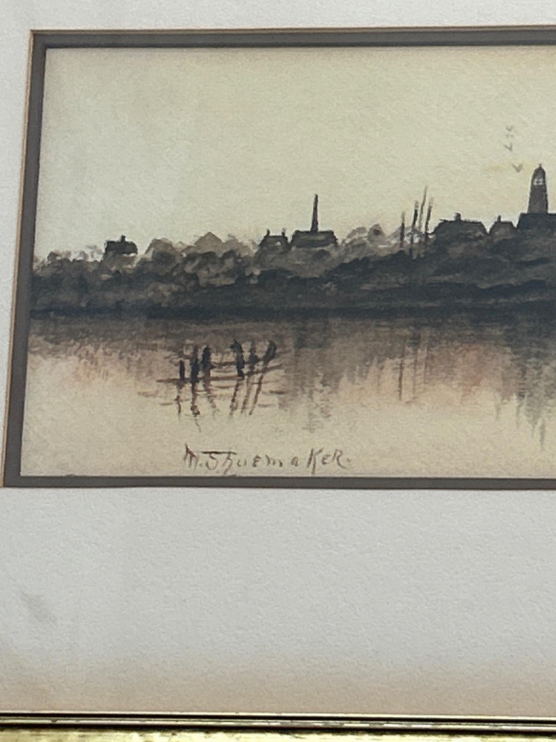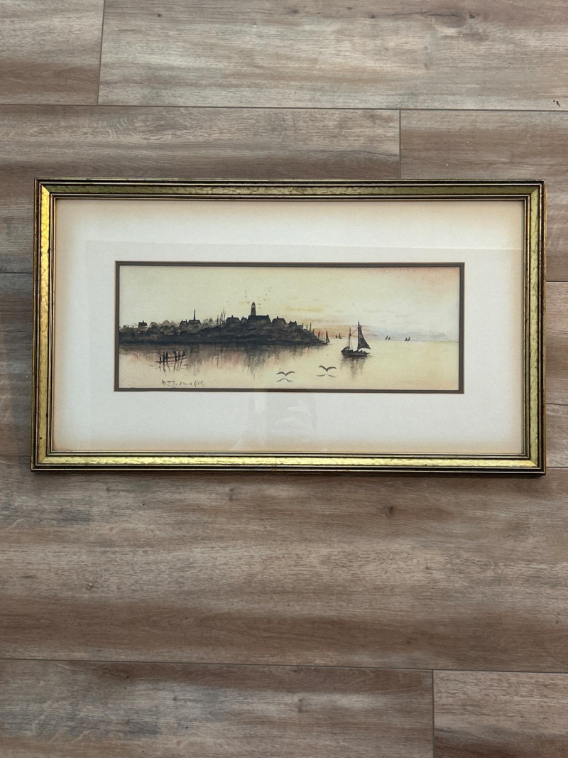 Description:A tranquil maritime scene rendered in soft watercolor washes, this signed piece by M. Shuemakercaptures the quiet poetry of a harbor at dawn or dusk: Imagery:A lone sailboat glides across still waters, flanked by birds in mid-flight and a distant shoreline dotted with buildings and a lighthouse Palette:Muted tones of sepia, slate, and pale gold evoke a sense of calm and nostalgia Presentation:Elegantly framed in a gold-tone molding with a wide cream mat; frame measures approx. 13.5" x 23.5" Signature:Lower left, artist-signed “M. Shuemaker” Medium:Watercolor on paper Era:Likely mid-20th century