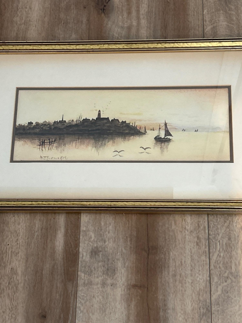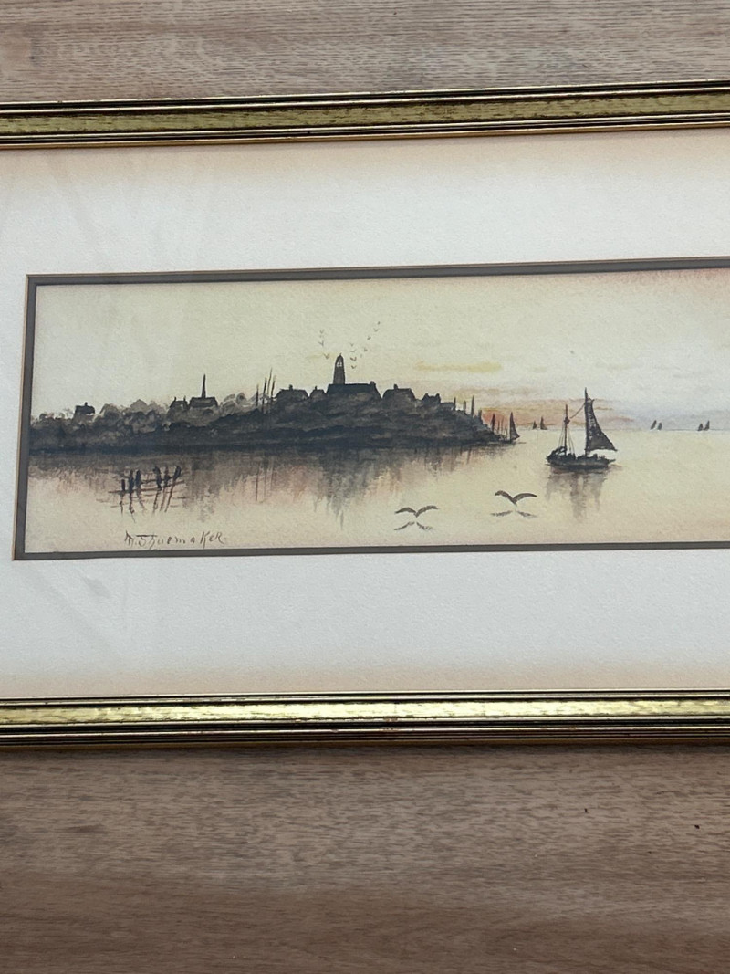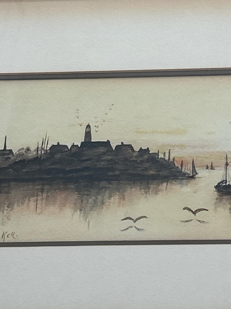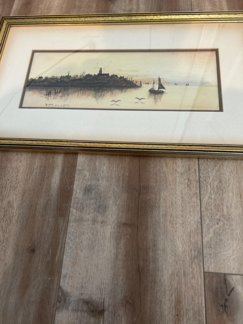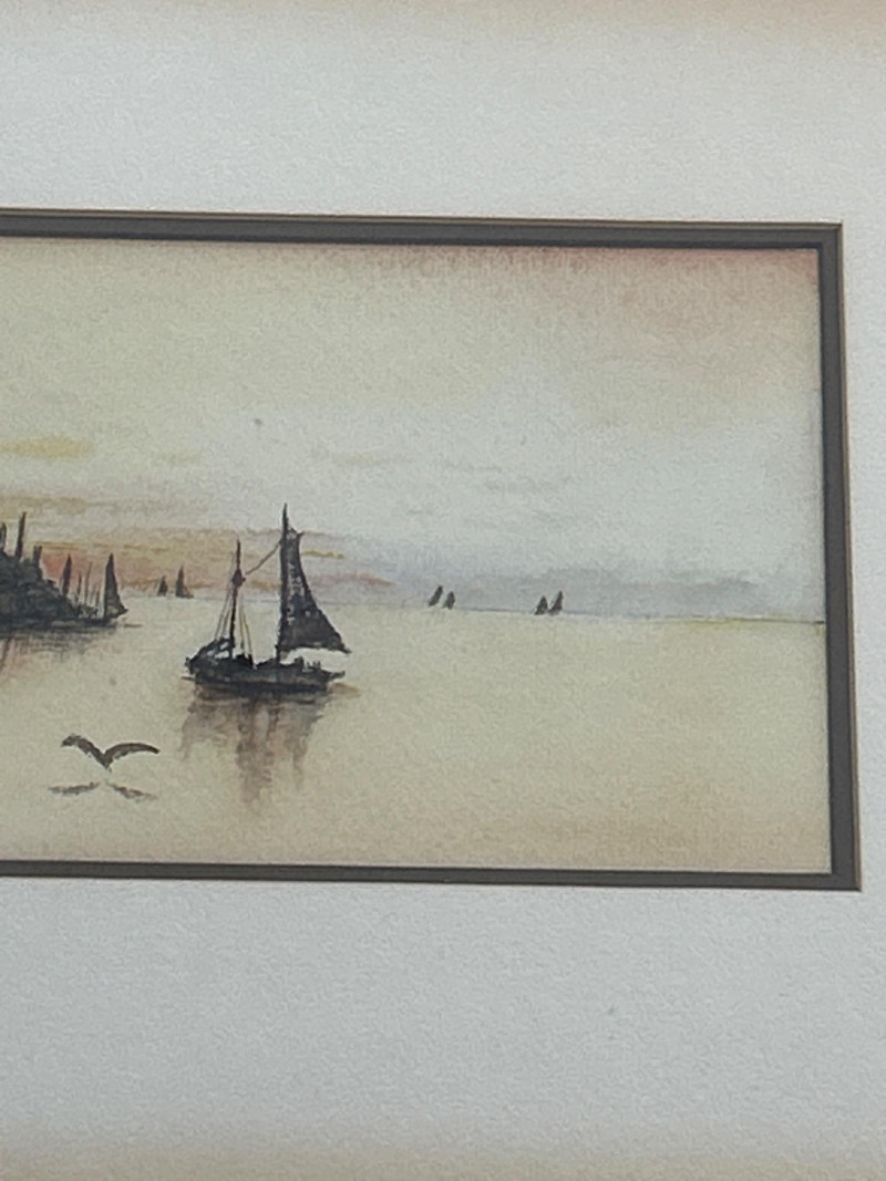 Description:A tranquil maritime scene rendered in soft watercolor washes, this signed piece by M. Shuemakercaptures the quiet poetry of a harbor at dawn or dusk: Imagery:A lone sailboat glides across still waters, flanked by birds in mid-flight and a distant shoreline dotted with buildings and a lighthouse Palette:Muted tones of sepia, slate, and pale gold evoke a sense of calm and nostalgia Presentation:Elegantly framed in a gold-tone molding with a wide cream mat; frame measures approx. 13.5" x 23.5" Signature:Lower left, artist-signed “M. Shuemaker” Medium:Watercolor on paper Era:Likely mid-20th century