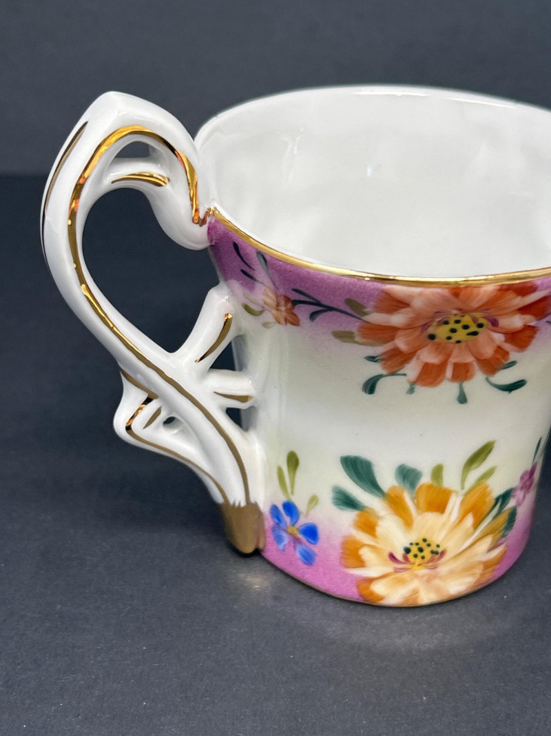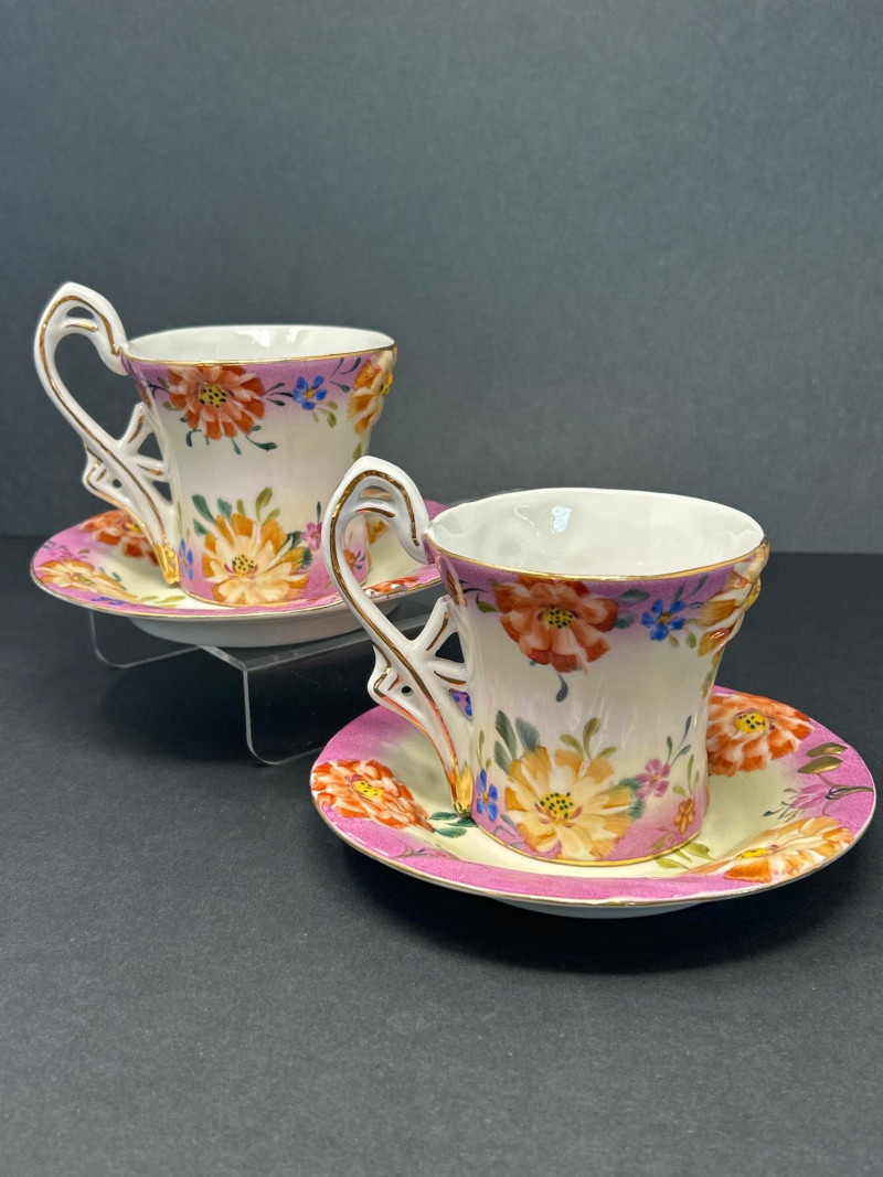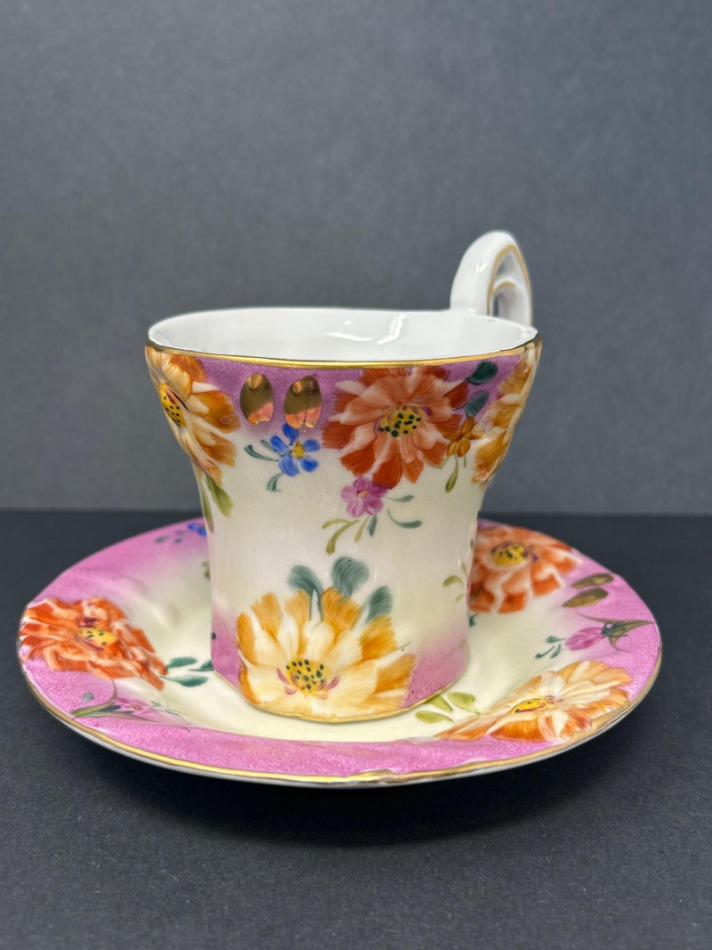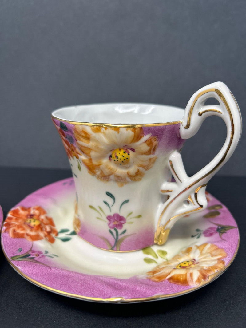 A radiant pairing of French porcelain artistry, these Limoges teacups and saucers celebrate the charm of dimensional florals and gilded detail: Teacups –Each cup blossoms with orange, yellow, and violet blooms against a pink ground, framed by sculptural white handles traced in gold. The flared silhouette and raised floral motif evoke the elegance of early 20th-century tableware. Saucers –Matching saucers echo the vibrant palette and painterly florals, creating a cohesive and cheerful set. A delightful addition for collectors of Limoges or lovers of romantic porcelain. Cup Height: Approximately 3.25" Saucer Diameter: Approximately 5.5"