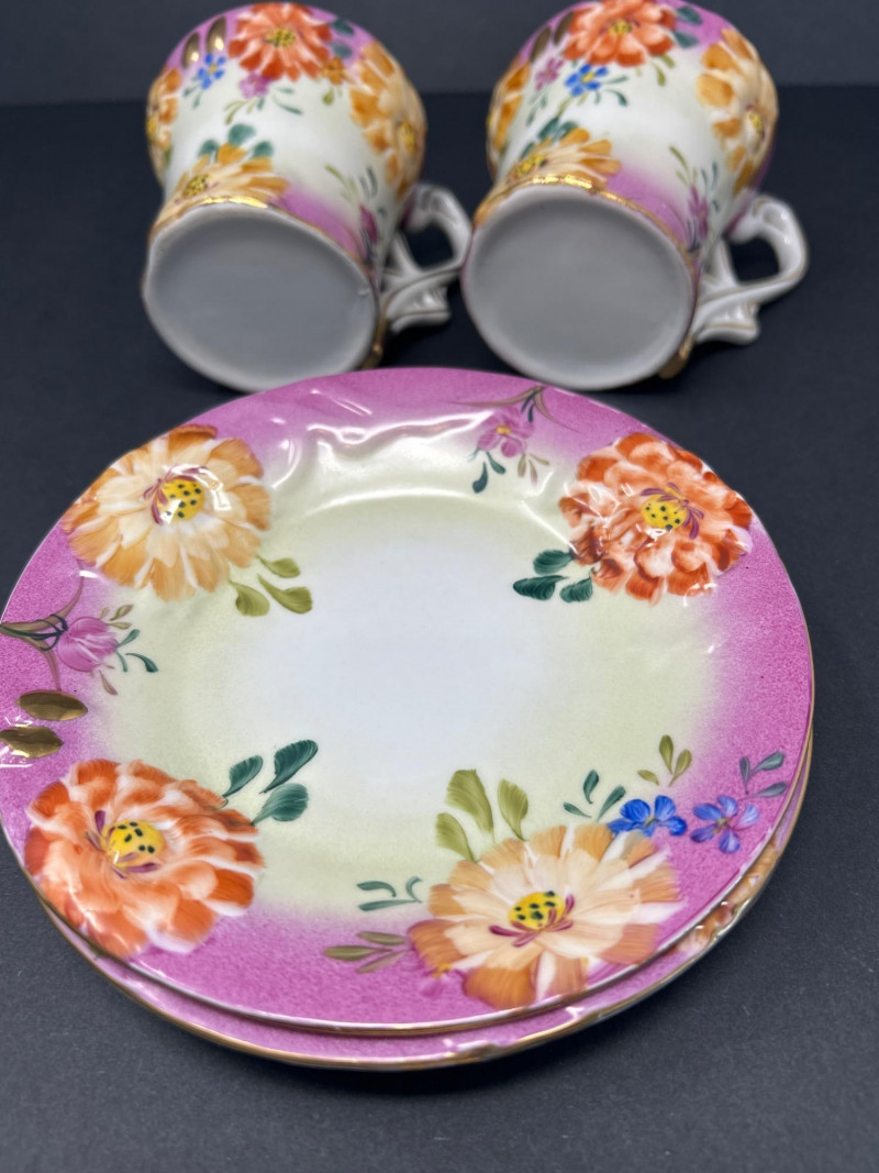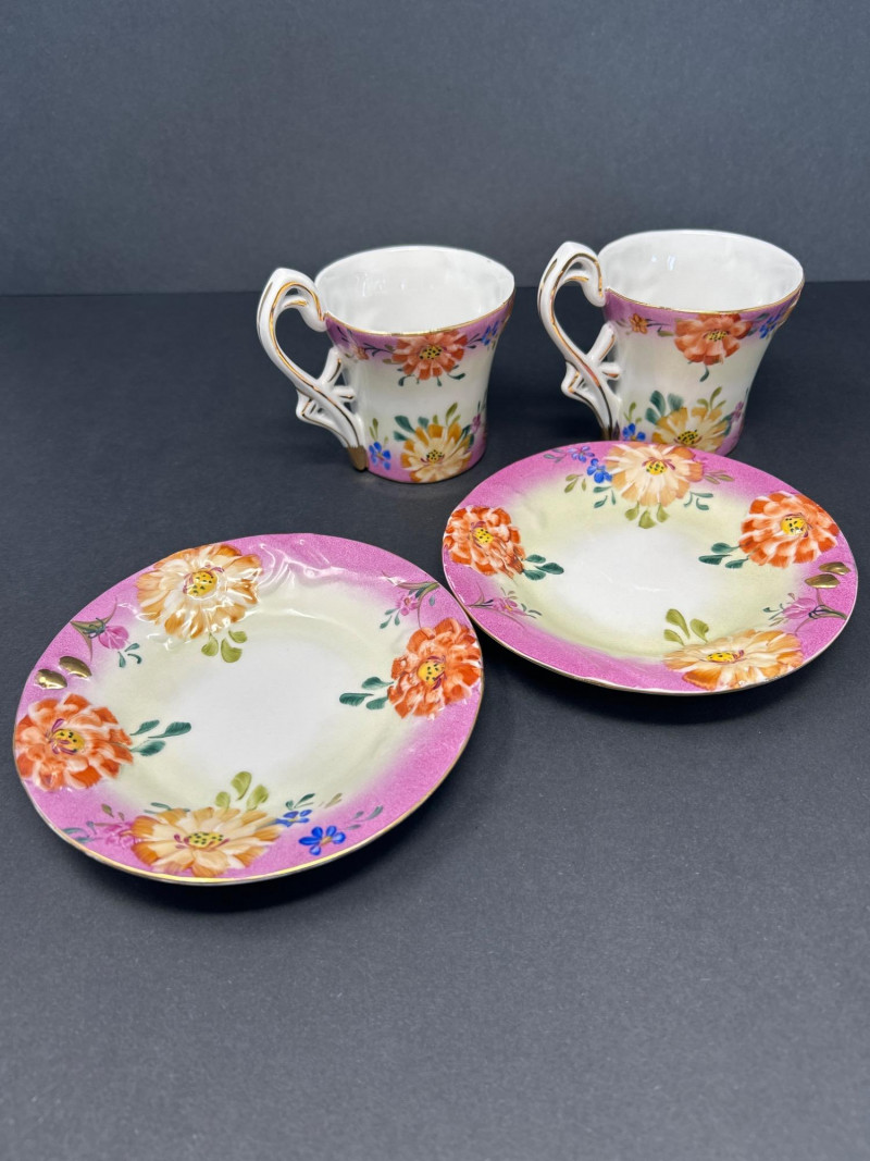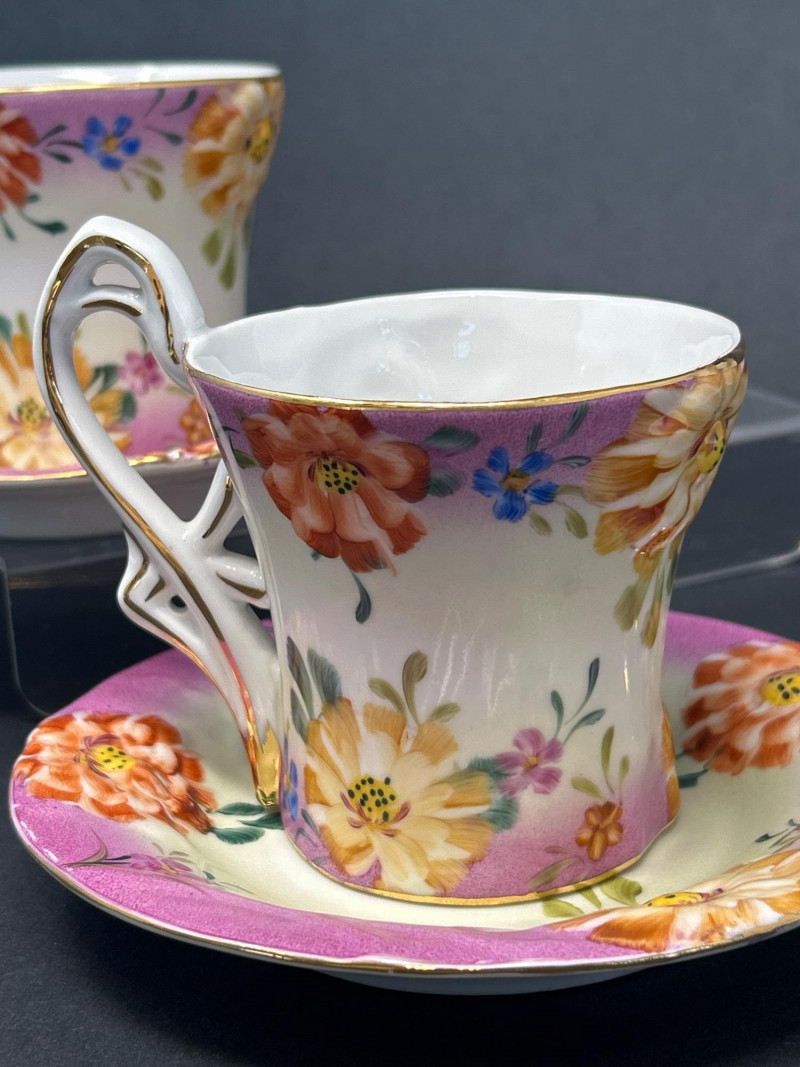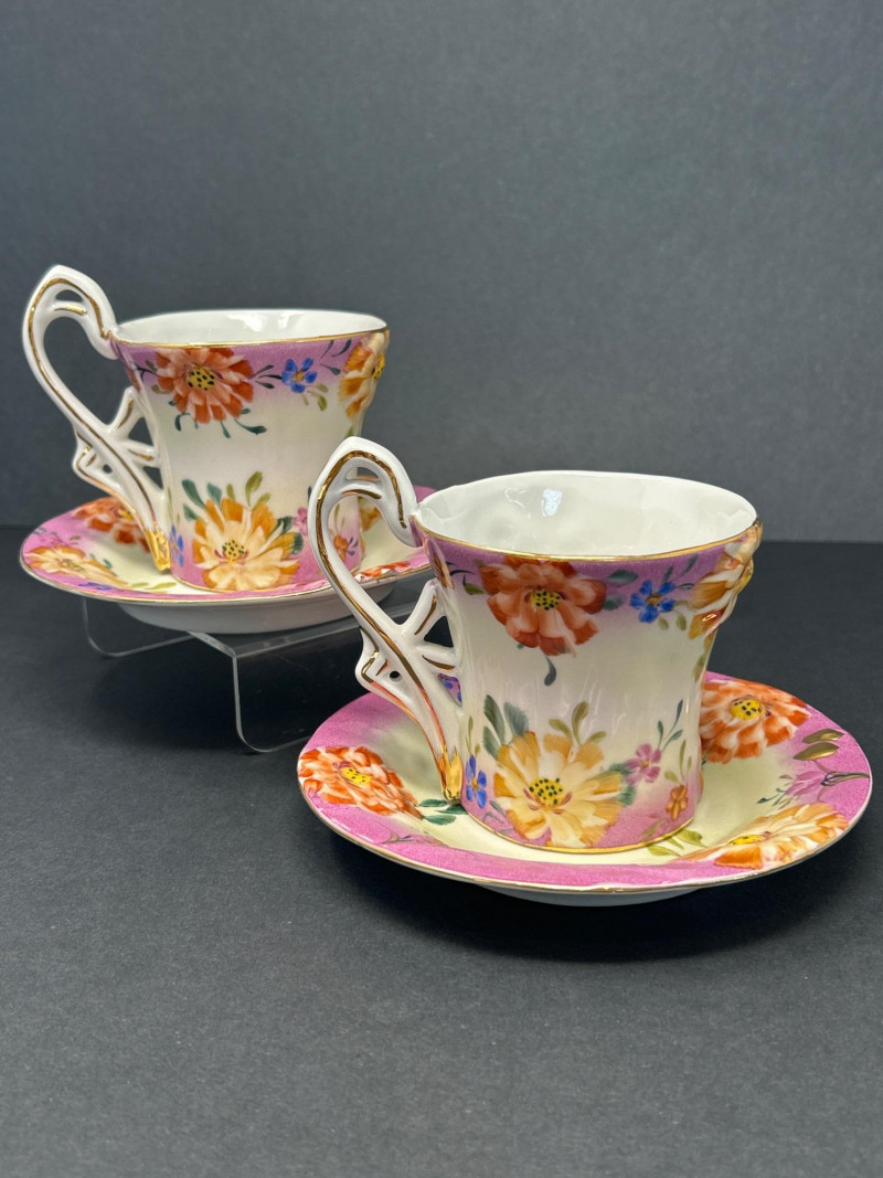 A radiant pairing of French porcelain artistry, these Limoges teacups and saucers celebrate the charm of dimensional florals and gilded detail: Teacups –Each cup blossoms with orange, yellow, and violet blooms against a pink ground, framed by sculptural white handles traced in gold. The flared silhouette and raised floral motif evoke the elegance of early 20th-century tableware. Saucers –Matching saucers echo the vibrant palette and painterly florals, creating a cohesive and cheerful set. A delightful addition for collectors of Limoges or lovers of romantic porcelain. Cup Height: Approximately 3.25" Saucer Diameter: Approximately 5.5"