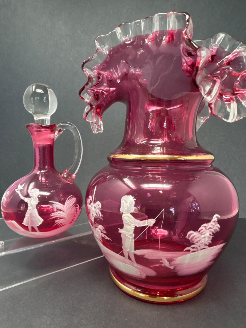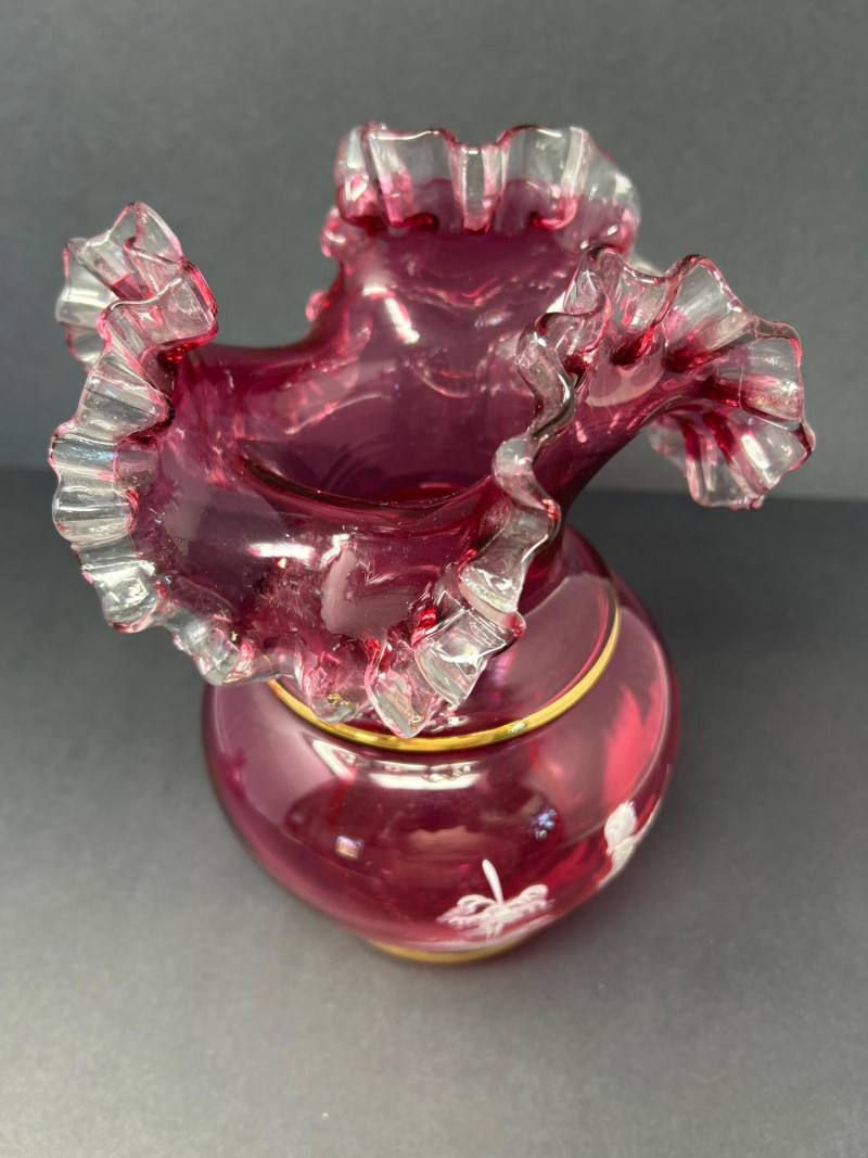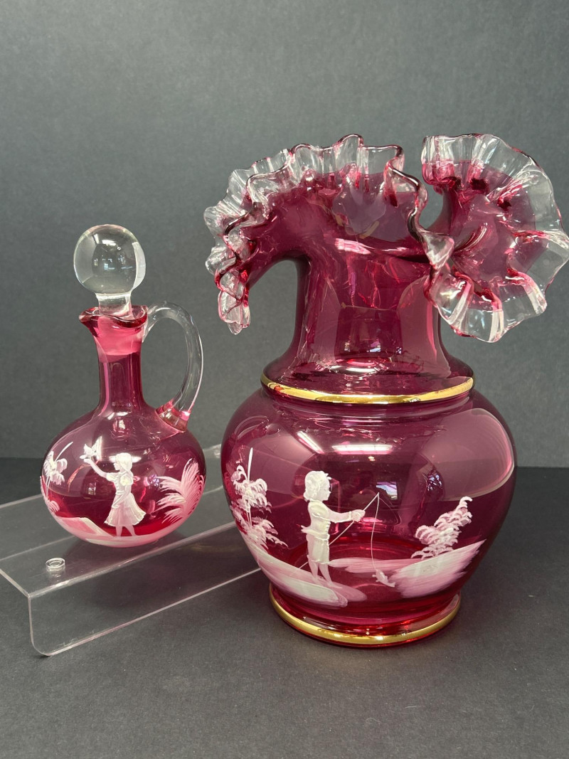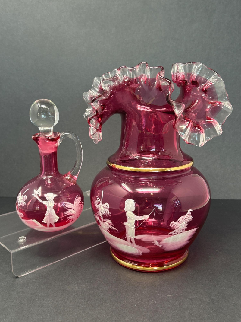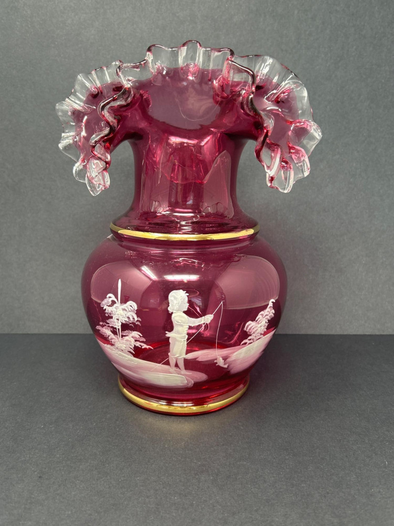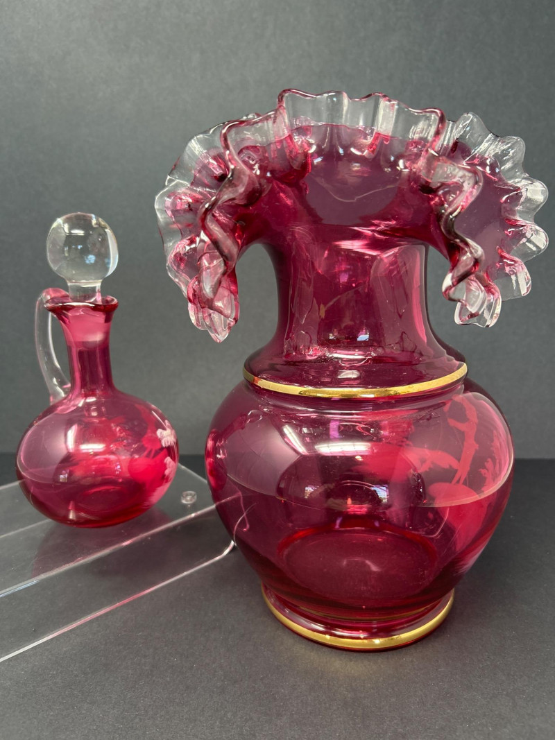 Fenton Cranberry Mary Gregory SetA charming duet of Victorian-inspired glassware, this Fenton set showcases the artistry of Mary Gregory enamel work in rich cranberry tones: Cruet –A petite pitcher with a clear glass stopper, featuring a hand-painted child releasing a bird amid delicate foliage. The spherical body and ornate handle evoke turn-of-the-century whimsy. Plese note-Cruet has a hairline crack on the inside of the base of the piece. Vase –A larger companion piece with a wide, ruffled rim and gold accents. The enamel scene depicts a child fishing, framed by lush white brushwork and graceful curves Cruet with Stopper: Height (including stopper): ~6.5" Width (at widest point): ~3.5" Ruffled Vase: Height: ~10" Diameter (at widest point): ~6.5" Rim Diameter: ~4.25"