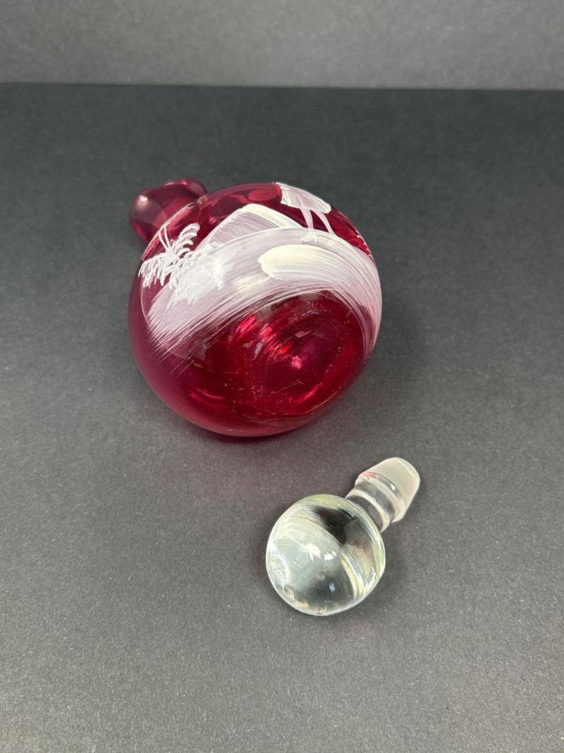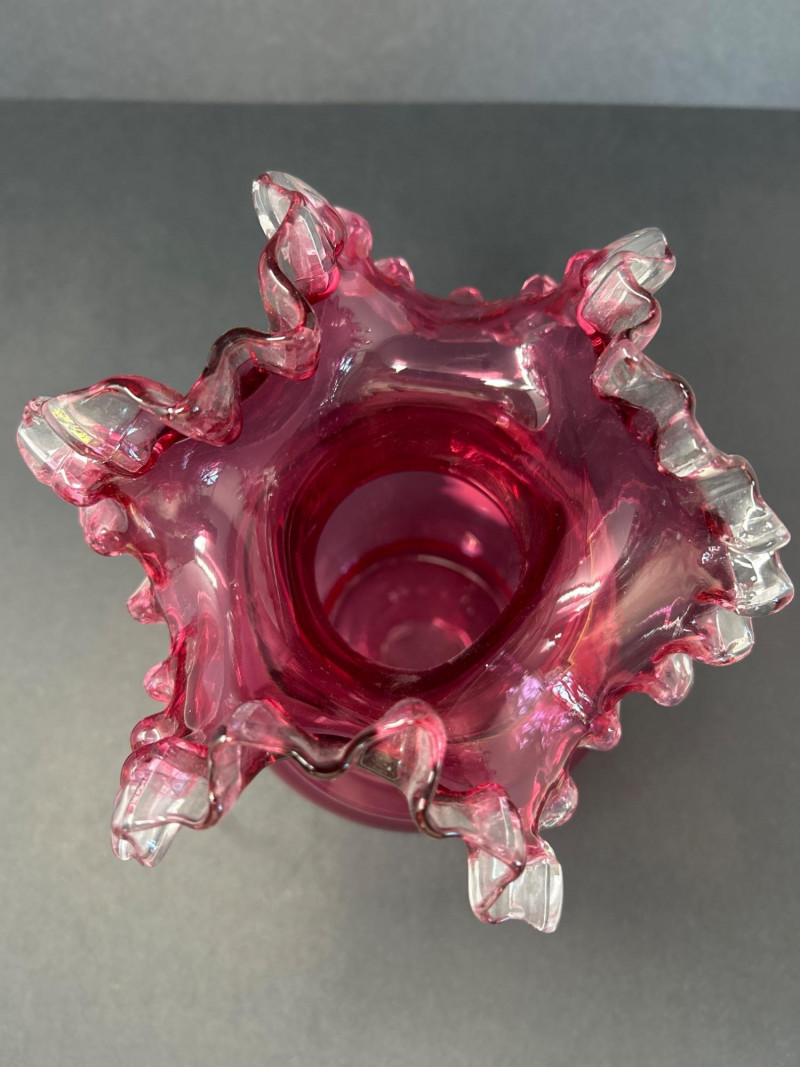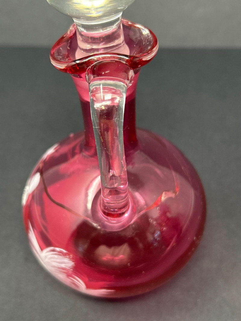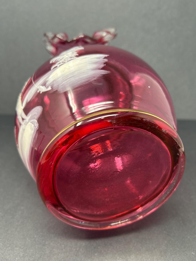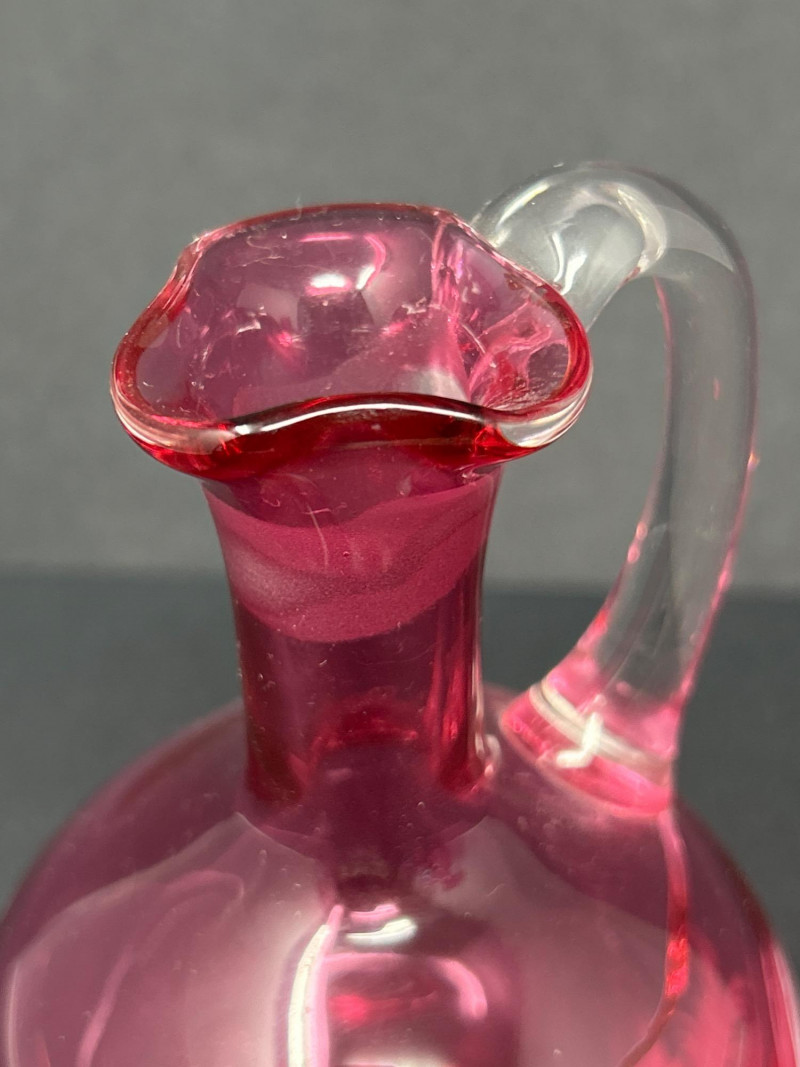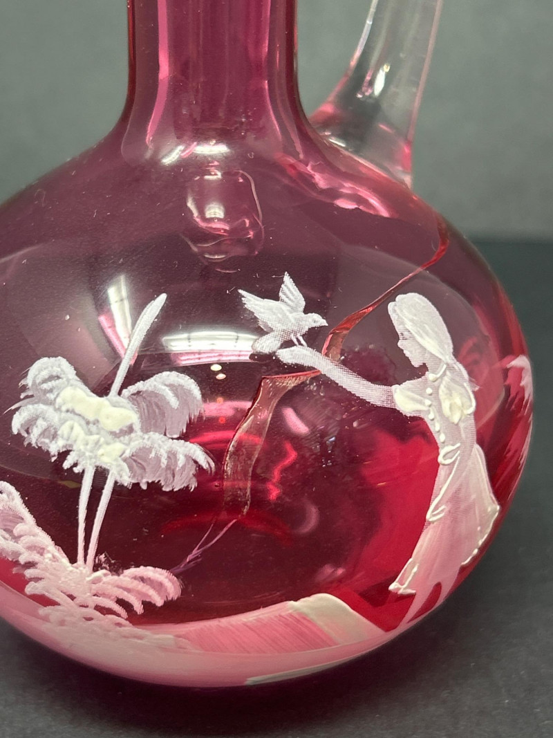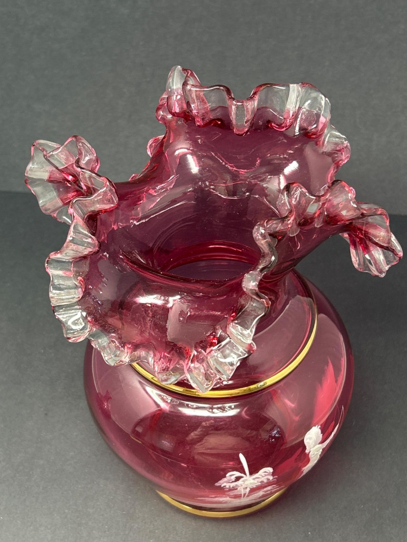 Fenton Cranberry Mary Gregory SetA charming duet of Victorian-inspired glassware, this Fenton set showcases the artistry of Mary Gregory enamel work in rich cranberry tones: Cruet –A petite pitcher with a clear glass stopper, featuring a hand-painted child releasing a bird amid delicate foliage. The spherical body and ornate handle evoke turn-of-the-century whimsy. Plese note-Cruet has a hairline crack on the inside of the base of the piece. Vase –A larger companion piece with a wide, ruffled rim and gold accents. The enamel scene depicts a child fishing, framed by lush white brushwork and graceful curves Cruet with Stopper: Height (including stopper): ~6.5" Width (at widest point): ~3.5" Ruffled Vase: Height: ~10" Diameter (at widest point): ~6.5" Rim Diameter: ~4.25"